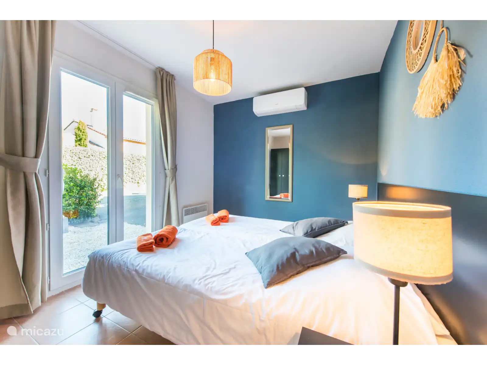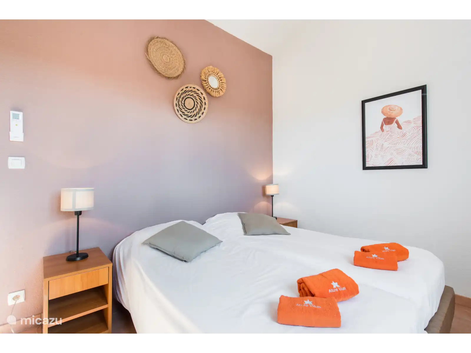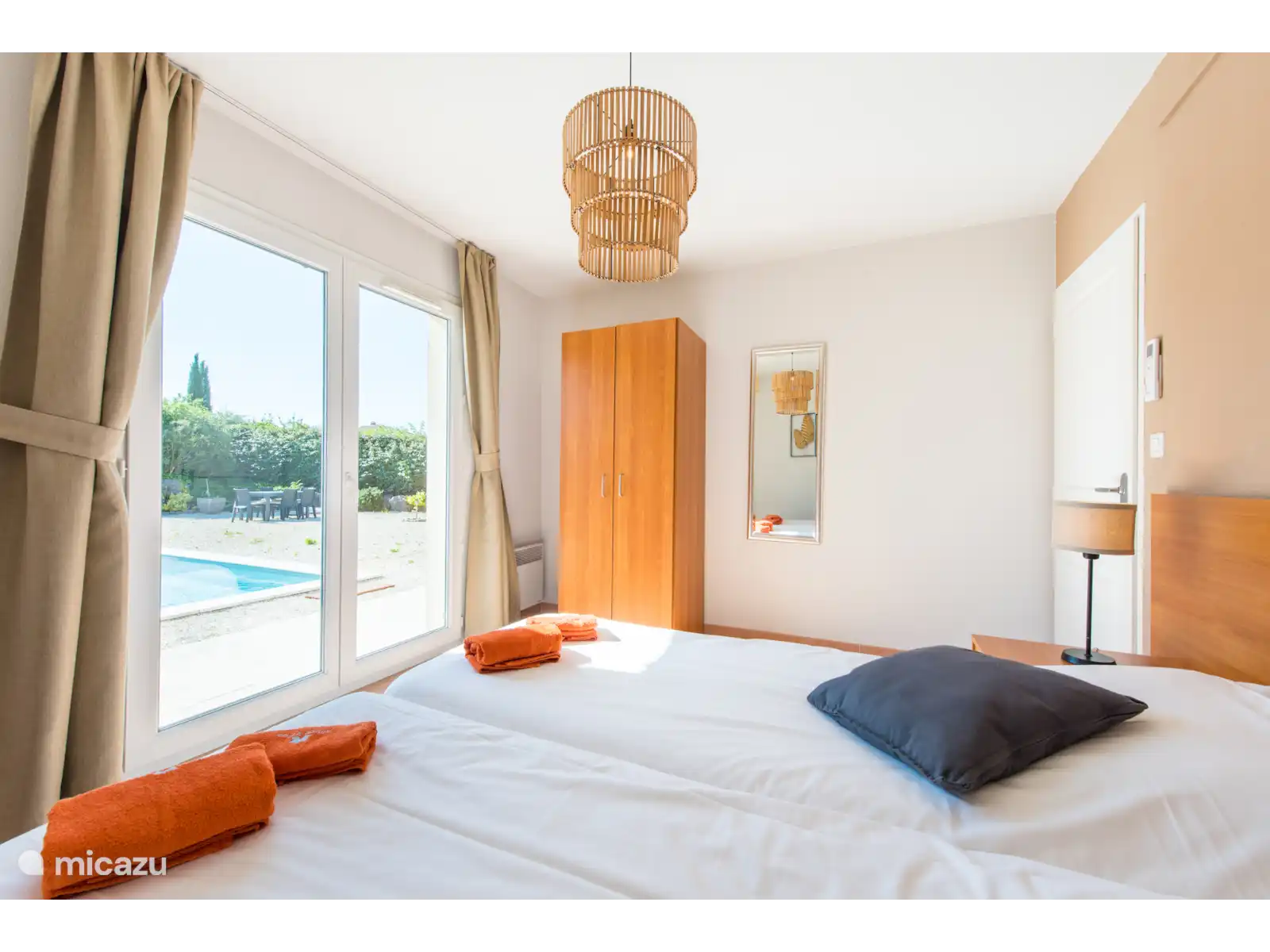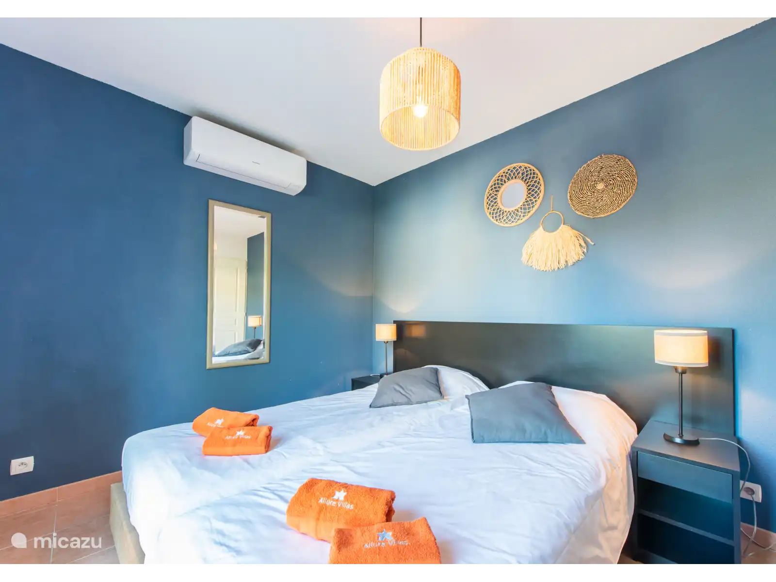 des chambres pour deux personnes (les lits peuvent être poussés écartés) avec climatisation et deux salles de bains, l’une avec baignoire et douche et l’autre avec douche. Les lits sont faits à l’arrivée. Il y a une chambre supplémentaire au premier étage avec un lit simple.