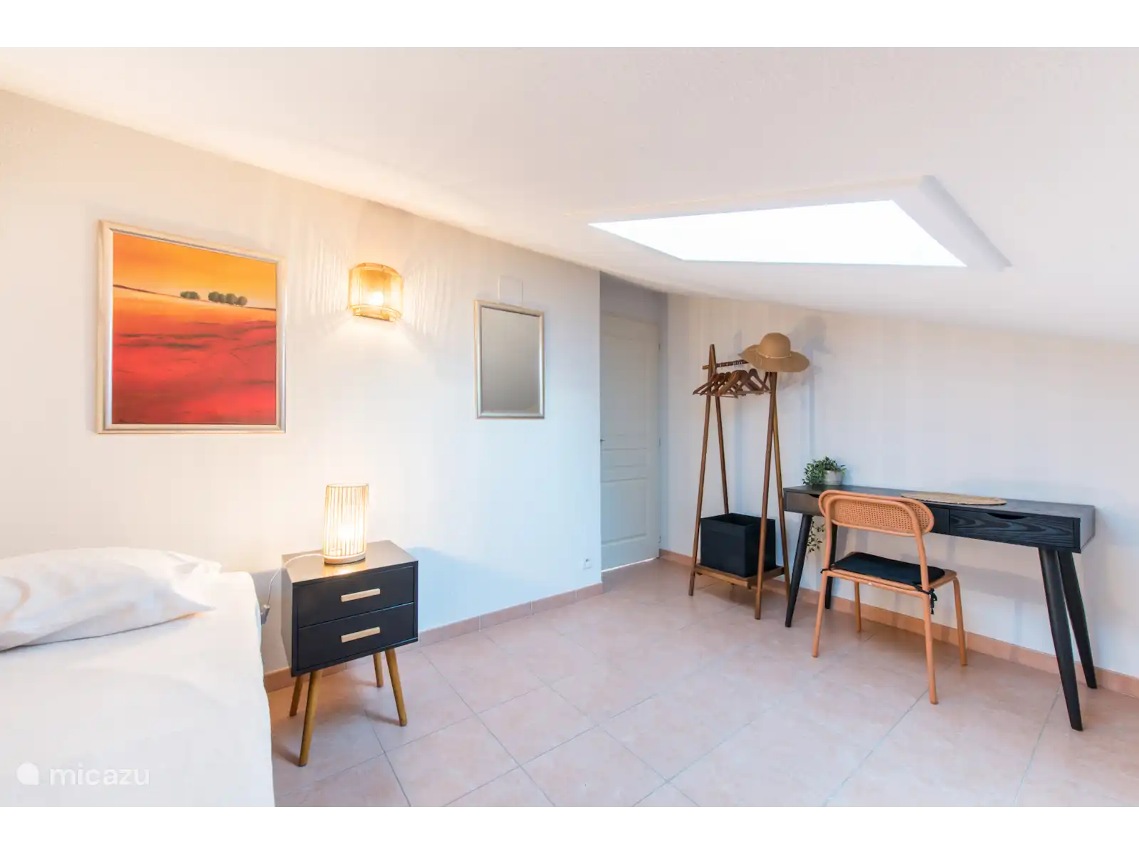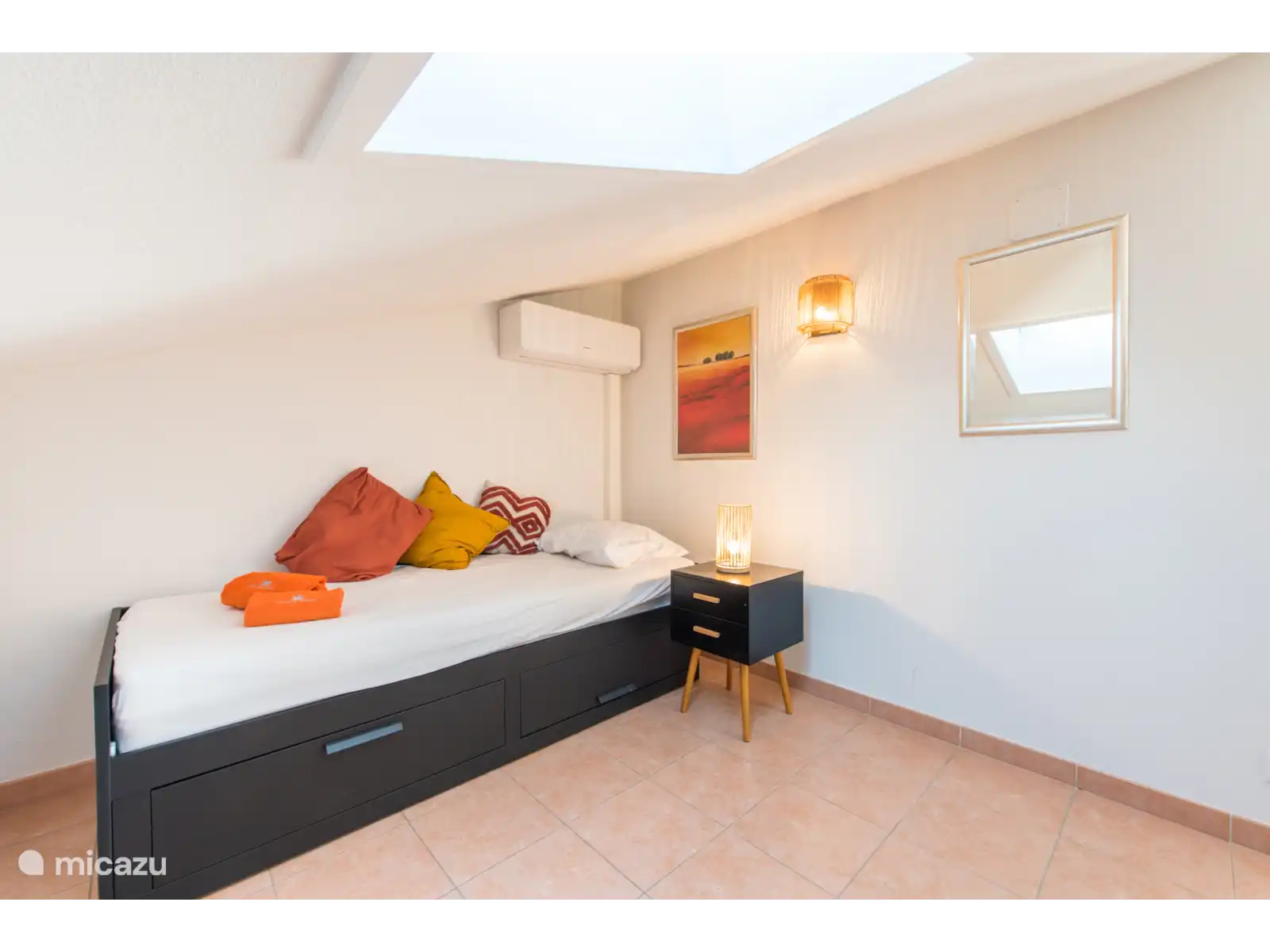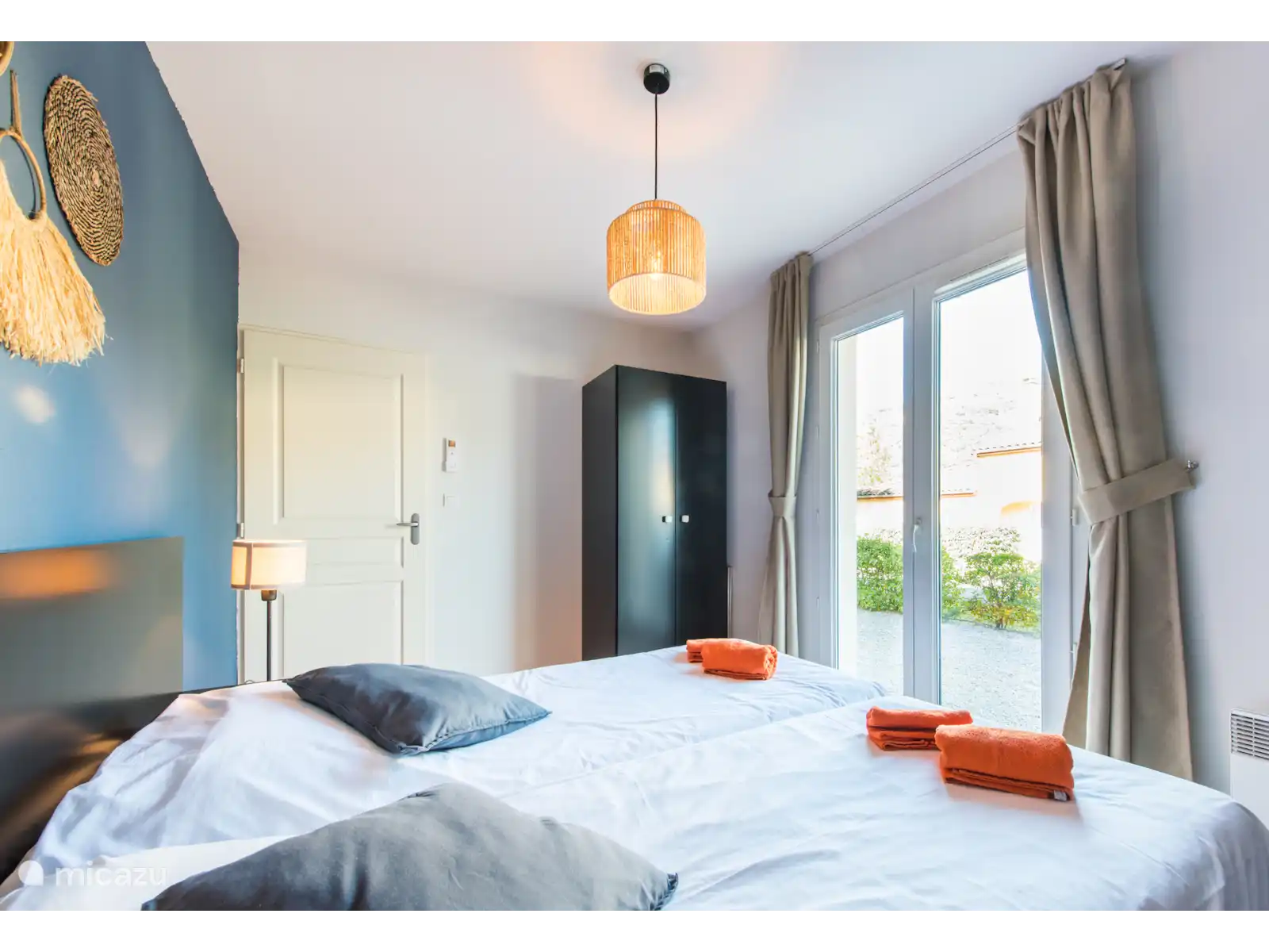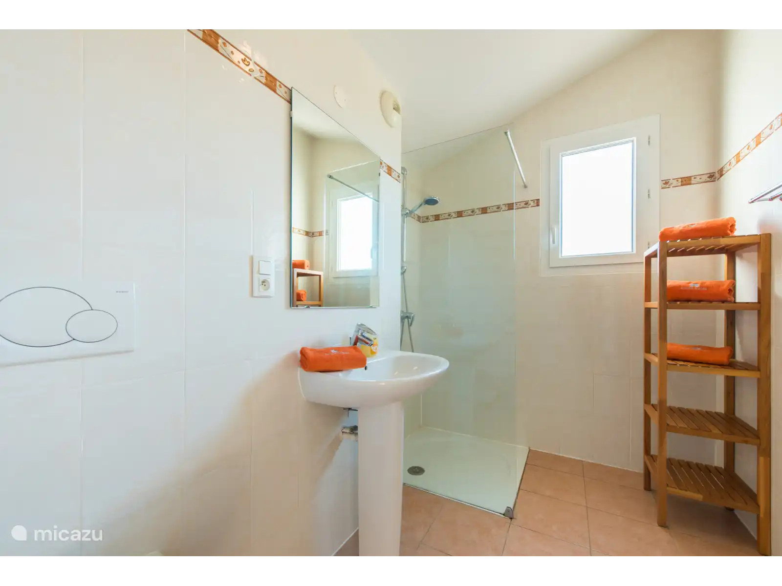 des chambres pour deux personnes (les lits peuvent être poussés écartés) avec climatisation et deux salles de bains, l’une avec baignoire et douche et l’autre avec douche. Les lits sont faits à l’arrivée. Il y a une chambre supplémentaire au premier étage avec un lit simple.