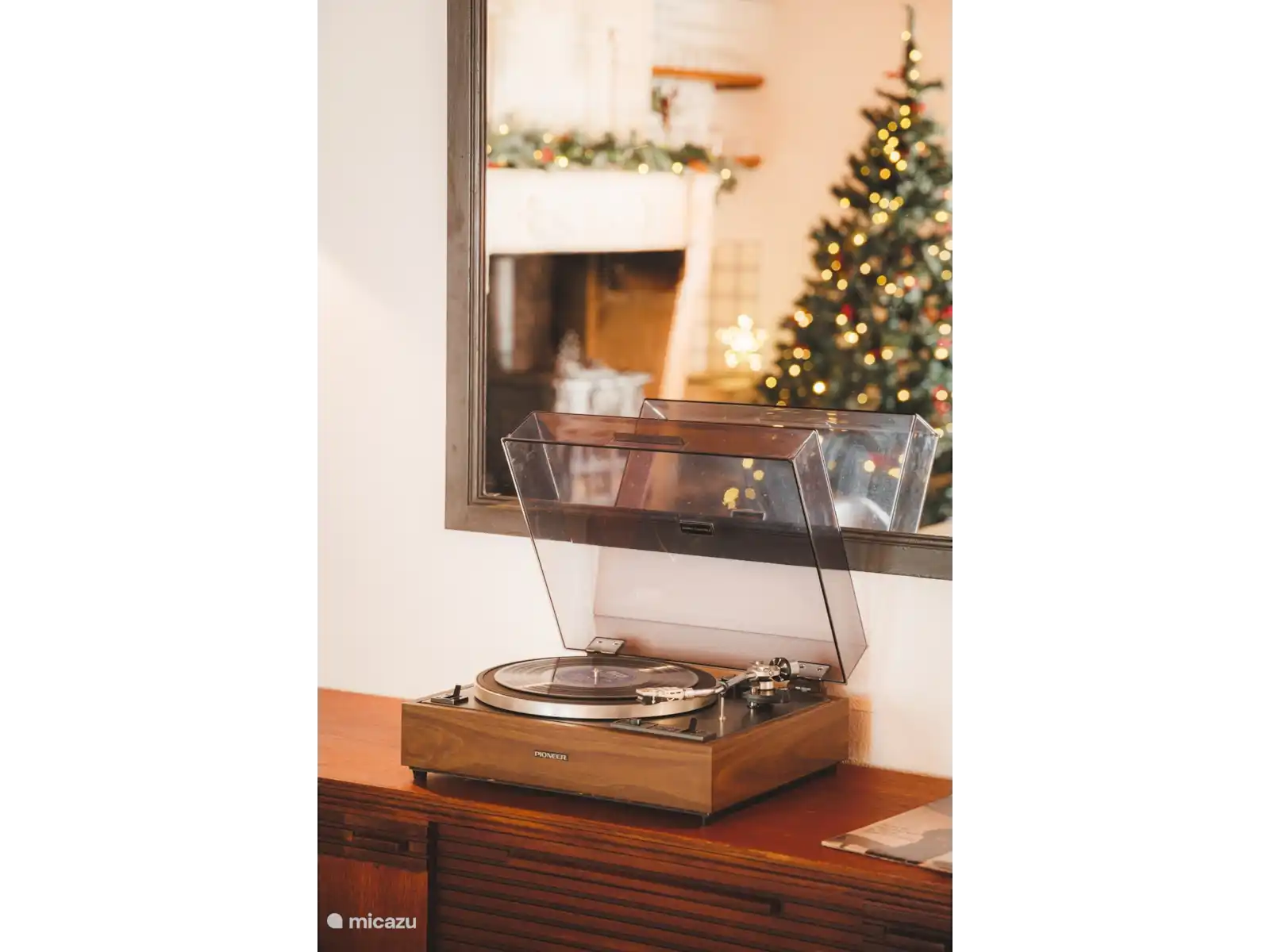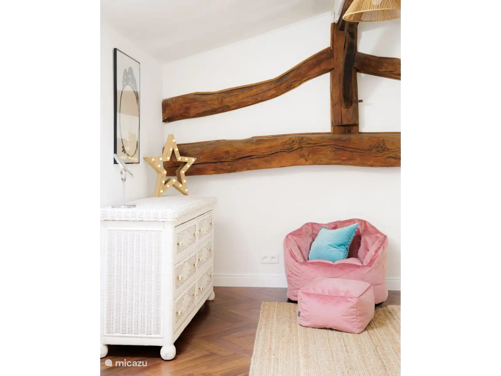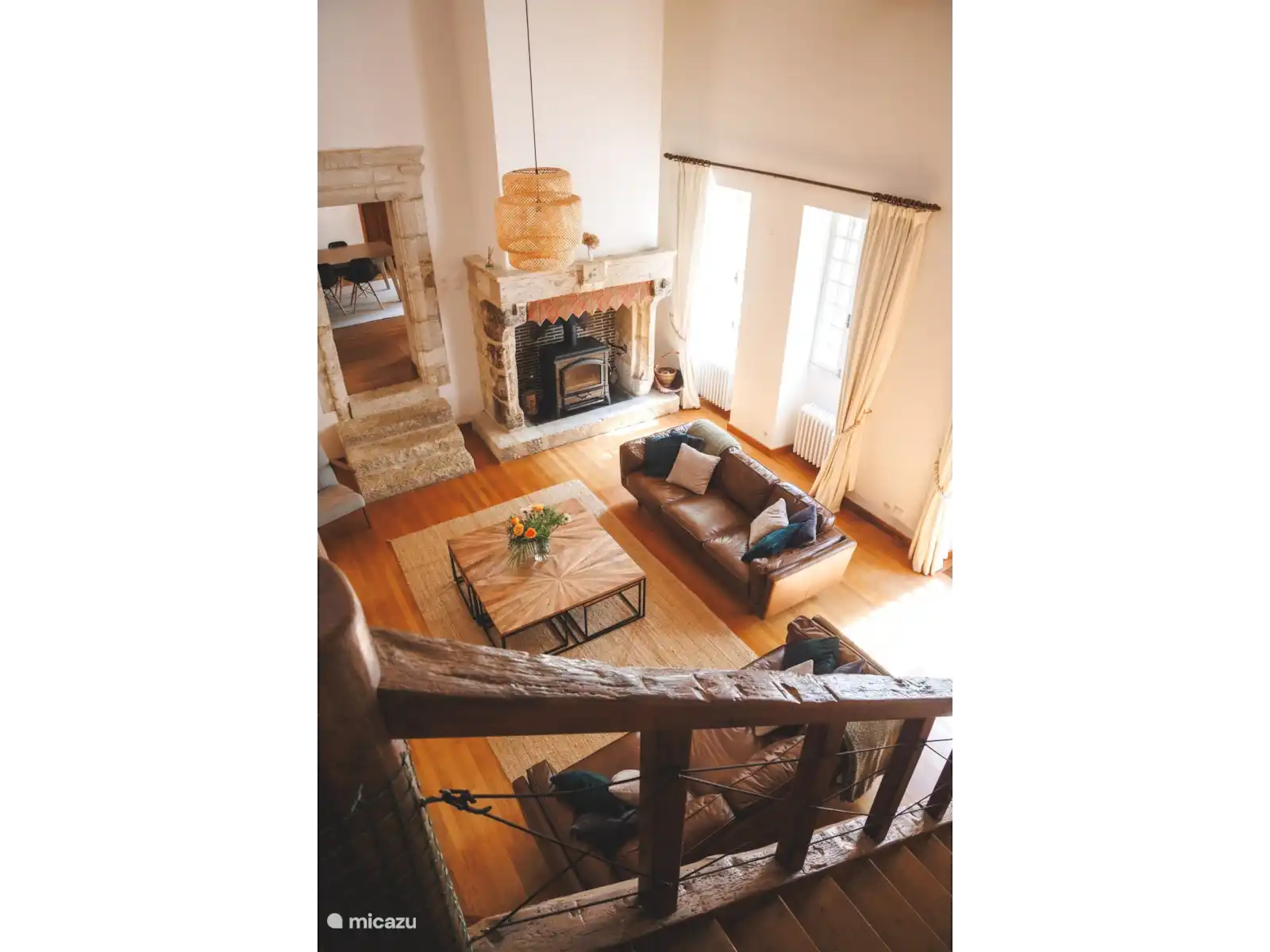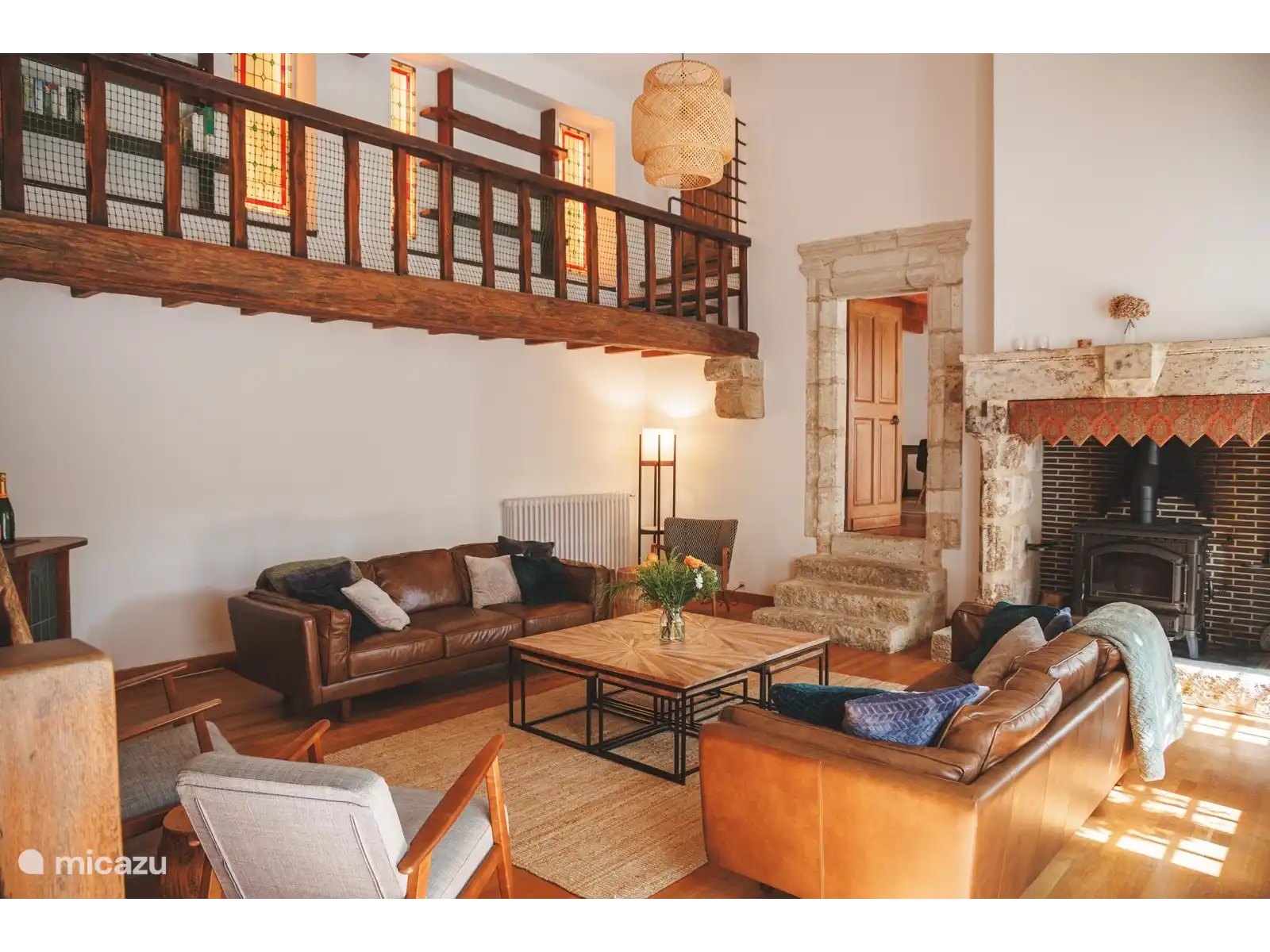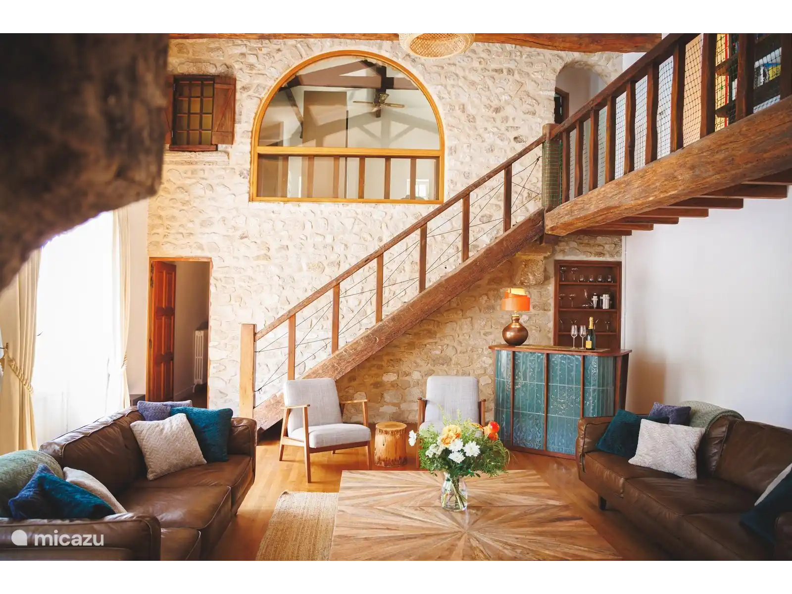 Le salon a de hauts plafonds avec d’énormes poutres en chêne apparentes, une immense cheminée, un mur de cinéma maison et un petit bar avec des poufs et des portes-fenêtres menant au jardin avant. Un escalier en chêne massif mène au balcon de la mezzanine qui donne accès à la salle de la galerie et aux chambres des enfants.