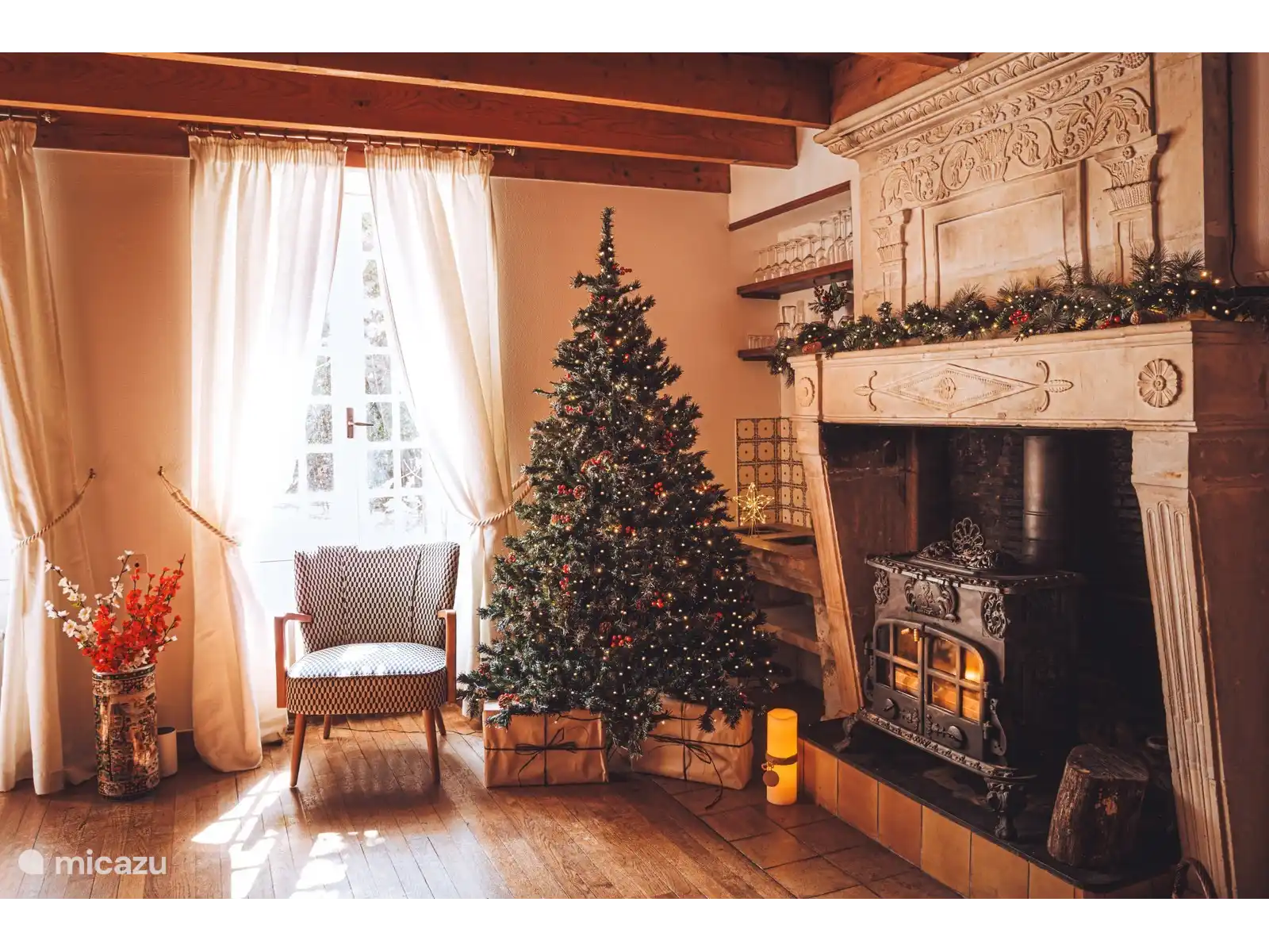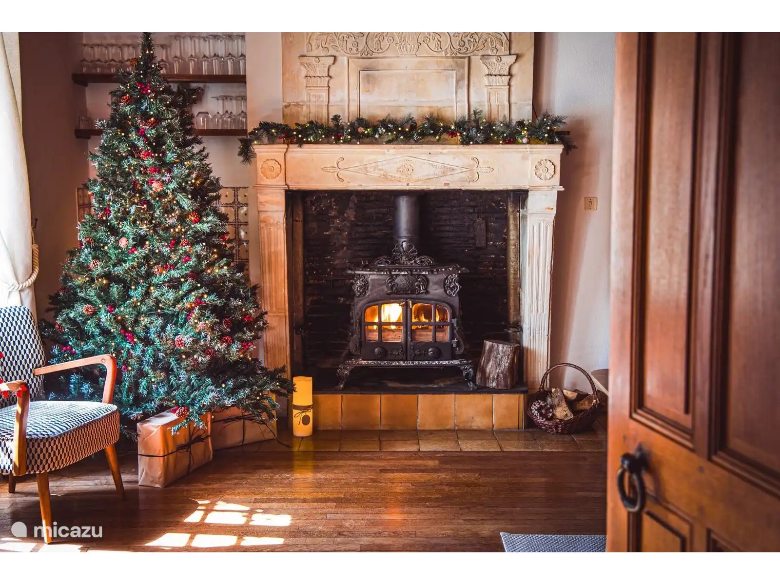 Sièges confortables pour 10 personnes à côté d’un poêle à bois.