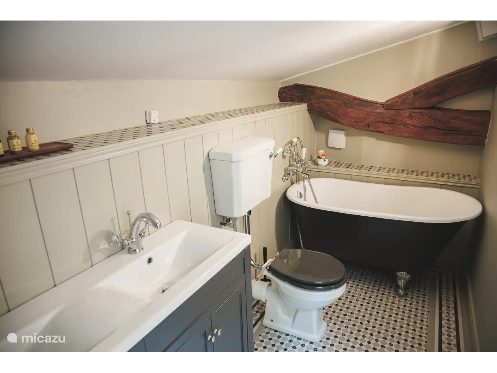 La 'Gallery Room' (1er étage) - Super King, cabine de douche ouverte et double lavabo avec toilettes fermées. Poutres apparentes avec balcons privés donnant sur la terrasse supérieure.