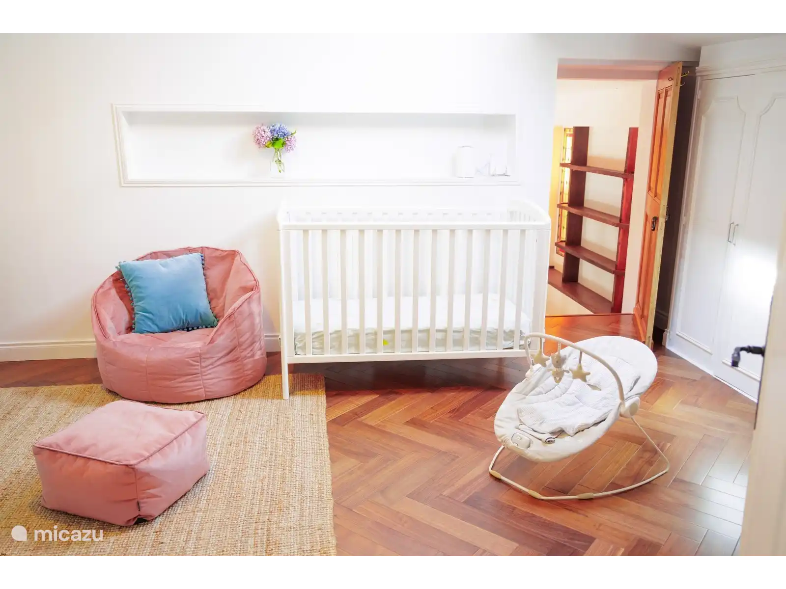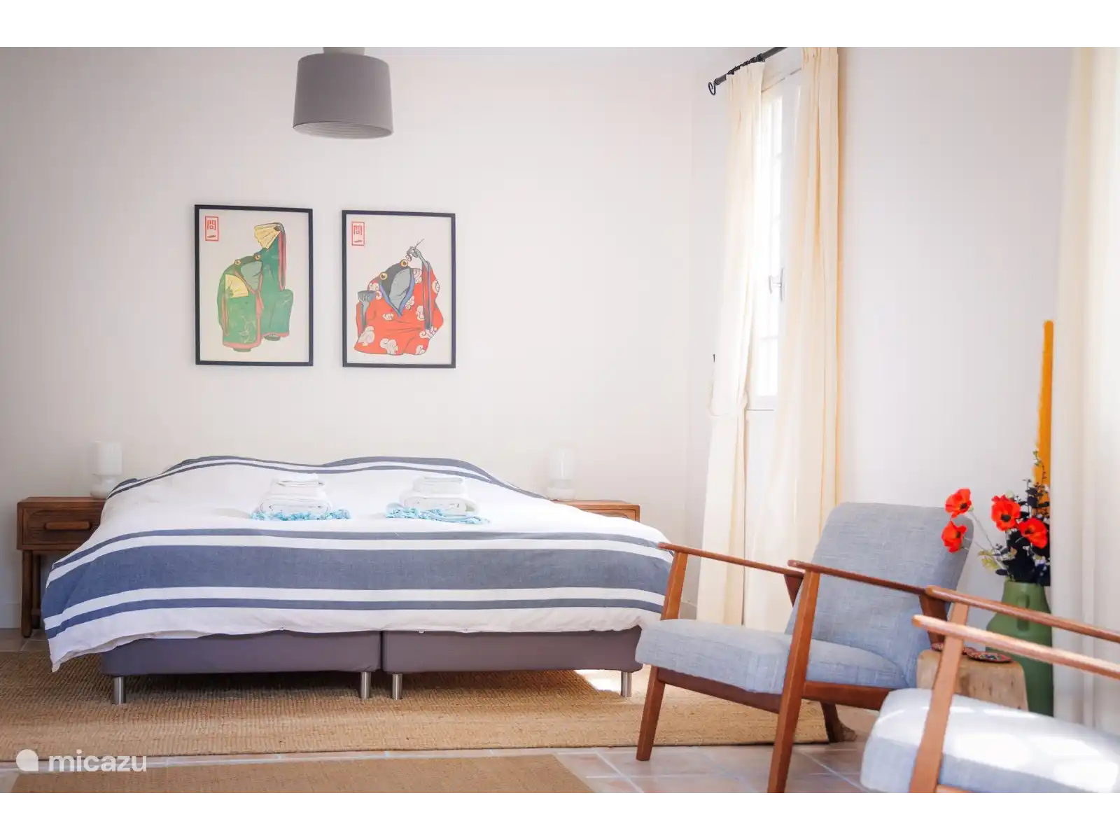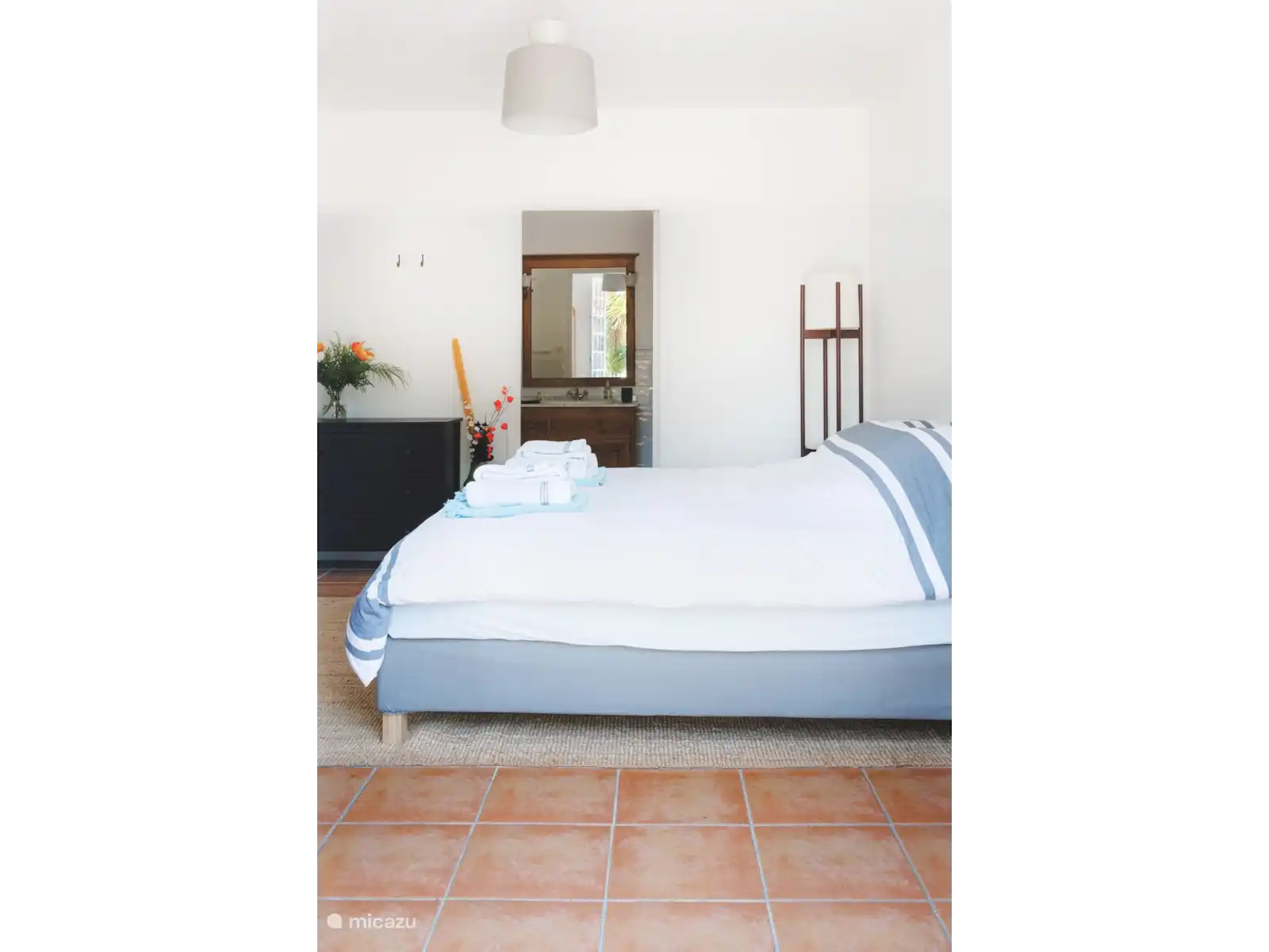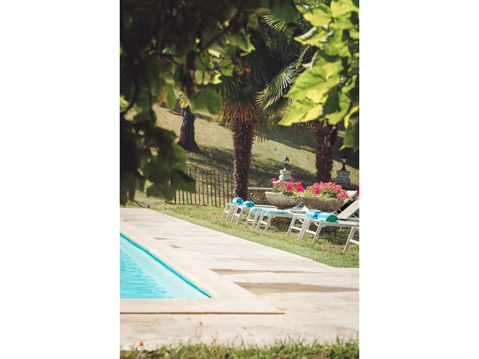 Des chaises longues sur la terrasse inférieure offrent une vue imprenable sur la petite vallée jusqu’à la piscine et d’énormes poufs fournissent de l’ombre sous les pins.