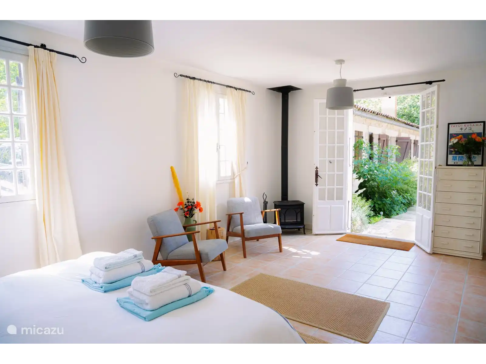 La 'Rose Room' - Chambre Super King/Twin avec douche et toilettes attenantes et poêle à bois. Portes-fenêtres donnant sur la cour.