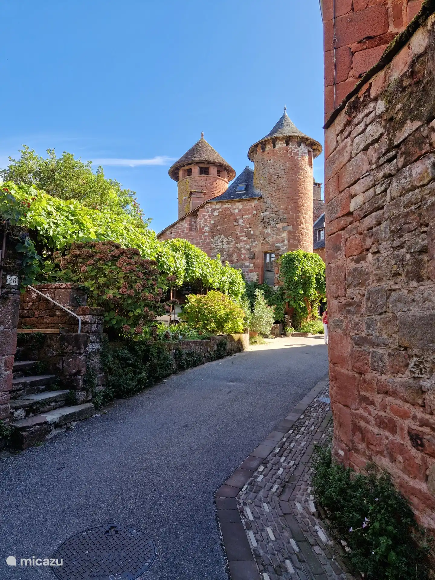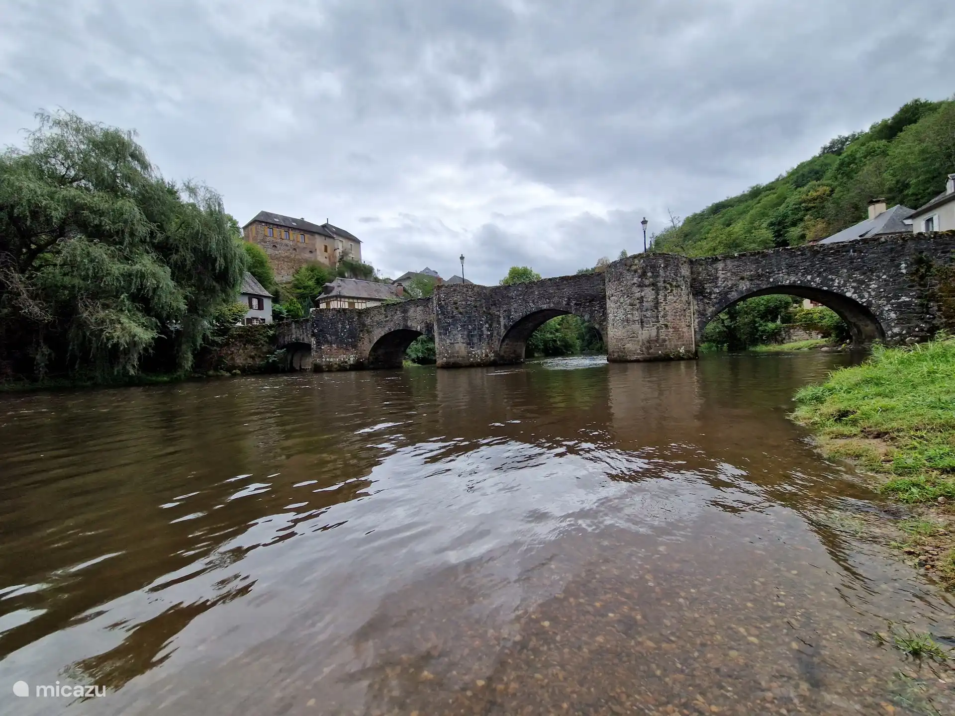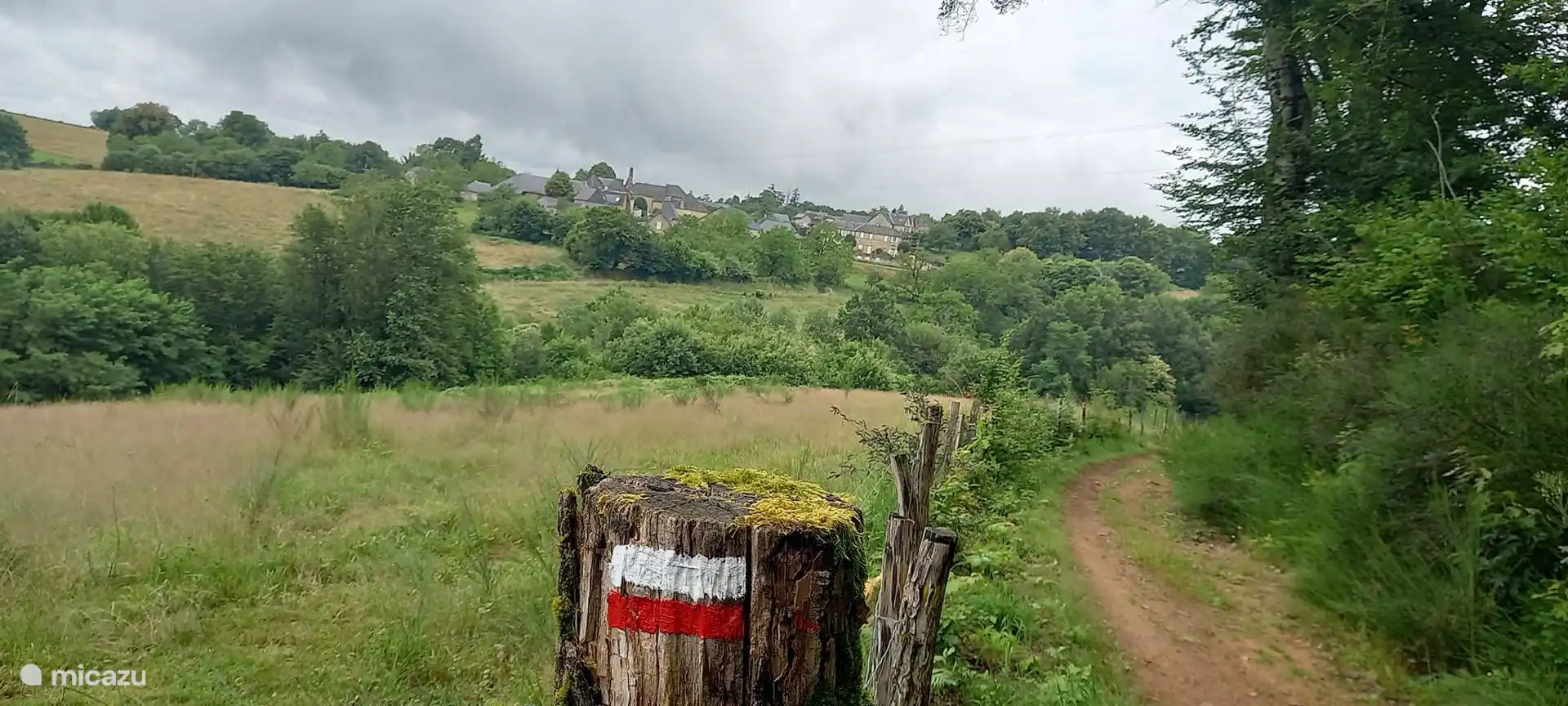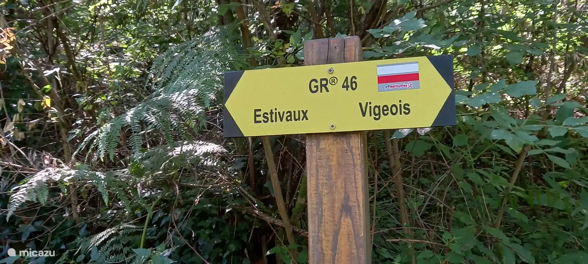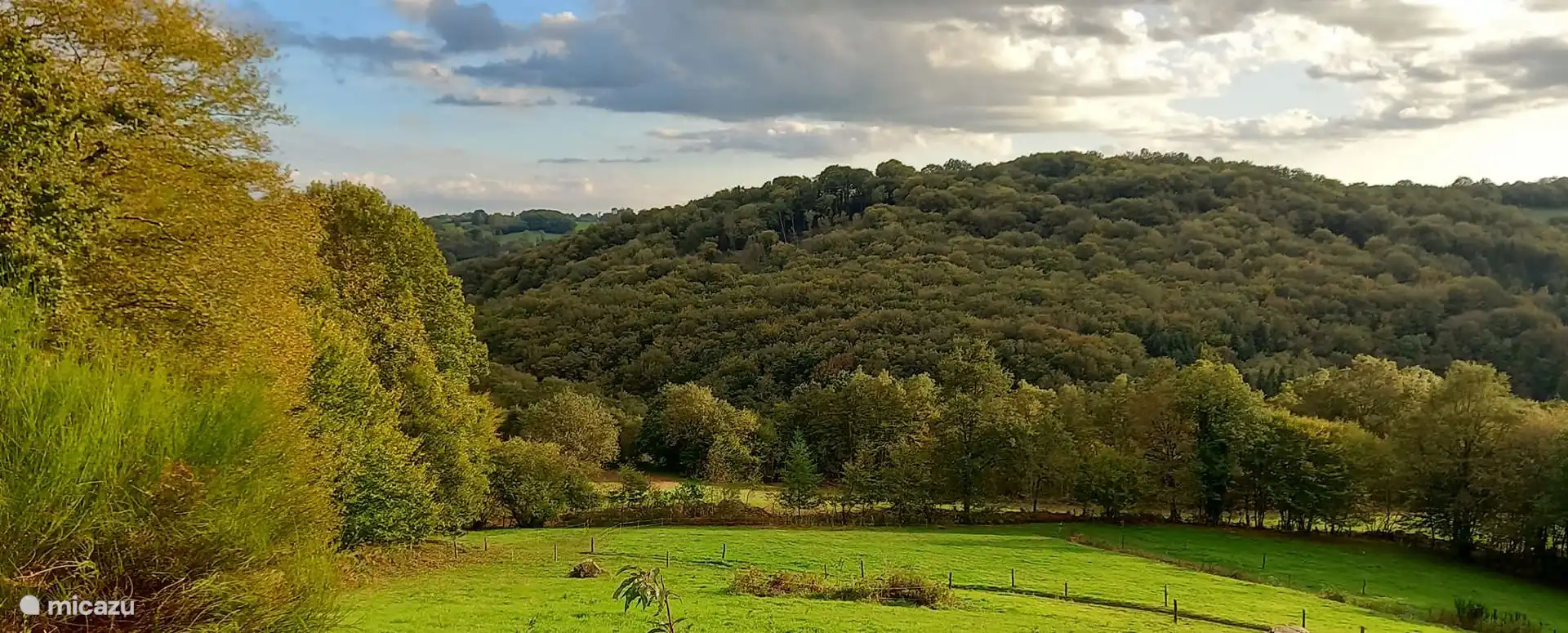 Une marche descendante mène à la terrasse privée couverte, à l’arrière de la gîte, offrant une belle vue sur la vallée.