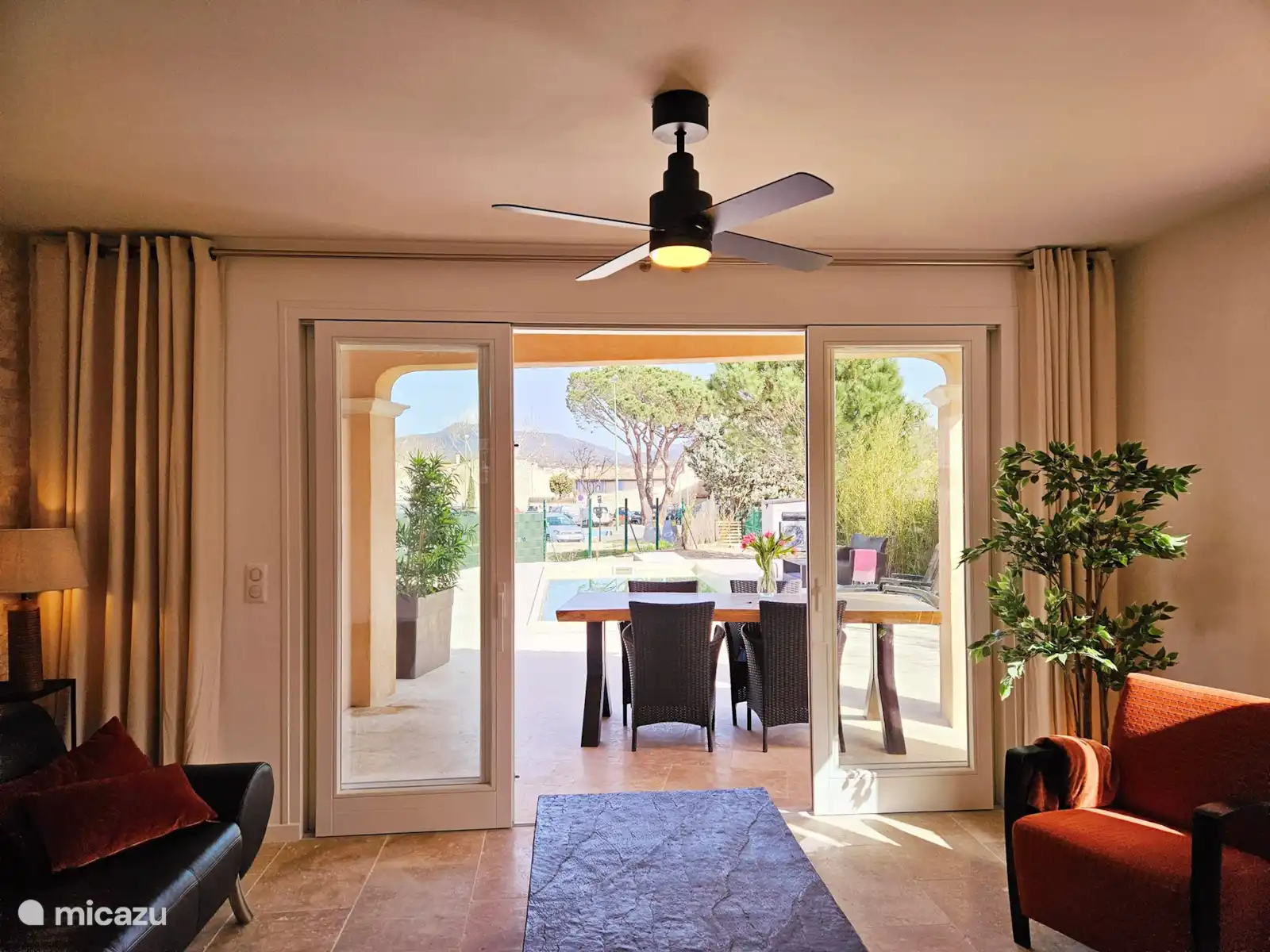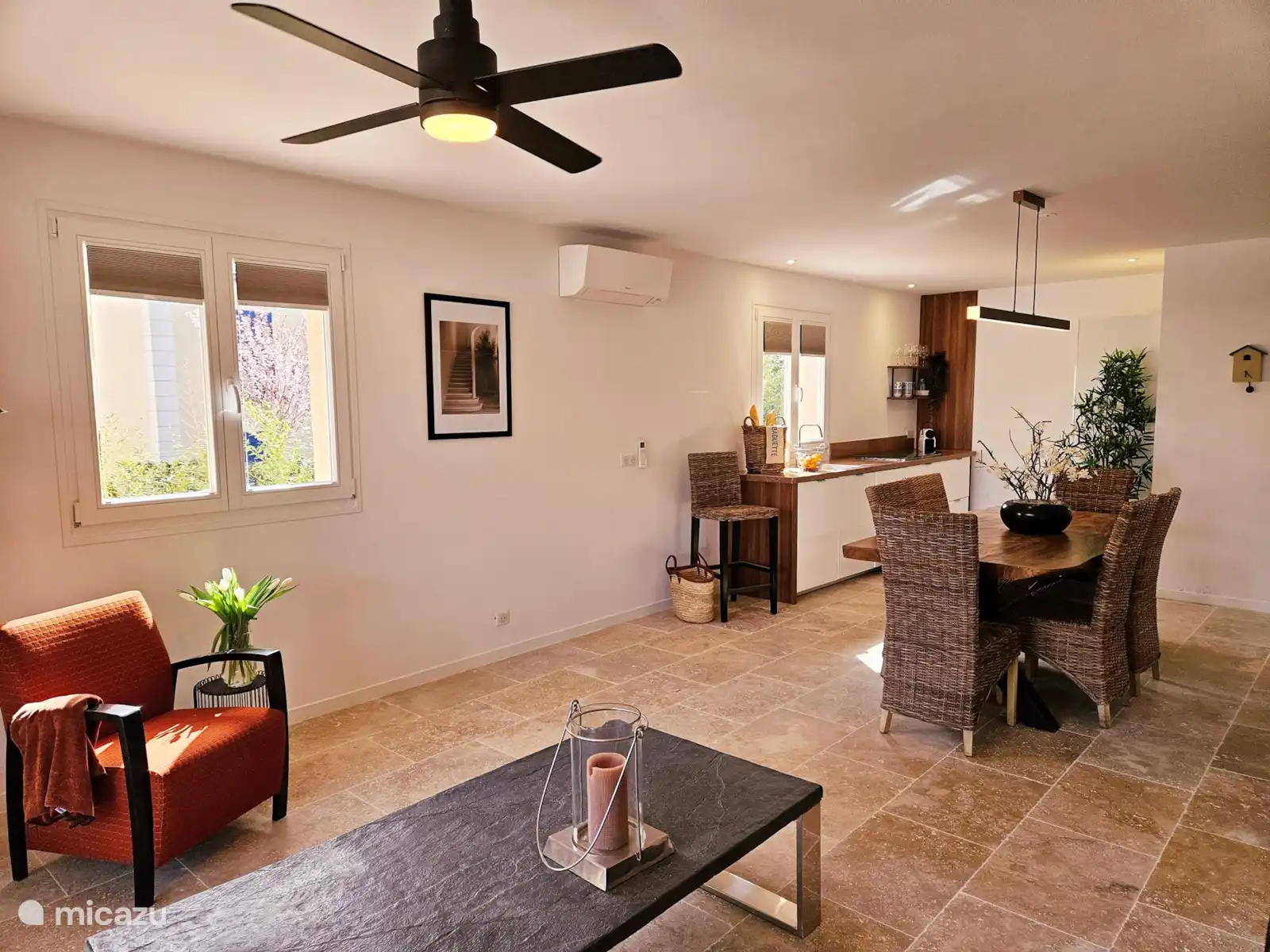- Séjour cosy avec coin salon et vue sur la piscine, cuisine ouverte équipée toutes commodités. Télévision connectée disponible.