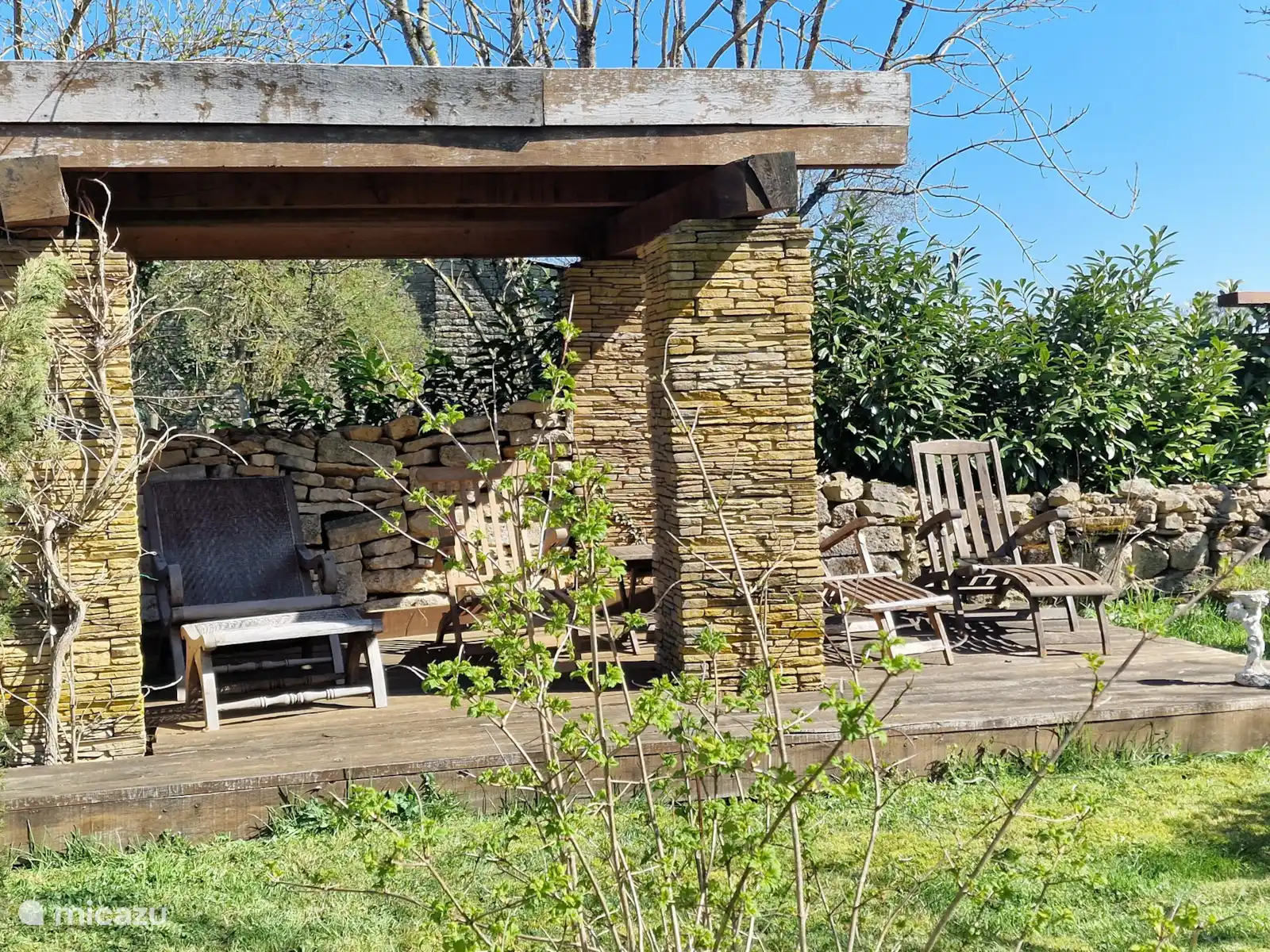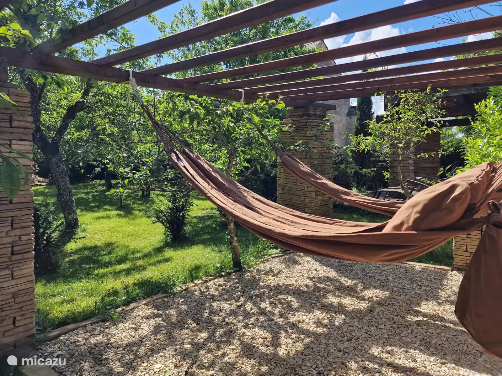 Le jardin est très accueillant avec des vues idylliques et le bel auvent (terrasse couverte) avec cheminée est également un endroit merveilleux pour séjourner les jours plus frais. Il y a plusieurs coins salon et terrasses dans tous les coins du jardin avec un certain nombre de hamacs et de chaises longues. C’est un jardin où l’on se détend naturellement . Les arbres fruitiers fournissent beaucoup de fruits qui peuvent être cueillis librement. Surtout, faites-le !