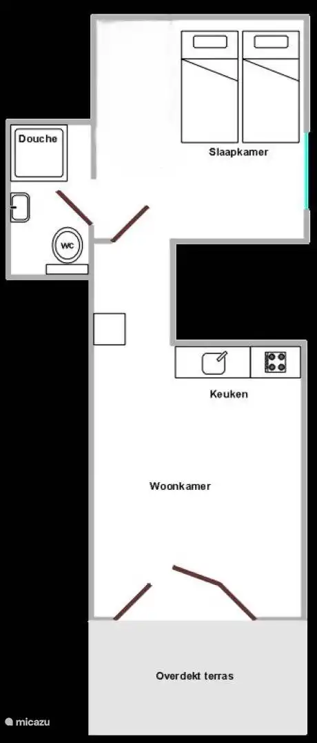 L’appartement De Bosuil a une superficie de 42 m2 et dispose d’une terrasse couverte avec un siège : une grande table de pique-et quelques chaises en bois. De la terrasse, vous avez une vue sur la piscine et le jardin.