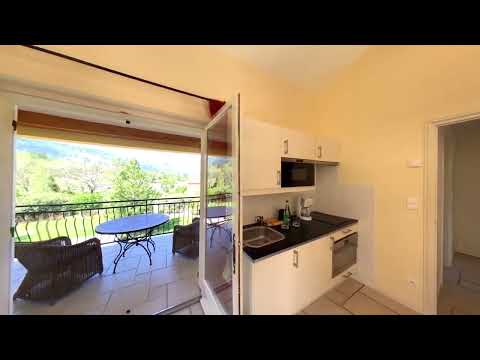 Séjour ensoleillé confortablement meublé avec TV satellite, kitchenette, hotte aspirante, réfrigérateur, micro-ondes, cafetière, plaques électriques.