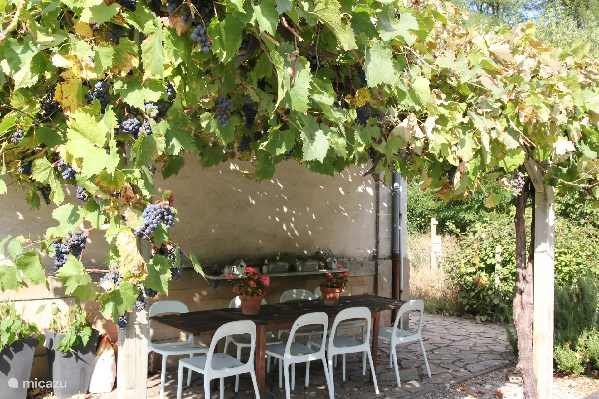 - Terrasse avec table à manger extérieure et chaises sous la pergola avec des vignes