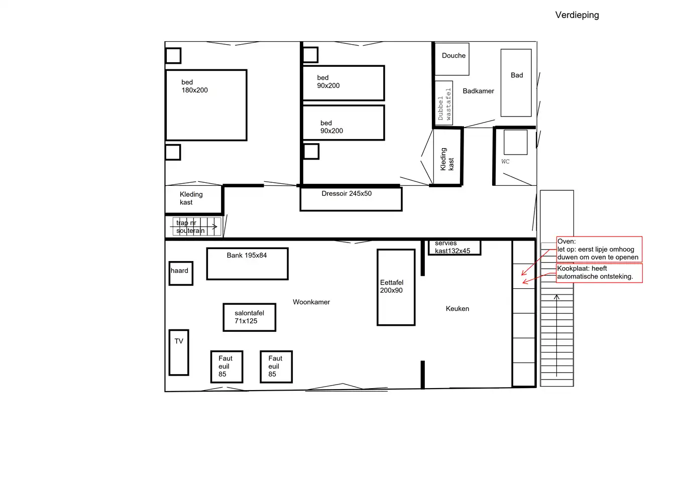 La maison dispose de 3 chambres. Au premier étage se trouvent le salon, la cuisine, le bain/douche/double lavabo, les toilettes et 2 chambres. Les chambres au premier étage se composent d'une chambre avec un lit bébé (1,80 x 2,00 m) et d'une chambre avec deux lits bébé (0,9 x 2,00 m).
