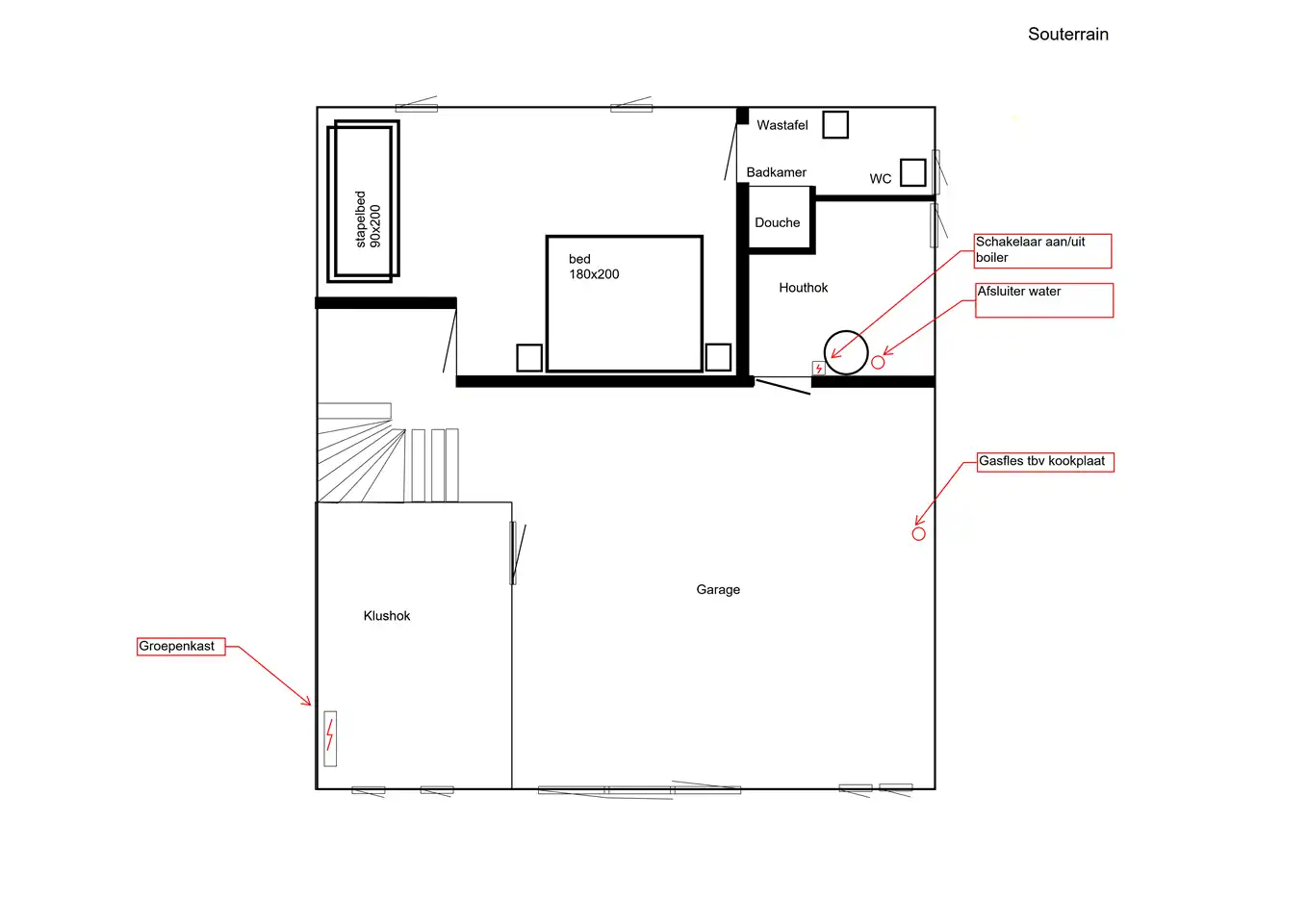 Au rez-de-chaussée se trouve une chambre pour 4 personnes avec un lit bébé (1,80 x 2,00 m) et un lit superposé (2 x 0,9 x 2,00 m). Puis une salle de bain privative avec lavabo, douche et WC.