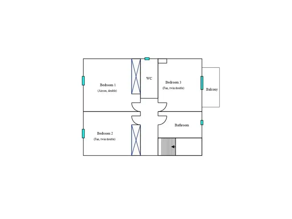 - Troisième chambre avec deux lits simples (90 x 190), ventilateur, meuble de rangement et balcon.