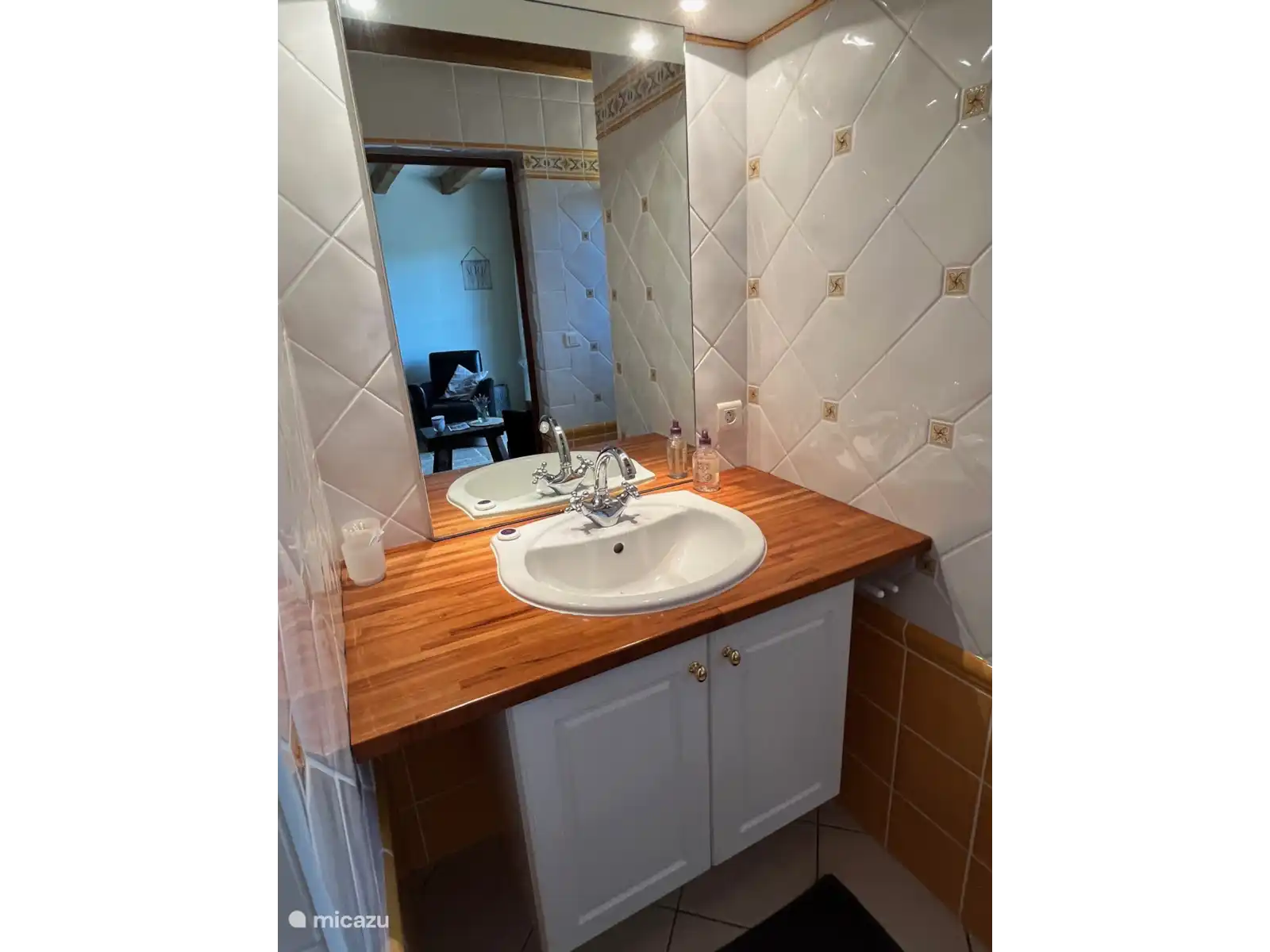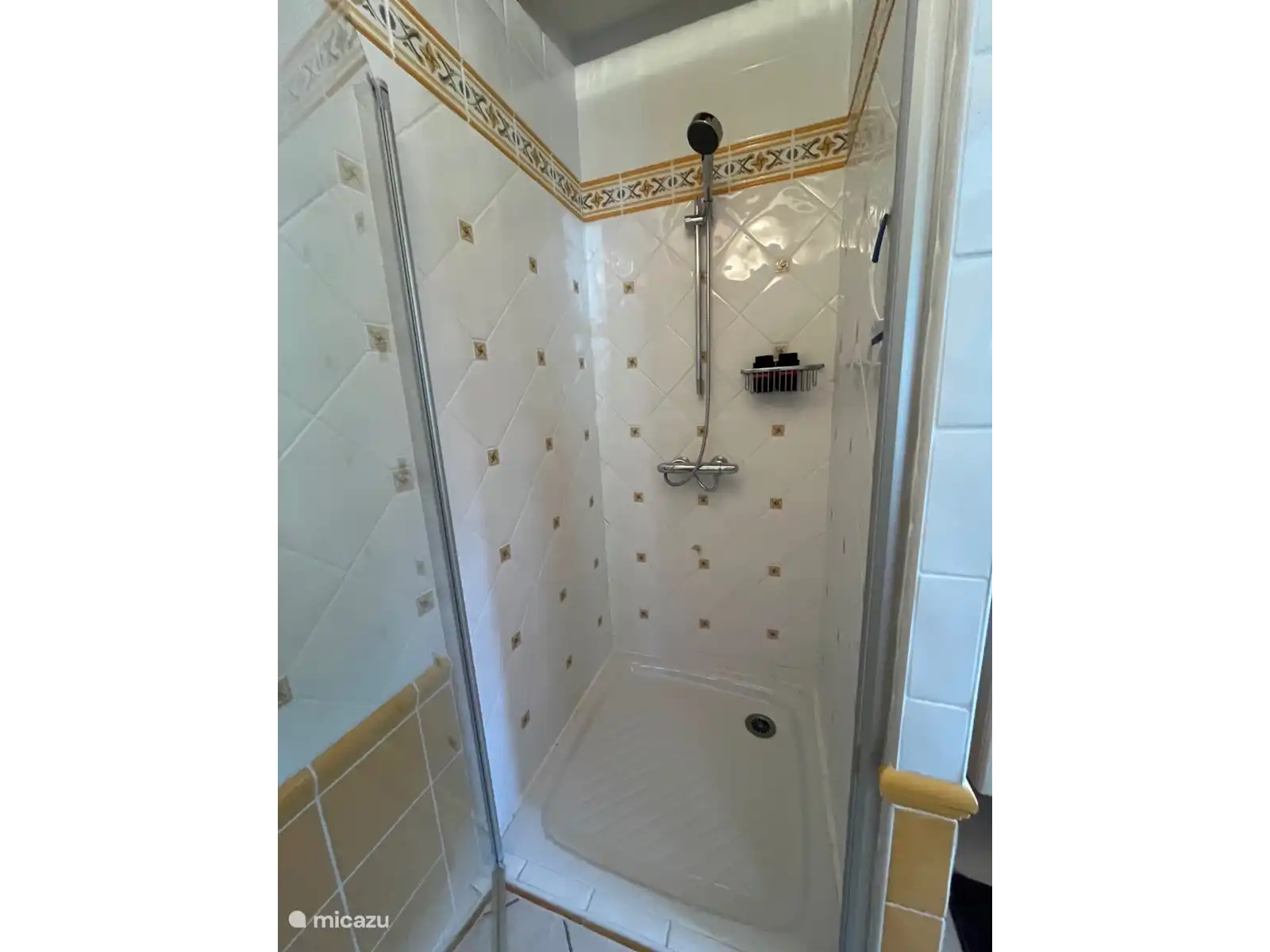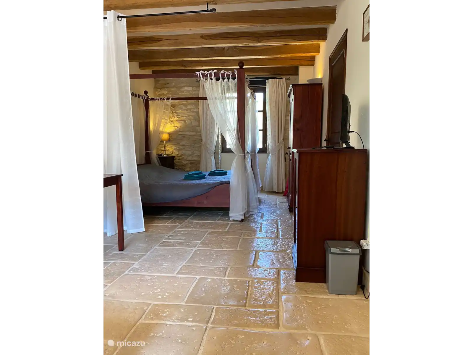 Une chambre spacieuse avec un coin salon équipé de 2 fauteuils, table basse, table à manger. Cafetière/théière, réfrigérateur et télévision. Derrière la cloison un lit double (180*200) avec tables de chevet et une armoire. Il y a aussi 2 peignoirs. De la chambre, vous entrez dans la salle de bain avec douche à l’italienne spacieuse, lavabo et toilettes.