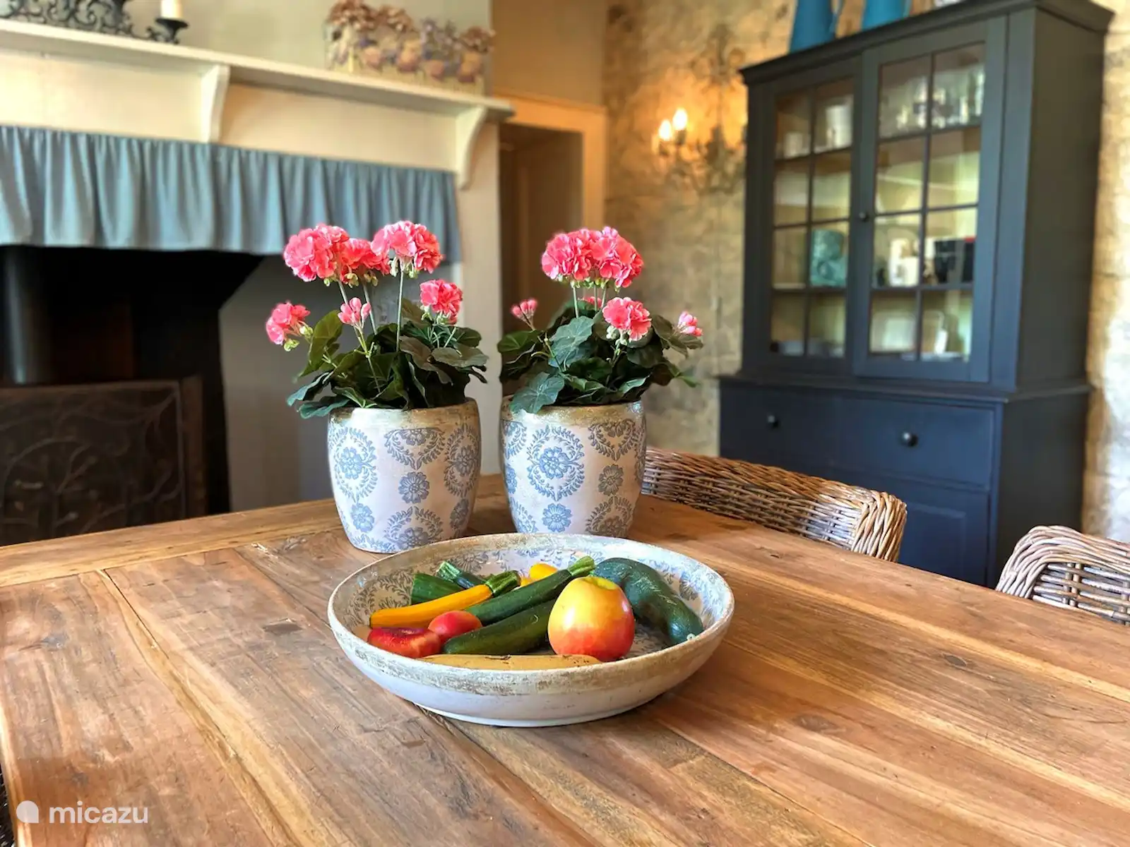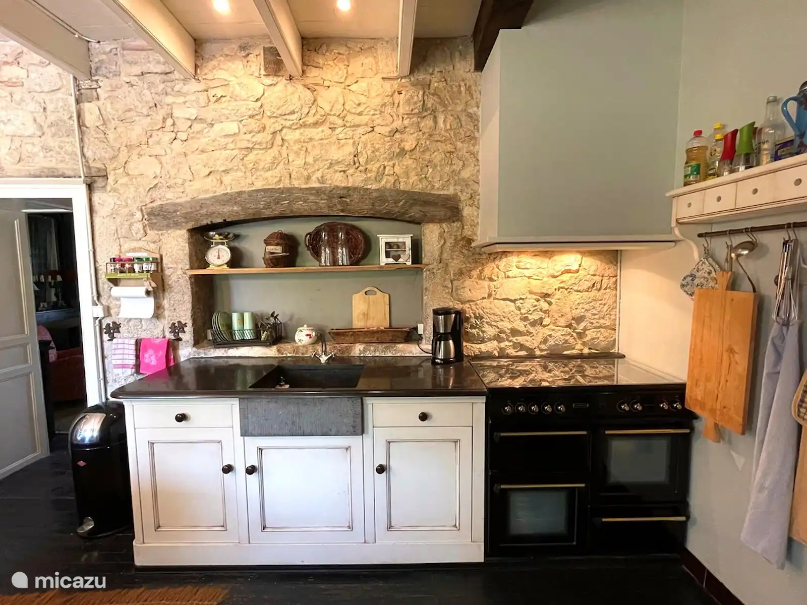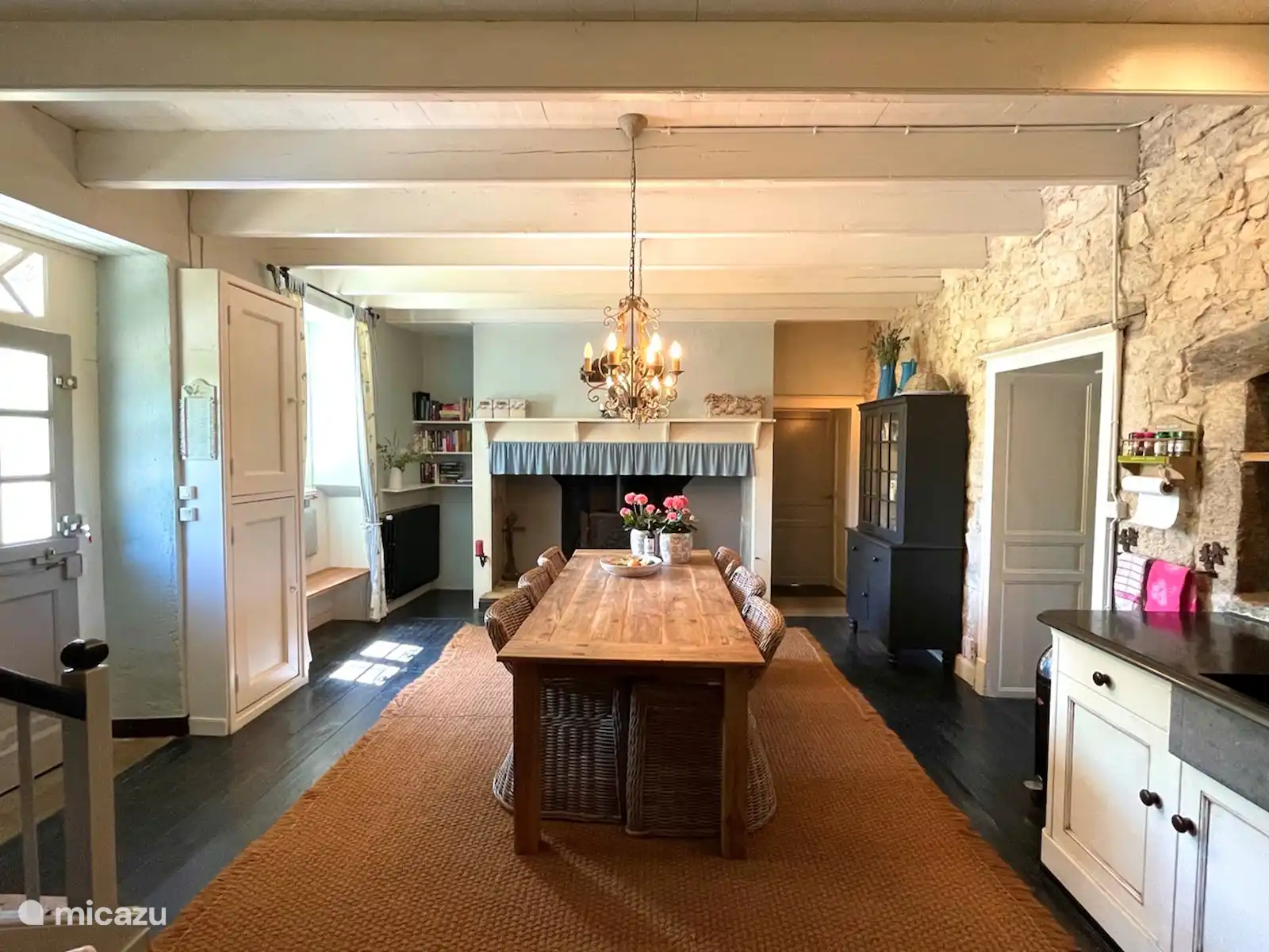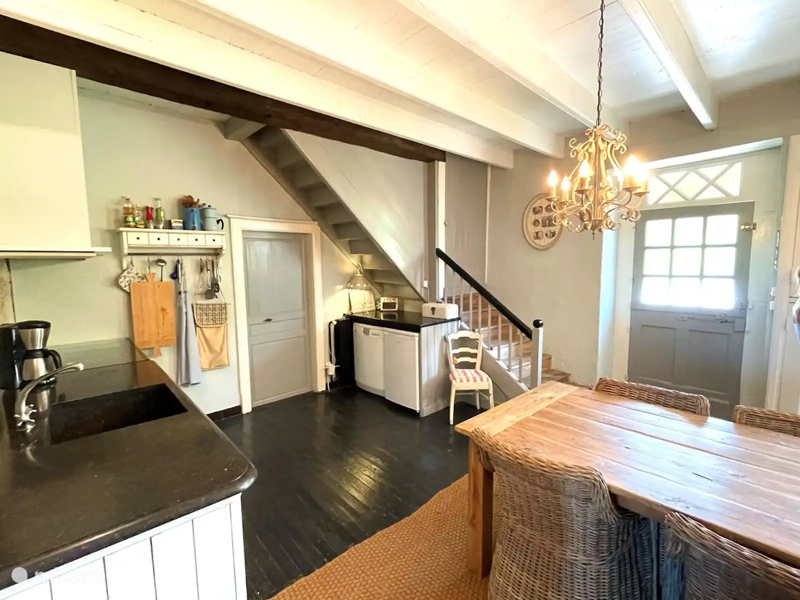 L’imposant escalier ancien à l’avant de la maison vous emmène au boulet d’où vous surplombez les prairies. Par la porte d’entrée, vous entrez dans la cuisine, le cœur de la maison. La cuisine est entièrement équipée et comprend une cuisinière à gaz 5 feux avec 2 fours, un réfrigérateur et un lave-vaisselle.