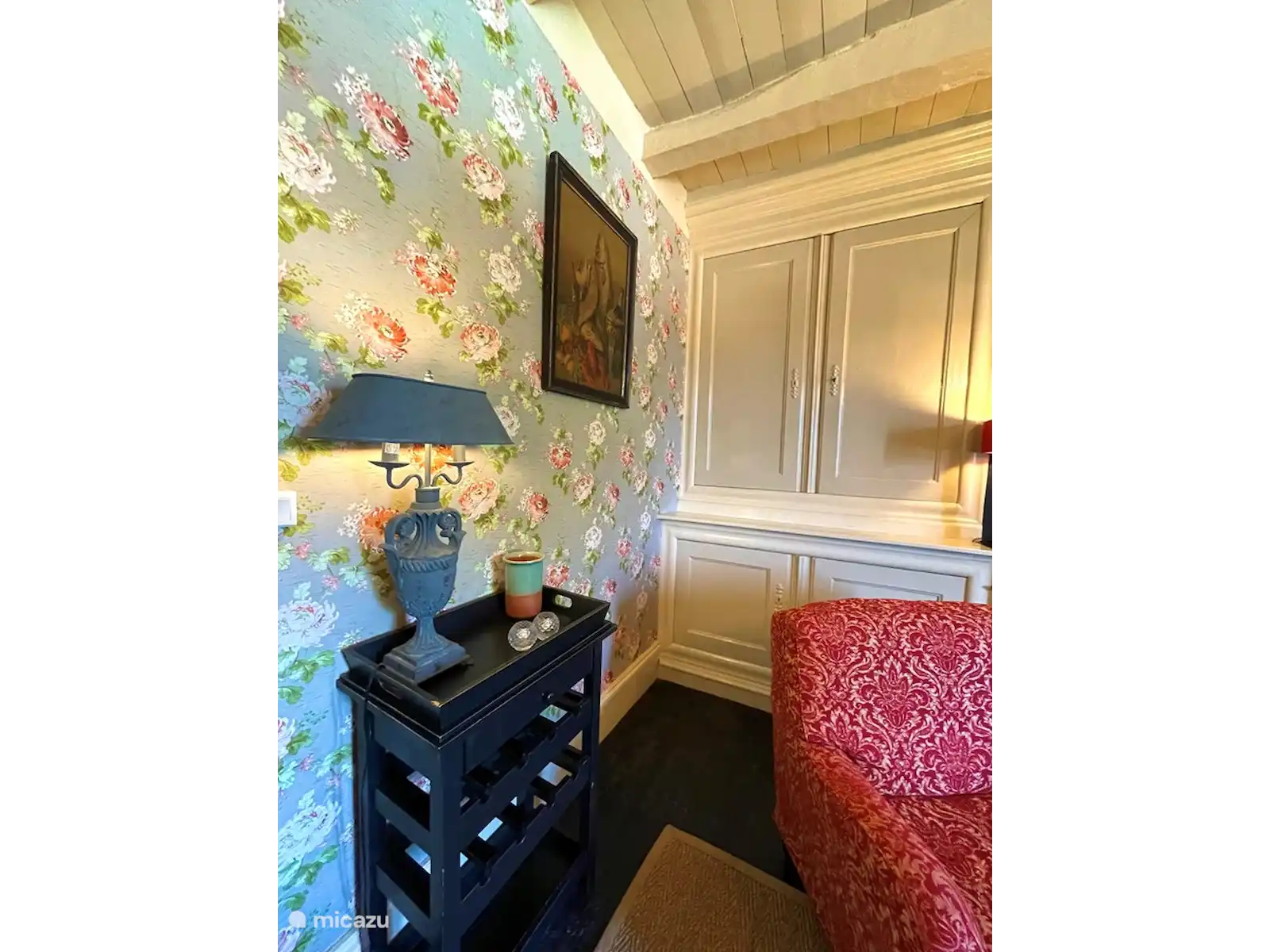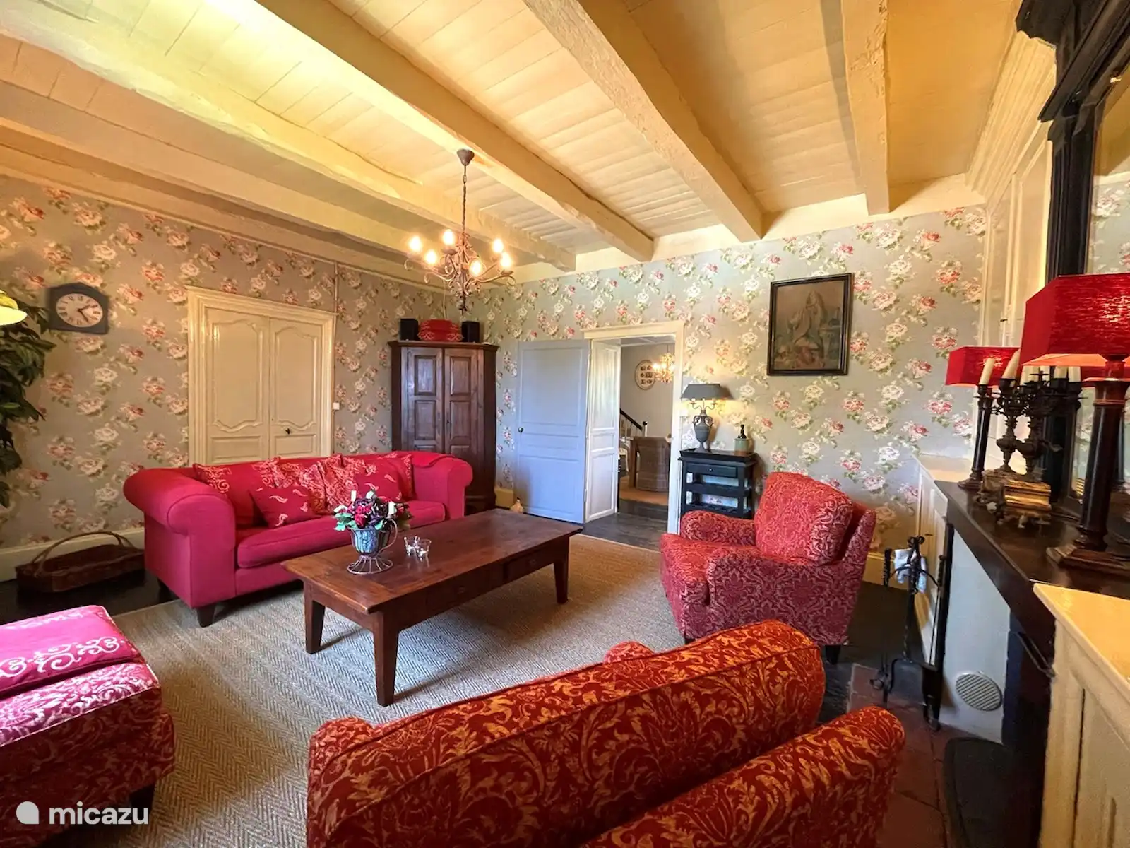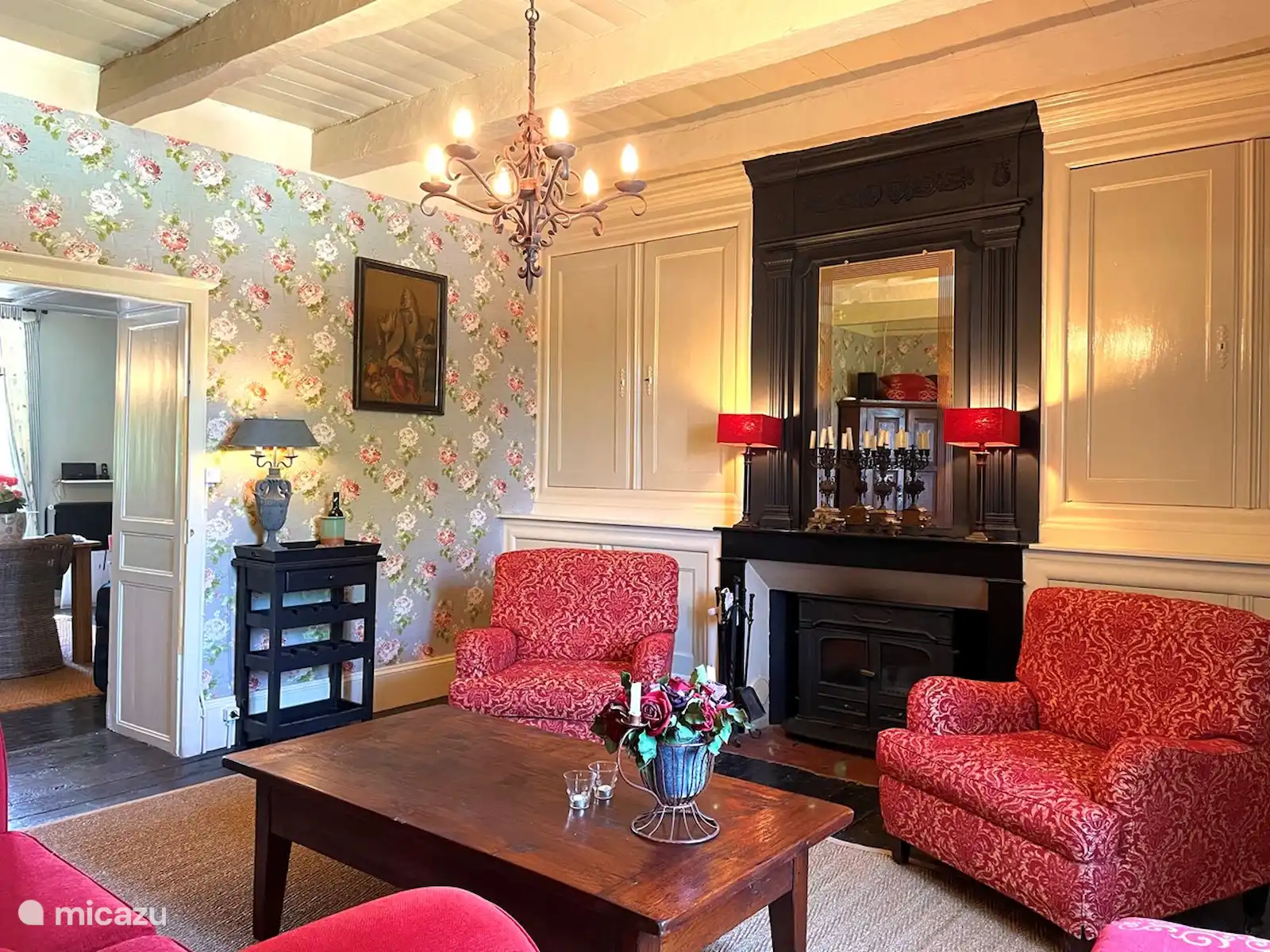 Attenant à la cuisine, vous trouverez le salon où vous vous imaginez dans l’ancienne France. Vous y trouverez une grande cheminée entourée des armoires imposantes d’origine, du canapé rouge foncé et de peintures anciennes. Le salon dispose d’une télévision avec une connexion Chromecast.