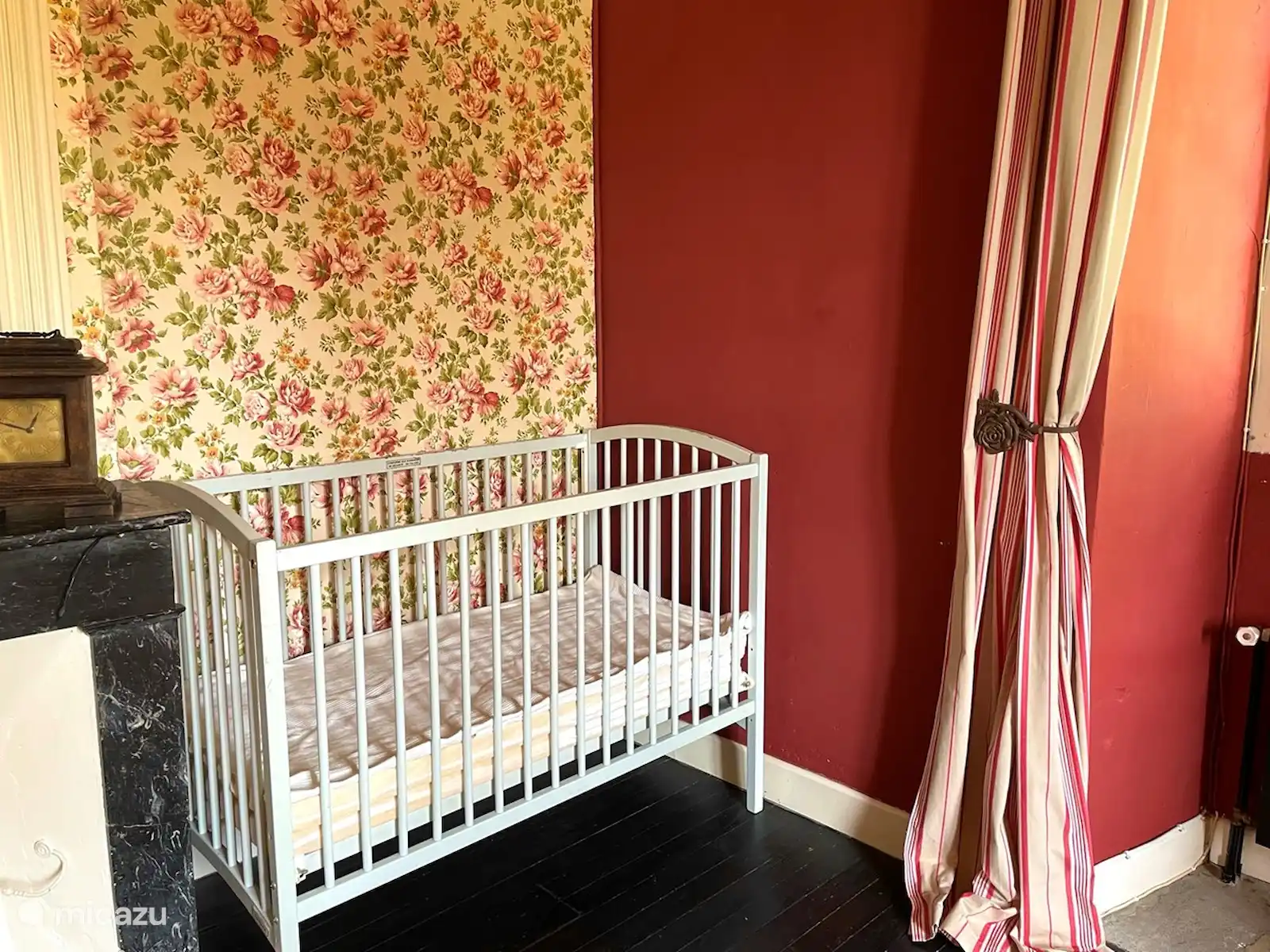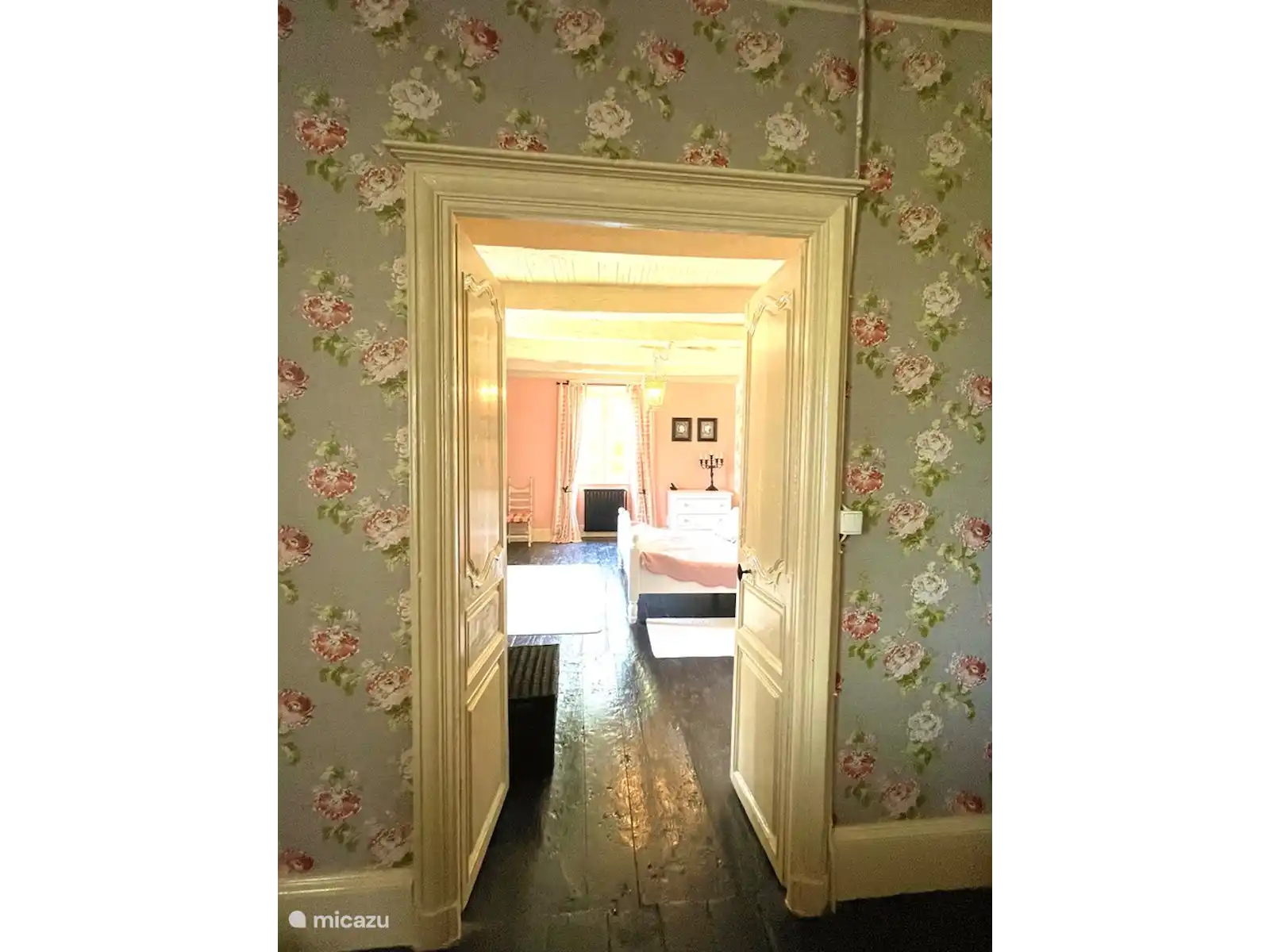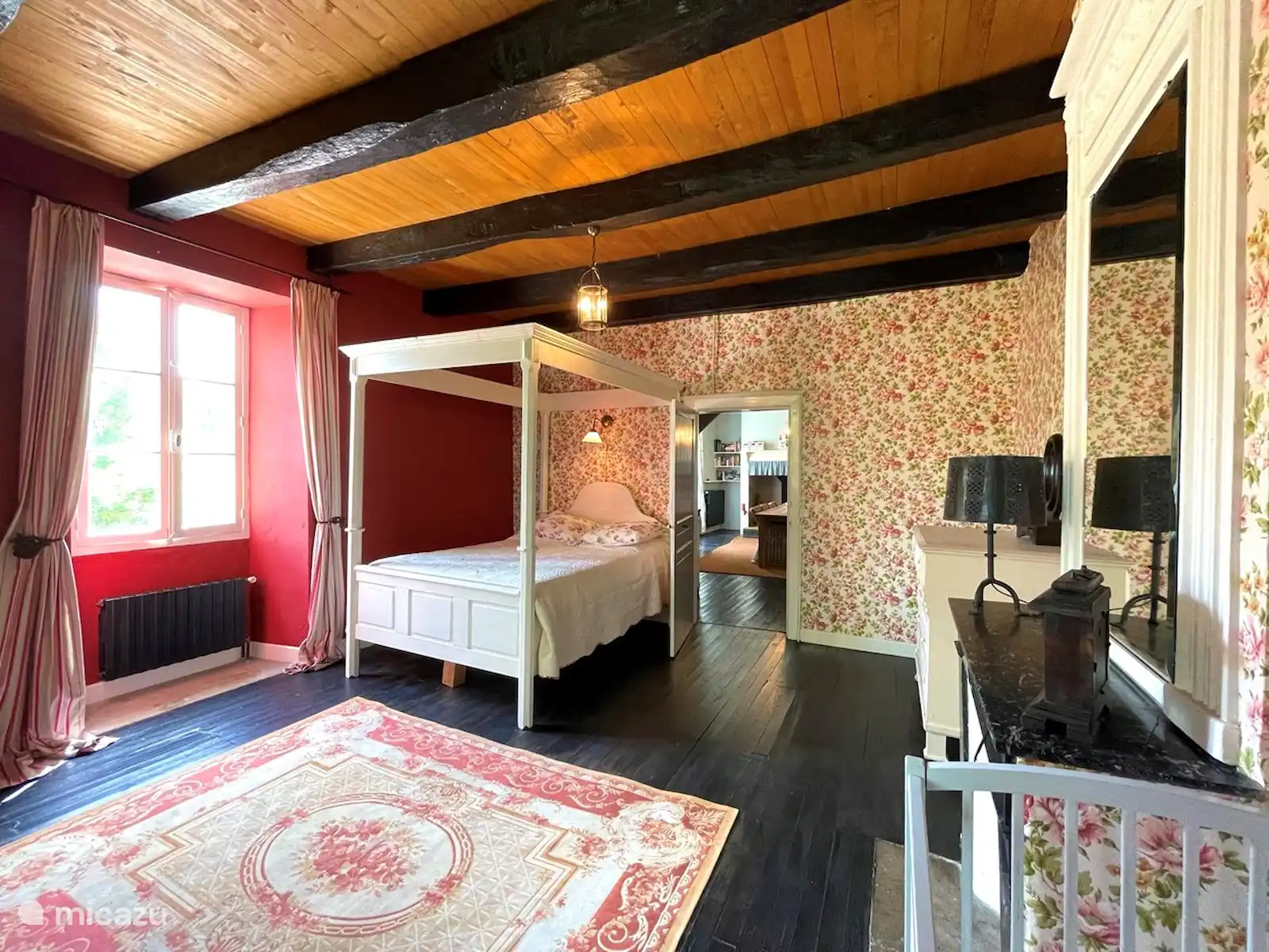 Attenant à la cuisine, vous trouverez le salon où vous vous imaginez dans l’ancienne France. Vous y trouverez une grande cheminée entourée des armoires imposantes d’origine, du canapé rouge foncé et de peintures anciennes. Le salon dispose d’une télévision avec une connexion Chromecast.