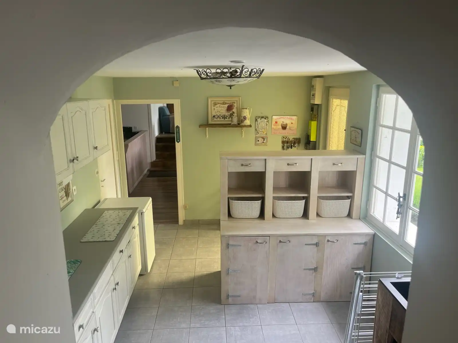 Vous entrez dans la maison par la buanderie, avec salle de bain et toilettes à côté. À droite se trouve la grande cuisine. De plus, un salon confortable. Dans l’extension, qui est la plus fraîche en raison de son emplacement, il y a 2 chambres, chacune avec un lit double. À l’extérieur, il y a plusieurs endroits pour profiter des environs, également couverts.