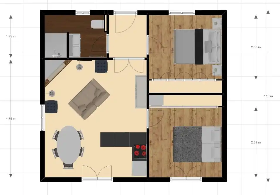 Il y a 2 chambres et une salle de bain, tous au même niveau et facilement accessibles. Une chambre dispose d’un lit double de 160 x 200 cm. Dans la deuxième chambre, il y a 2 lits simples de 80 x 200 cm. Bien sûr, ils peuvent aussi être placés comme un lit double de 160 x 200 cm. La salle de bain dispose d’un double lavabo et d’une douche à l’italienne. Vous pouvez aussi utiliser une machine à laver, un séchoir et une planche à repasser ou un fer à repasser. Sauvegarde encore dans les bagages.