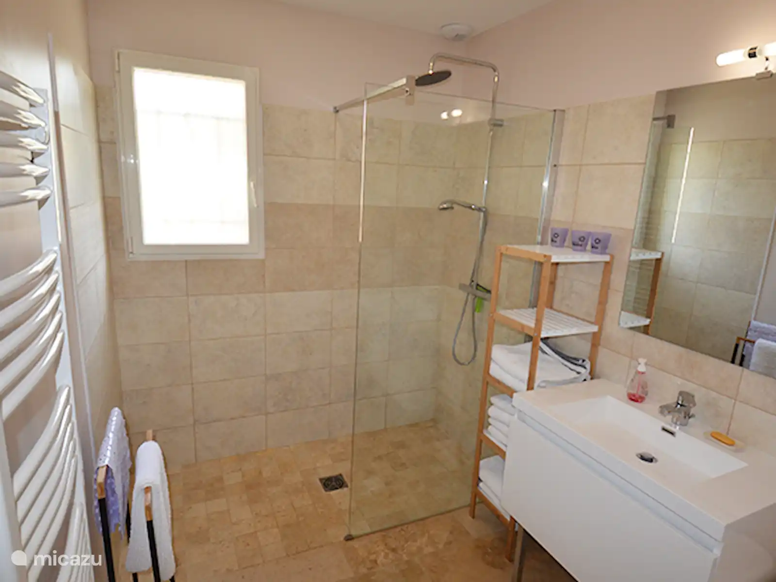 - Salle de bain moderne avec douche à l’italienne spacieuse et lavabo