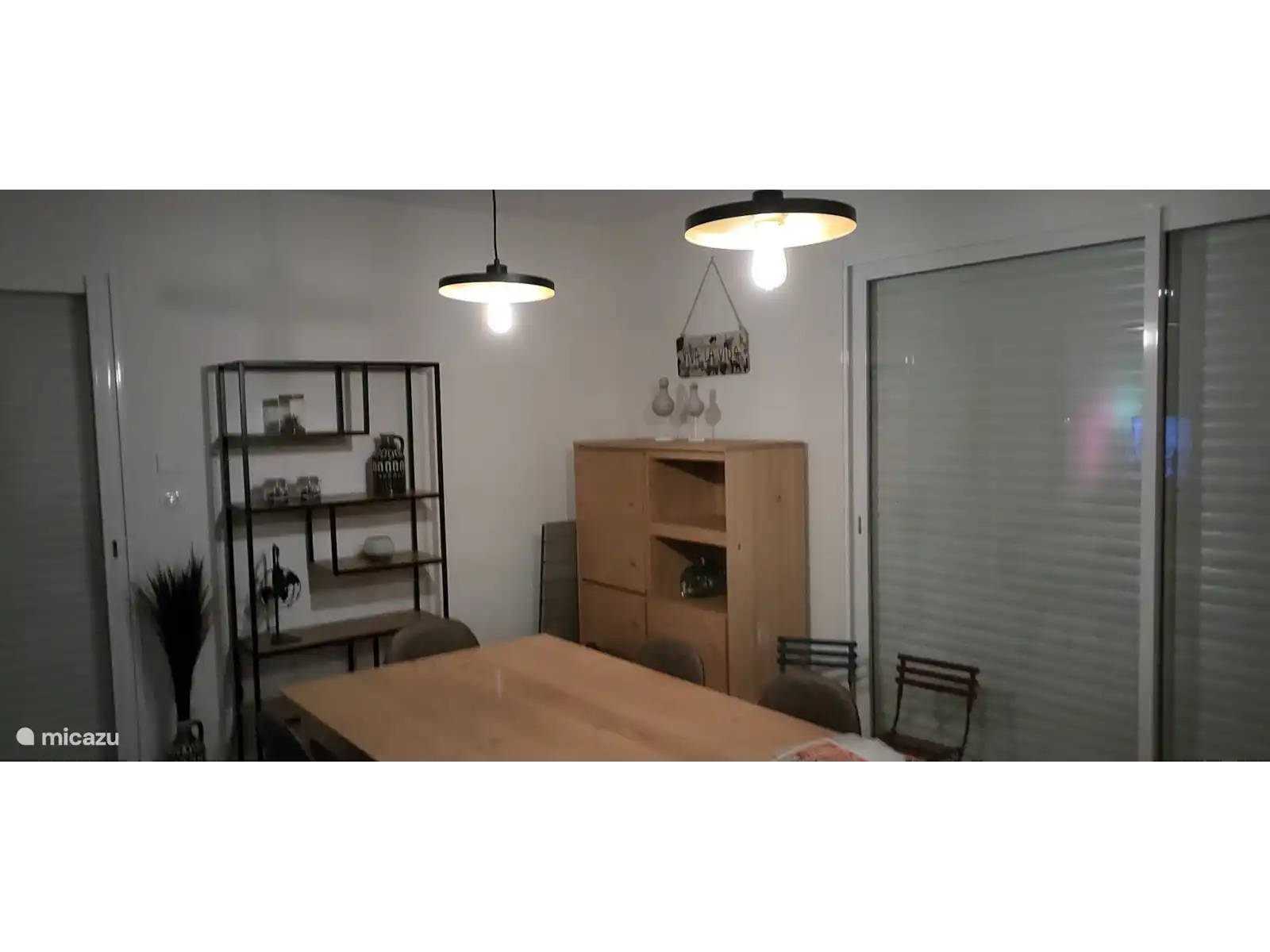 - salon spacieux avec climatisation, coin salon (TV à écran plat avec TV Vlaanderen et Internet sans fil), table à manger et accès direct à la terrasse et au jardin avec la piscine