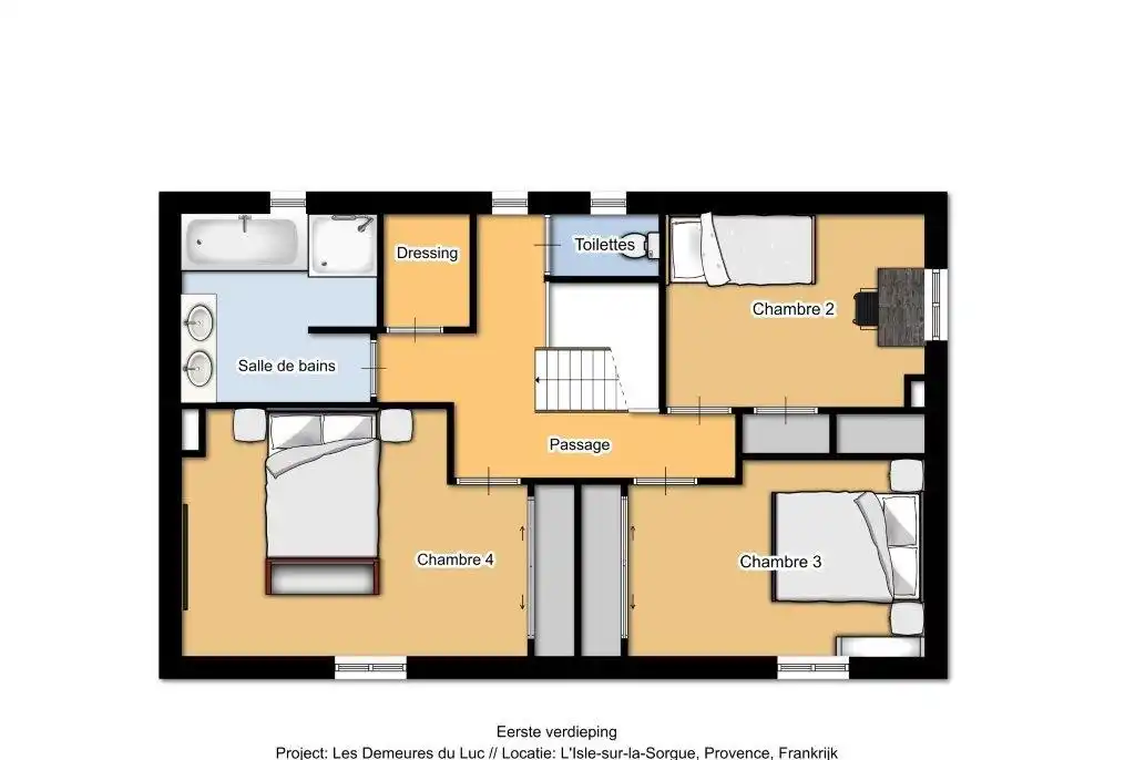 La maison de vacances compte quatre chambres pour deux personnes, une au rez-de-chaussée et trois au rez-de-chaussée. Toutes les fenêtres des chambres sont équipées de moustiquaires. Il y a 2 salles de bain ; une petite chambre dans la chambre pour deux personnes au rez-de-chaussée avec douche et lavabo, et une grande salle de bain au rez-de-chaussée avec baignoire, douche séparée et double lavabo. Au rez-de-chaussée comme au rez-de-chaussée, vous trouverez des toilettes séparées.