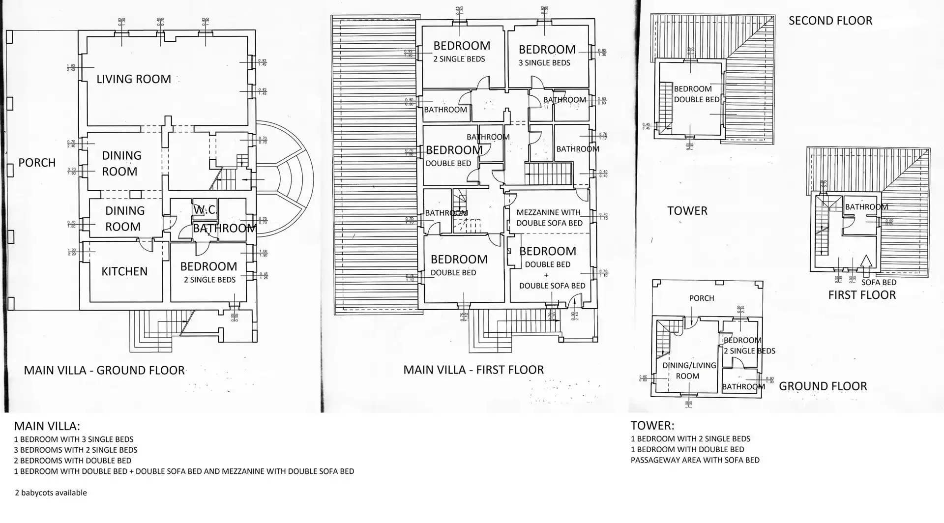 1er étage : chambre double, canapé-lit double et deux canapés-lits simples en mezzanine, salle de bain. Chambre avec lit double et salle de bain. Deux chambres avec 2 lits simples et salle de bain. Chambre avec 3 lits simples et salle de bain. 2ème étage : chambre avec lit double (ou 2 lits simples) et salle de bain/jacuzzi/douche.