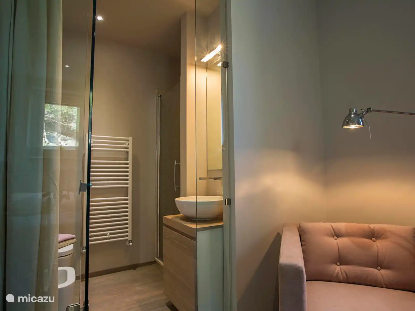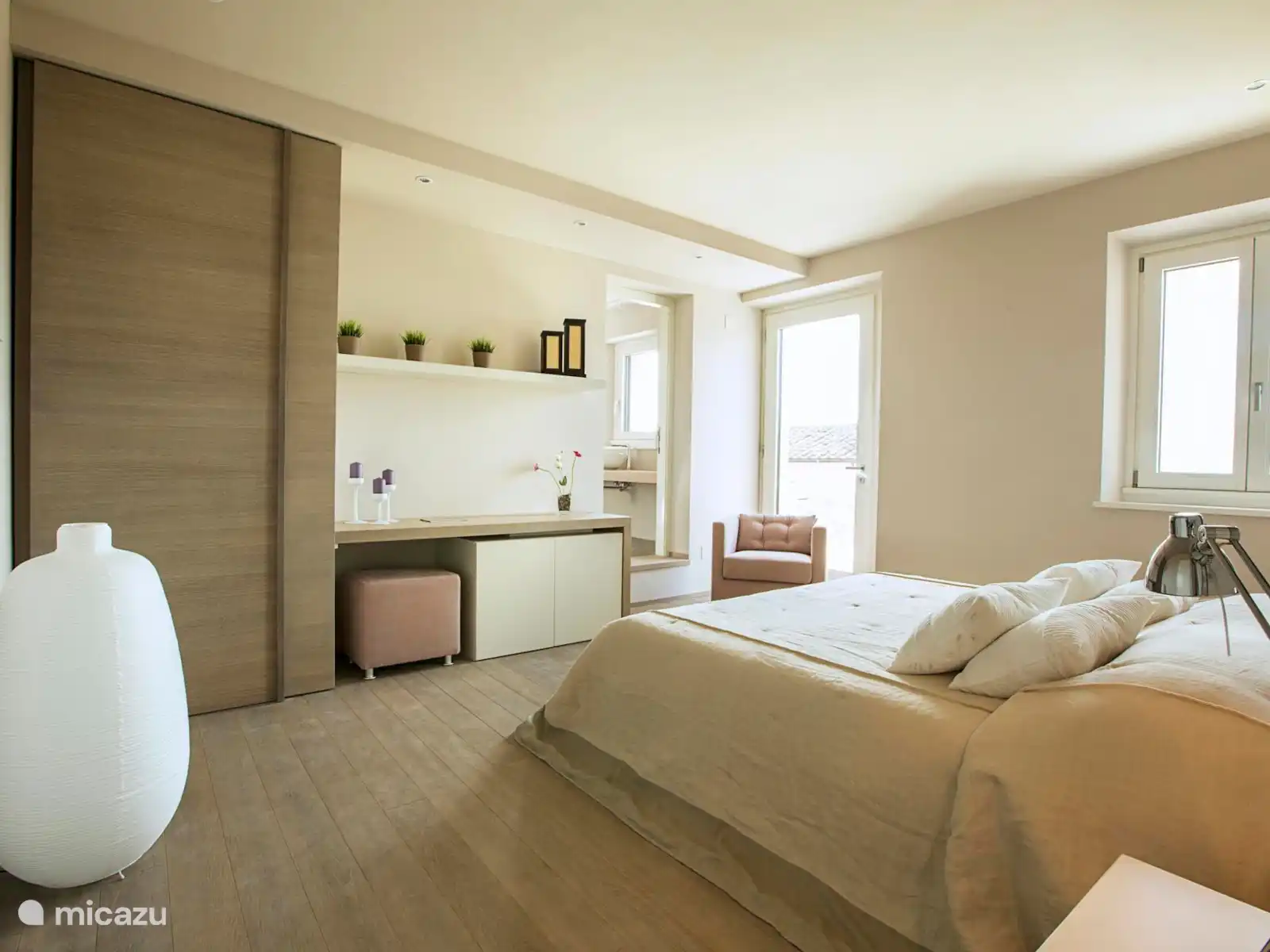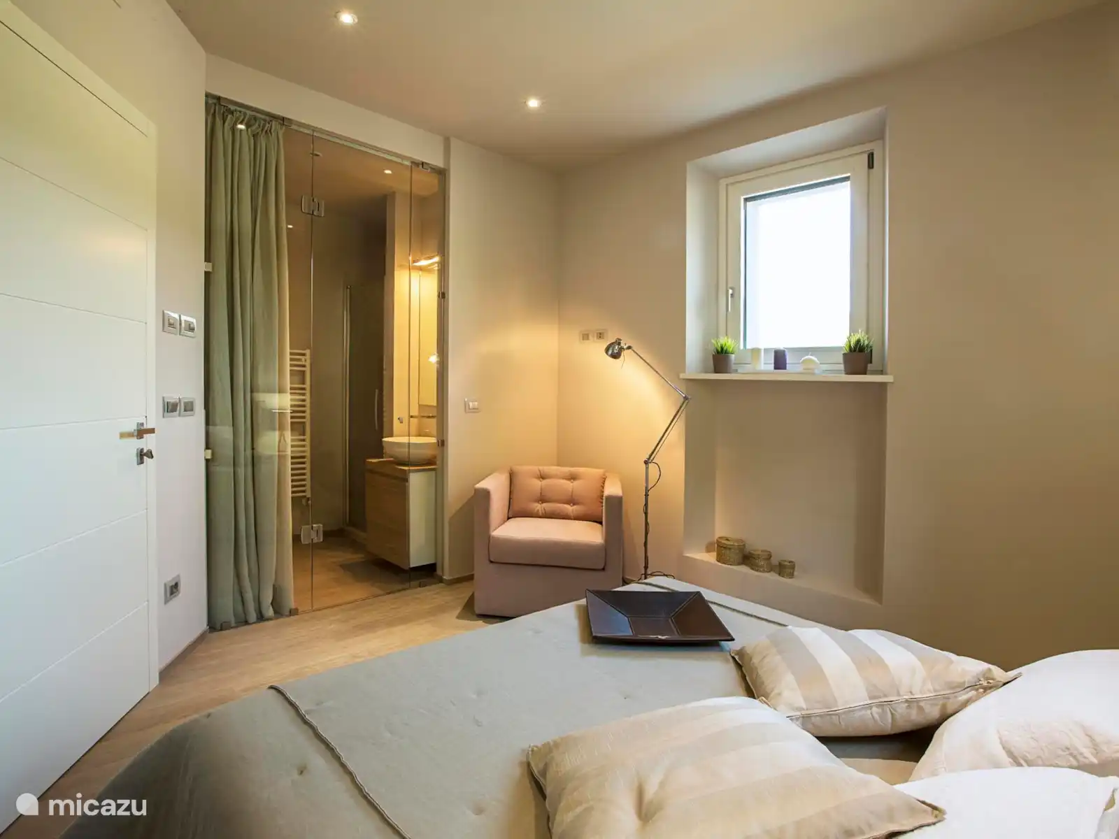 À cet étage également, vous trouverez la deuxième suite double avec un accès direct à la terrasse panoramique. La pièce dispose d’une salle de bain avec douche à effet pluie et chromothérapie, d’une baignoire ainsi que d’un bain turc romantique pour deux personnes.