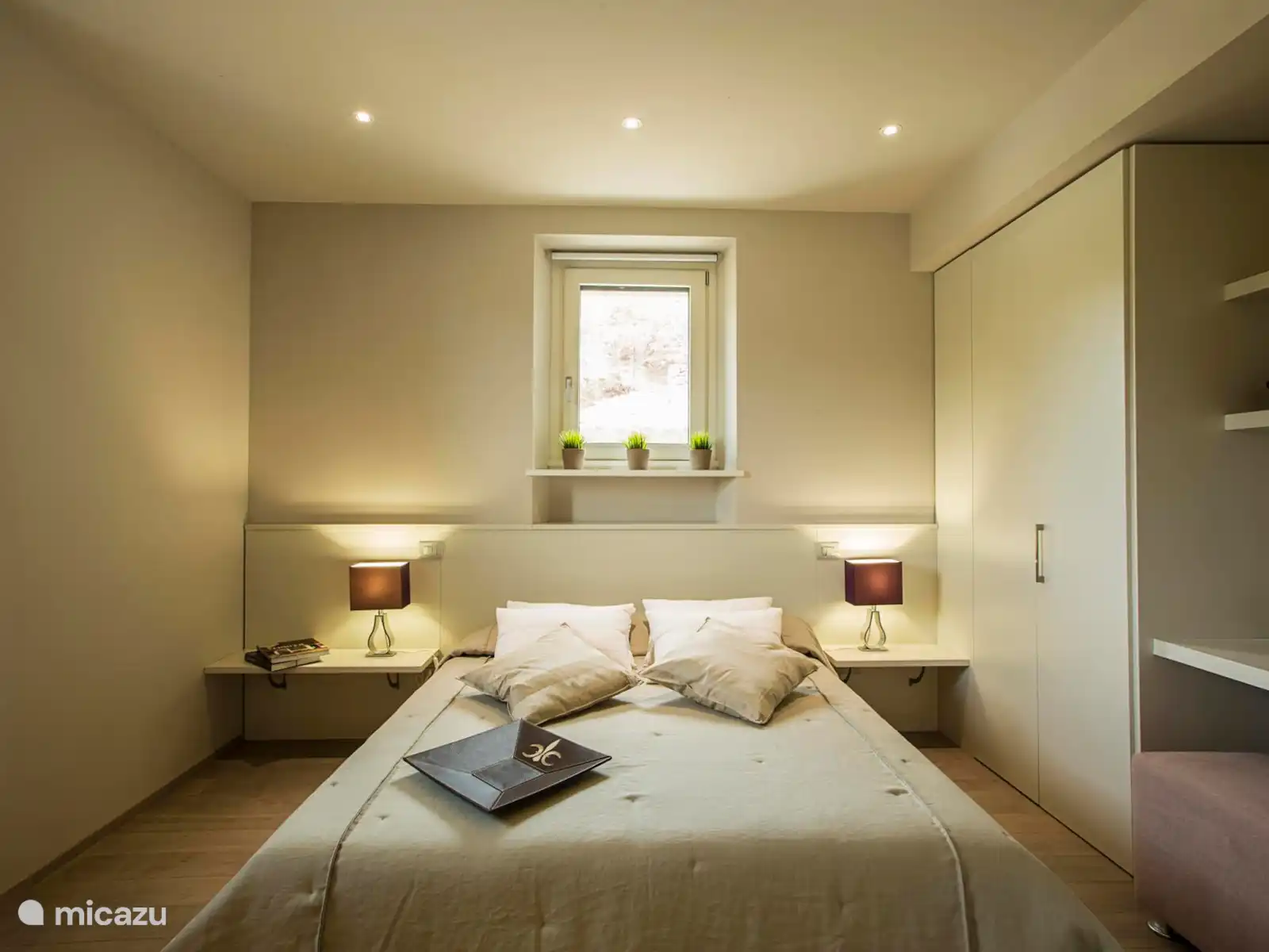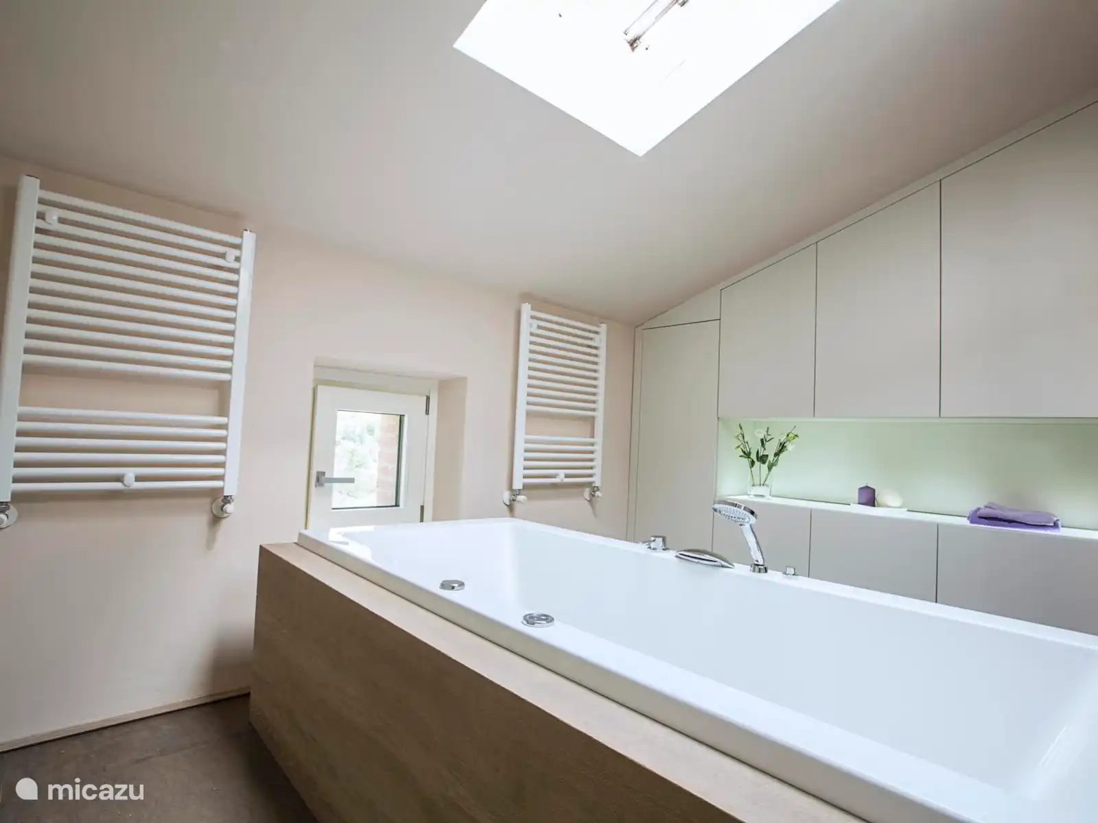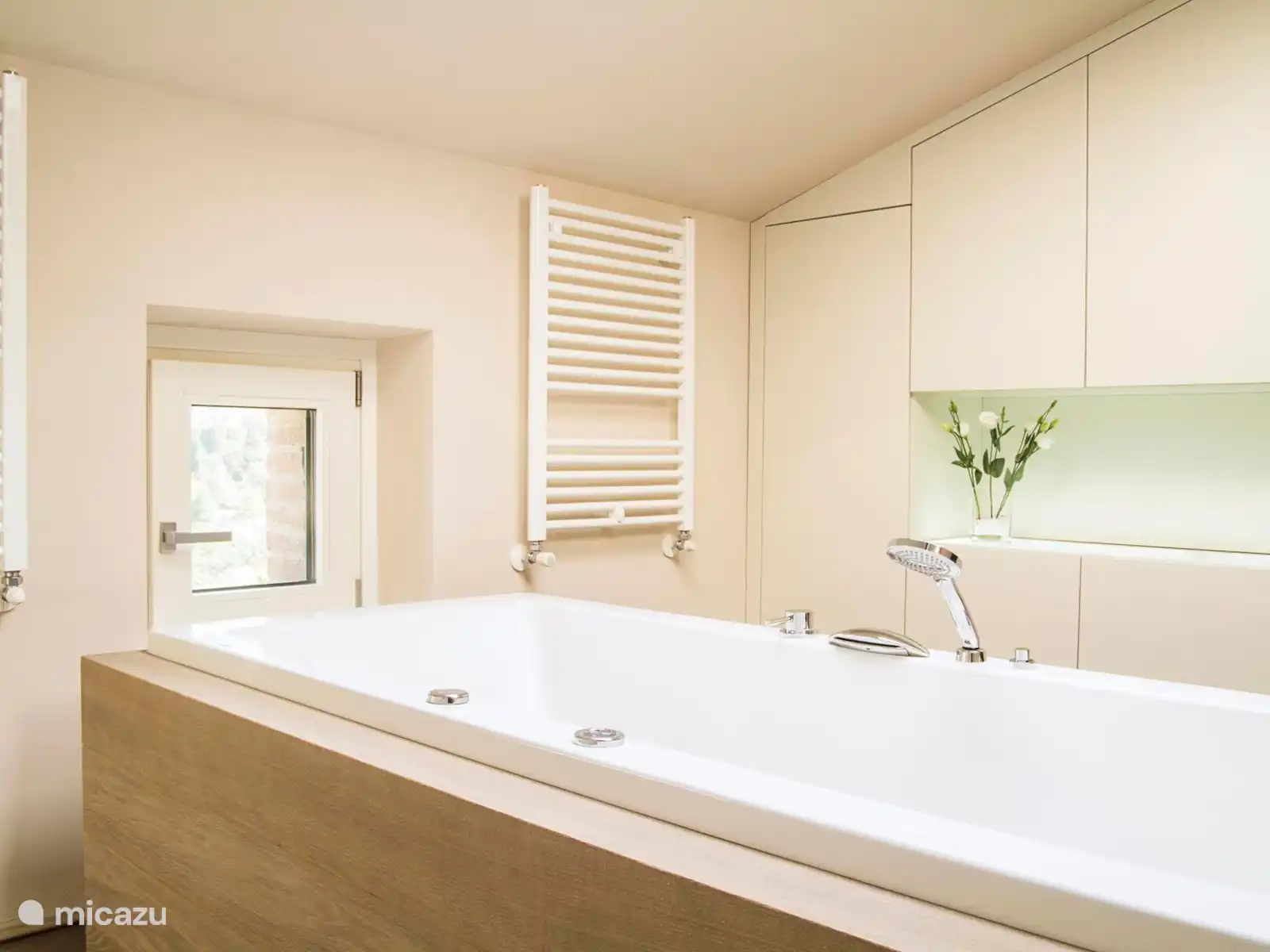 À cet étage également, vous trouverez la deuxième suite double avec un accès direct à la terrasse panoramique. La pièce dispose d’une salle de bain avec douche à effet pluie et chromothérapie, d’une baignoire ainsi que d’un bain turc romantique pour deux personnes.