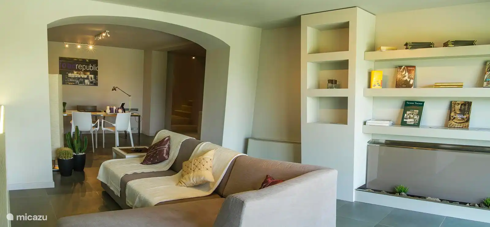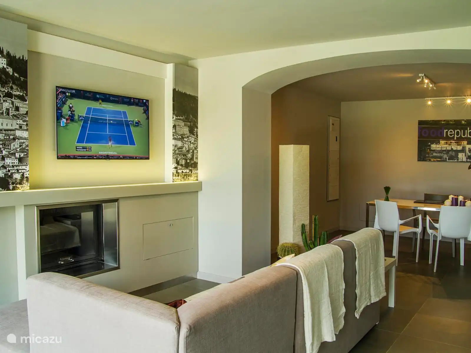 La dernière partie de la villa est la partie inférieure, le sous-sol, où vous disposerez d’un salon avec canapés, télévision par satellite et cheminée, ainsi qu’une table de billard et un coin lecture. On accède à l’espace salon par l’escalier intérieur ou directement depuis l’extérieur.