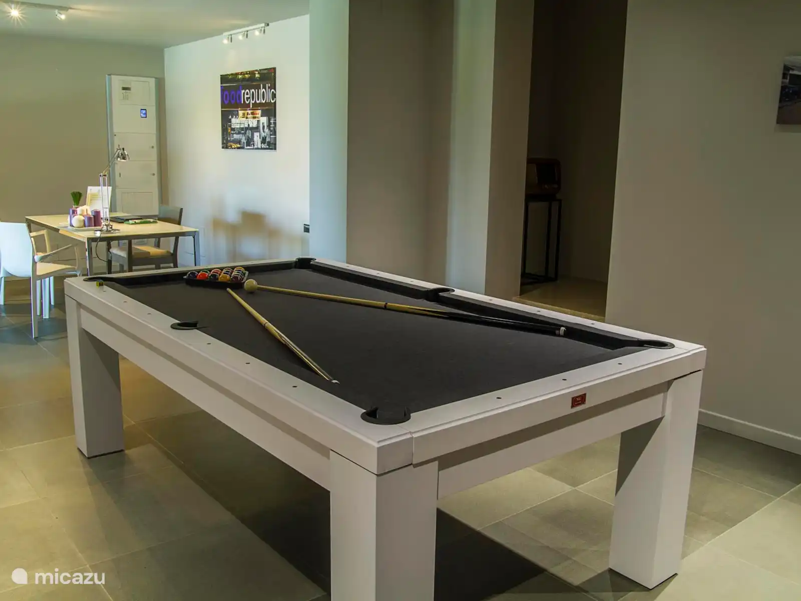 - espace salon/salon avec télévision satellite, canapés, table de billard, bureau et cheminée