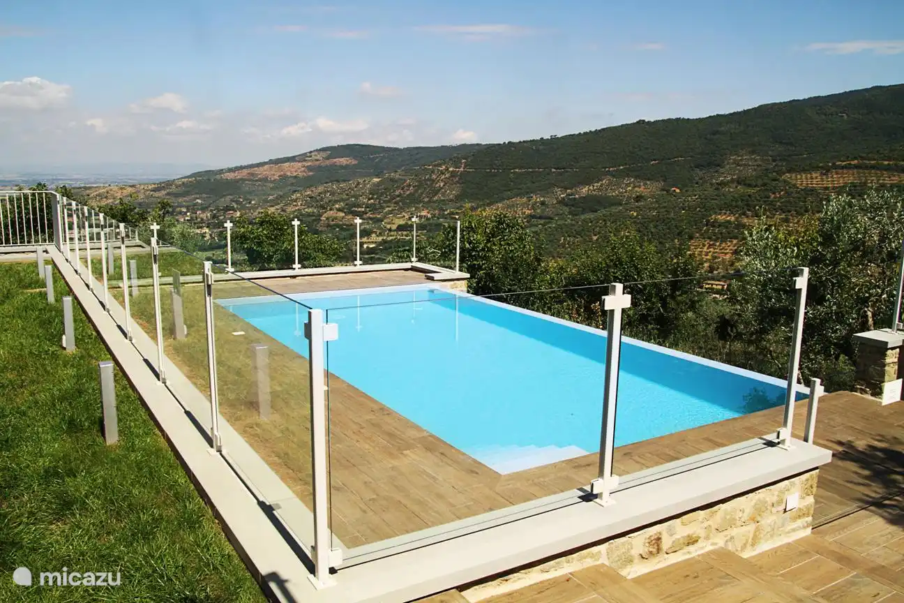 Jardin privé et parking, une piscine à débordement, une piscine avec marches romaines, meuble de jardin, kiosque, pergola, cuisine extérieure entièrement équipée, table à manger extérieure, distance de marche de Cortona (500 m), vue panoramique, changement de linge hebdomadaire, ensemble de bienvenue gastronomique, internet Wi-Fi gratuit, télévision satellite, climatisation incluse dans le prix, chauffage selon consommation, kit de bain de courtoisie, cuisine entièrement équipée