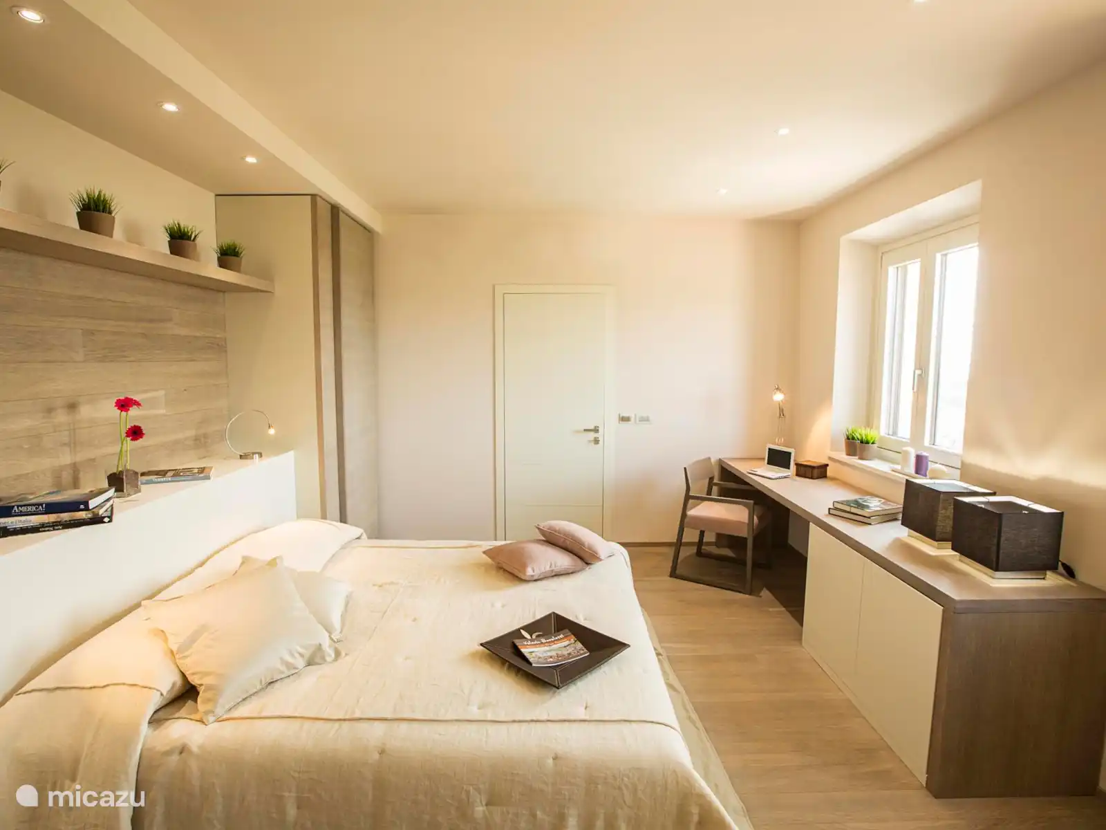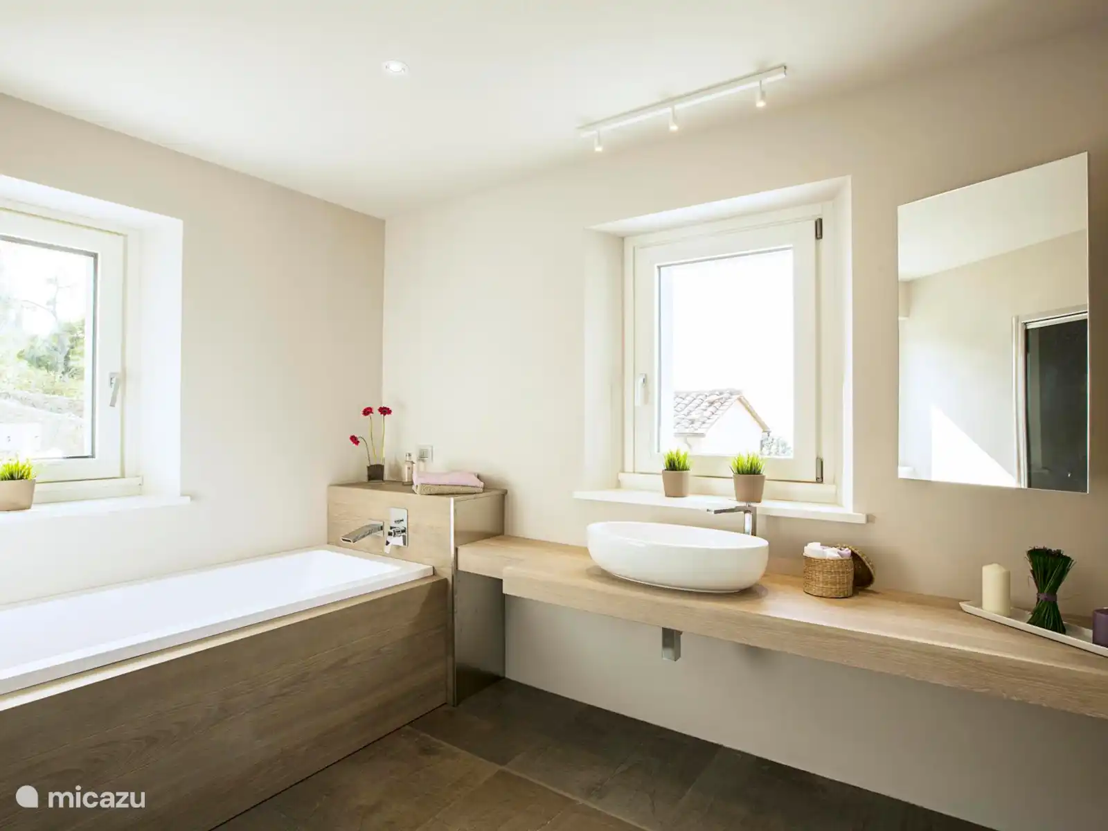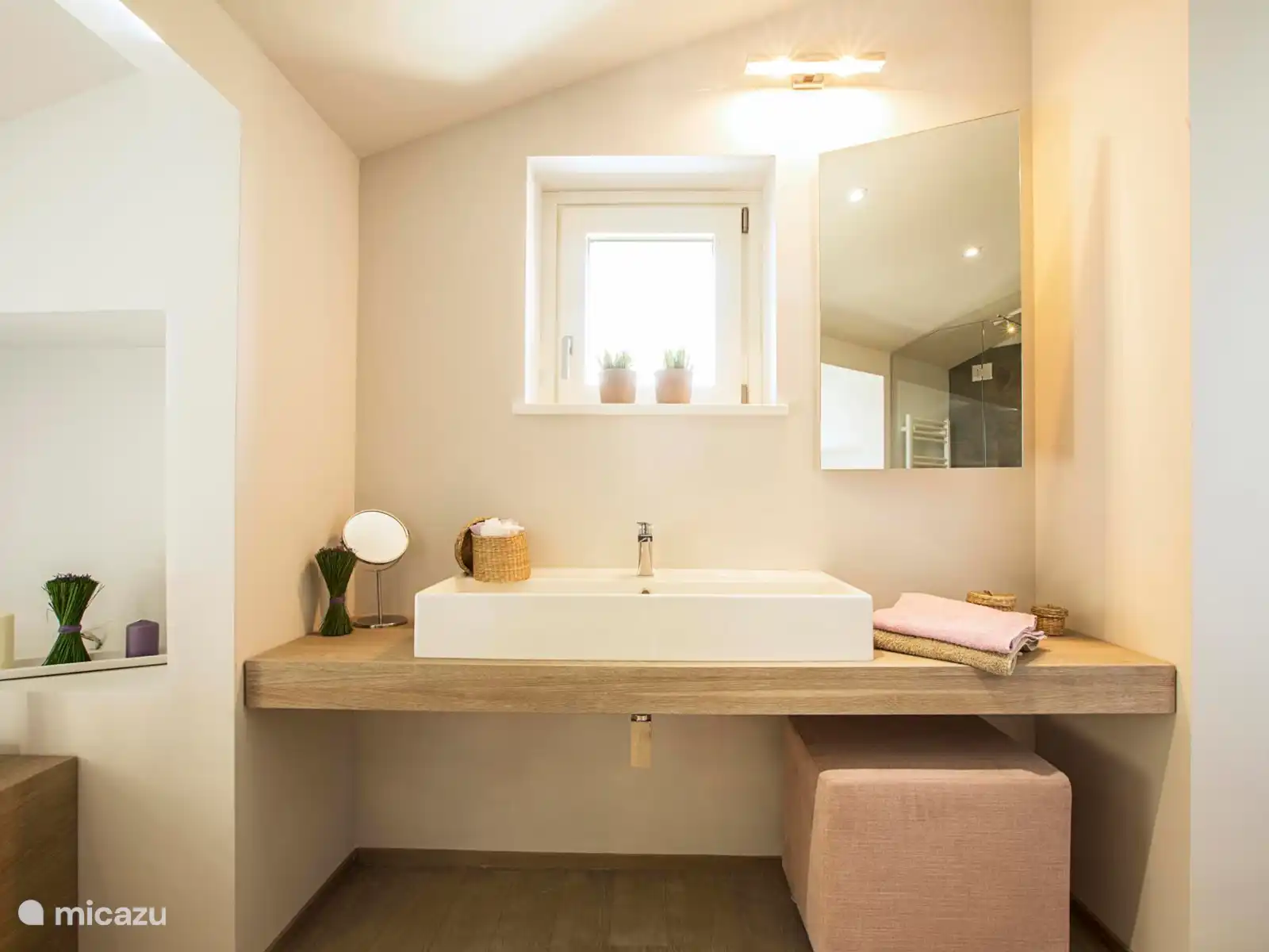 Au premier étage, vous trouvez les deux autres chambres doubles. La première se caractérise par une vue magnifique et un puits de lumière, équipée d’une salle de bain complète avec douche et baignoire hydromass, ainsi que la seconde suite, avec douche et baignoire aromathérapie dans la salle de bain.