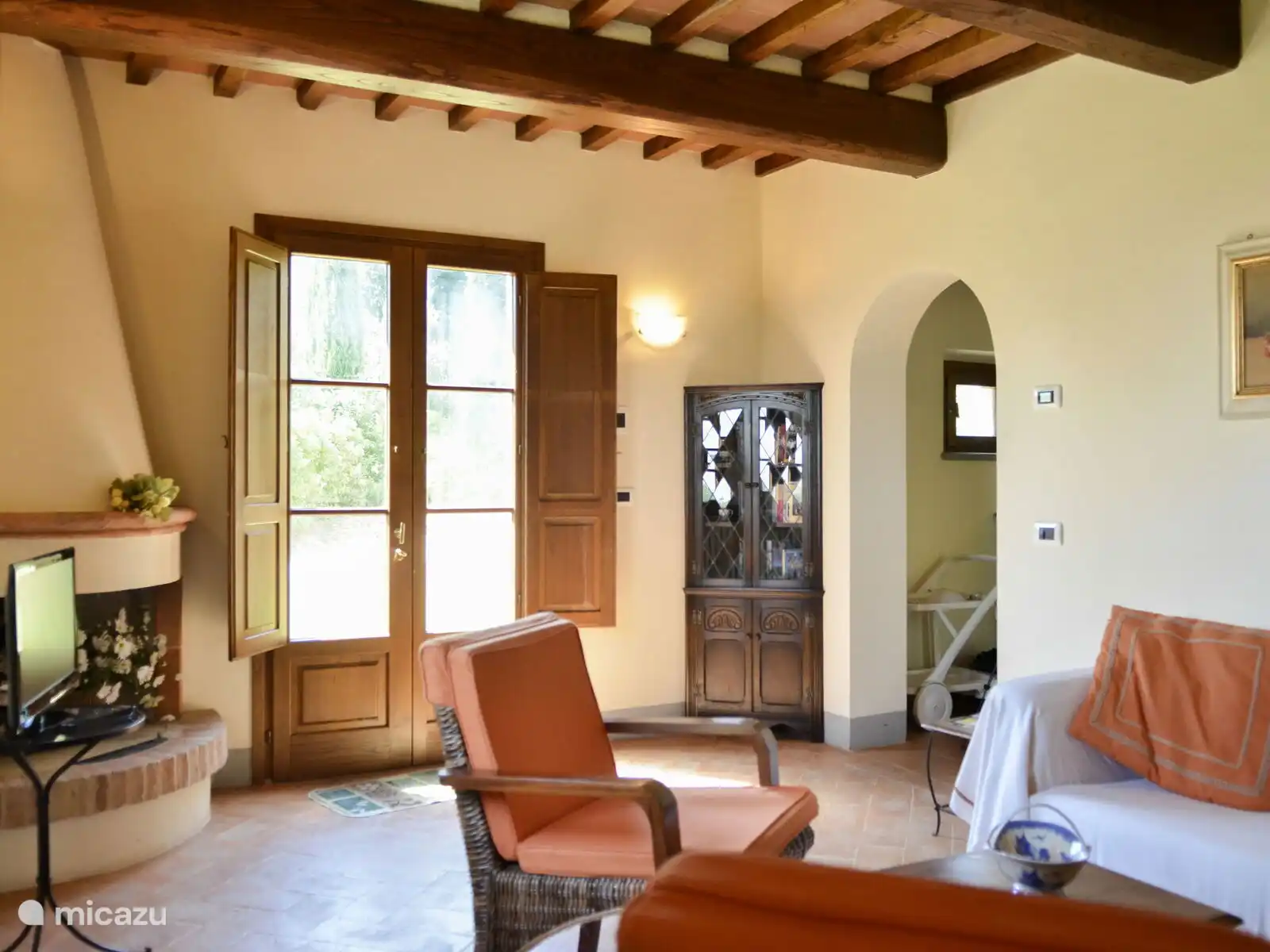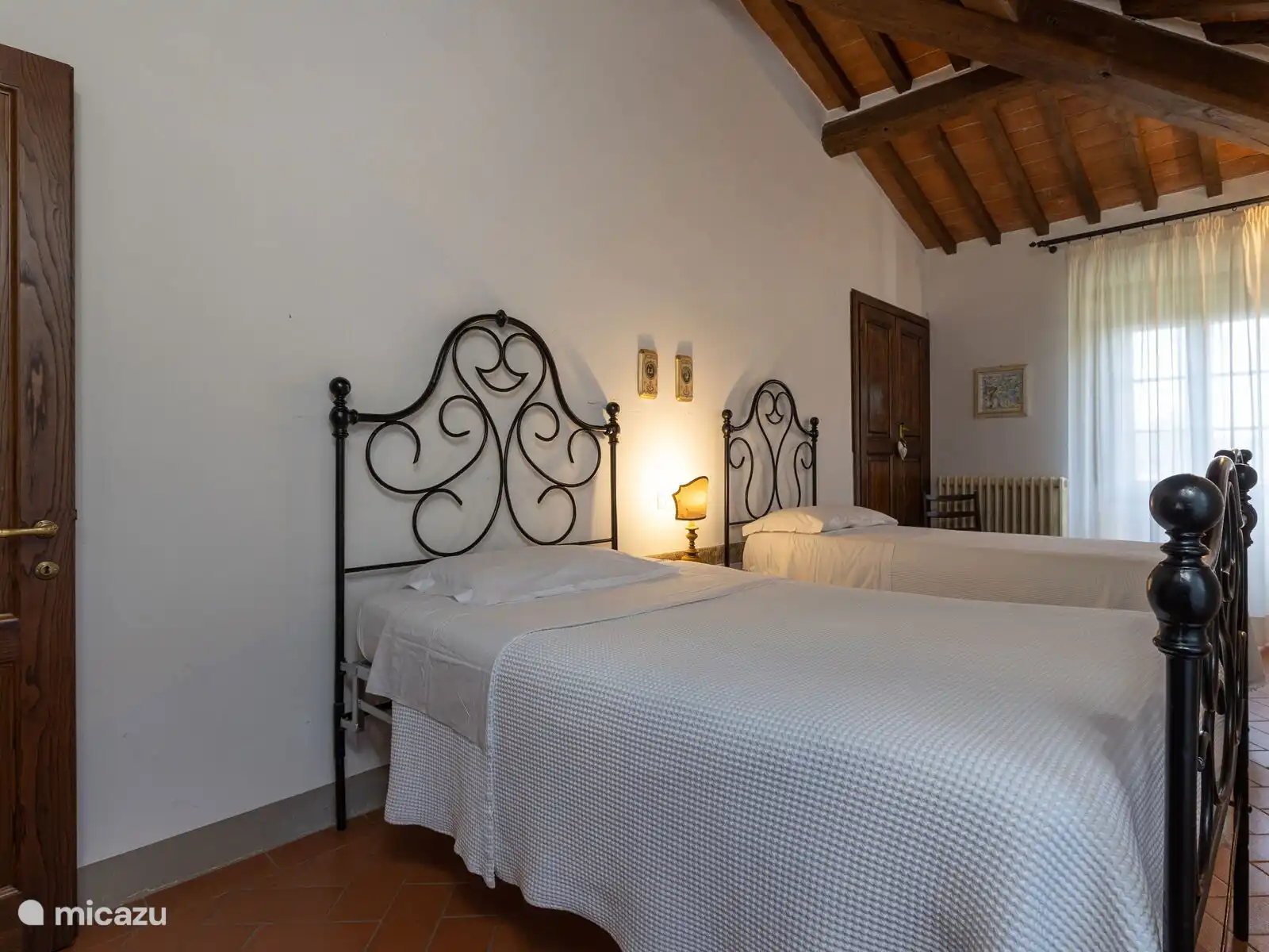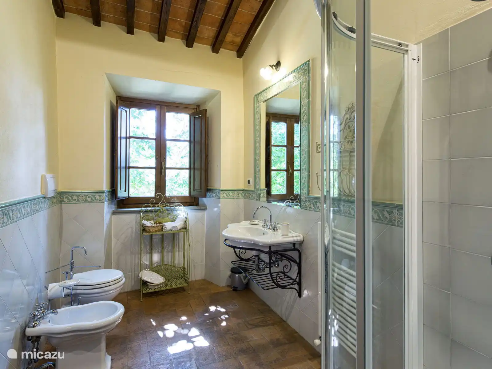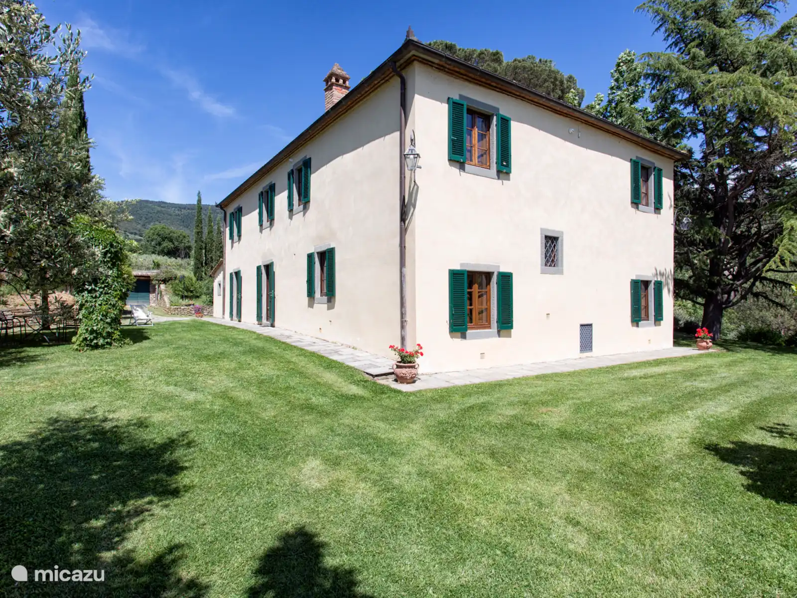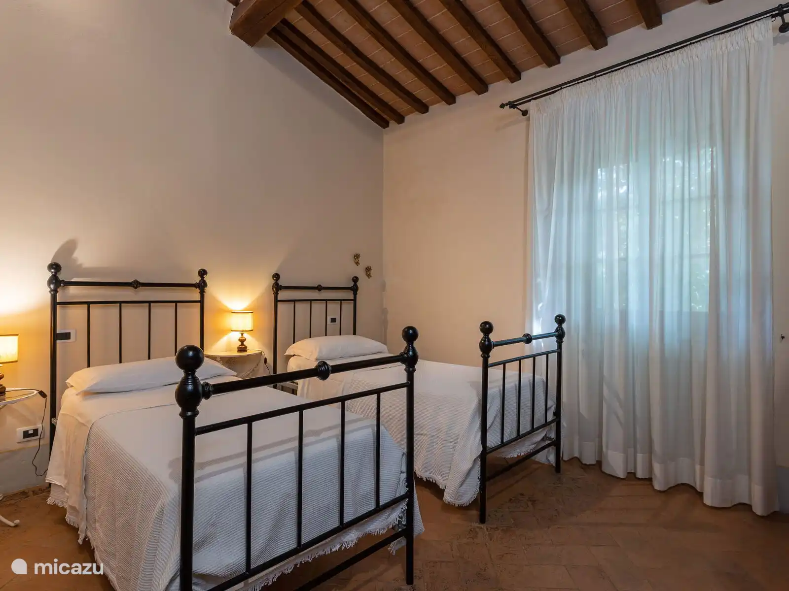 Devant la villa principale se trouve le cottage avec le troisième appartement, également meublé selon le goût typique toscan, avec une entrée privée et un jardin.