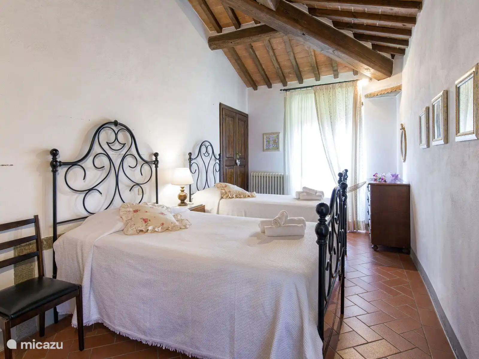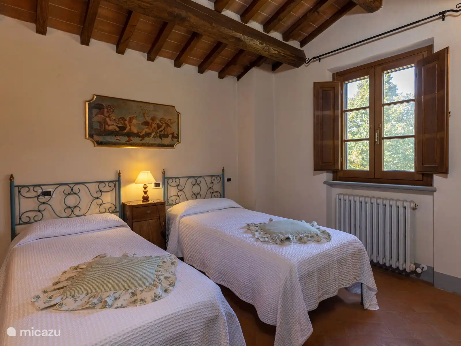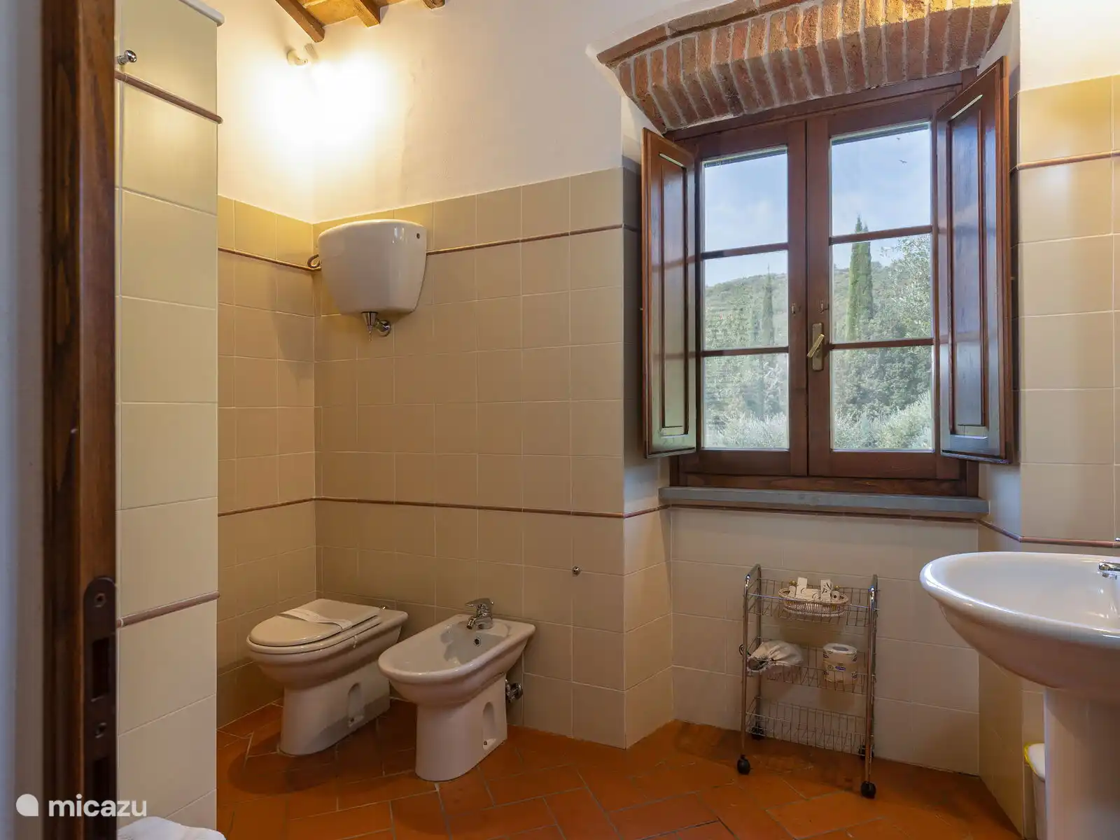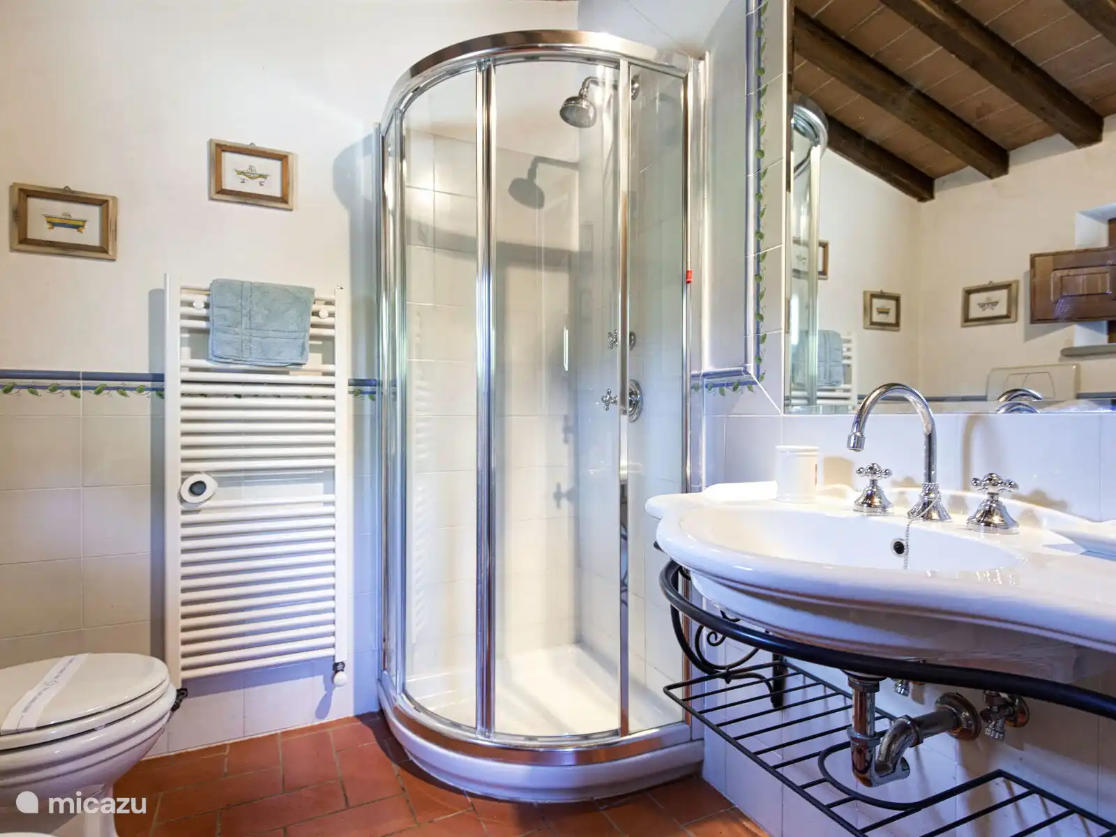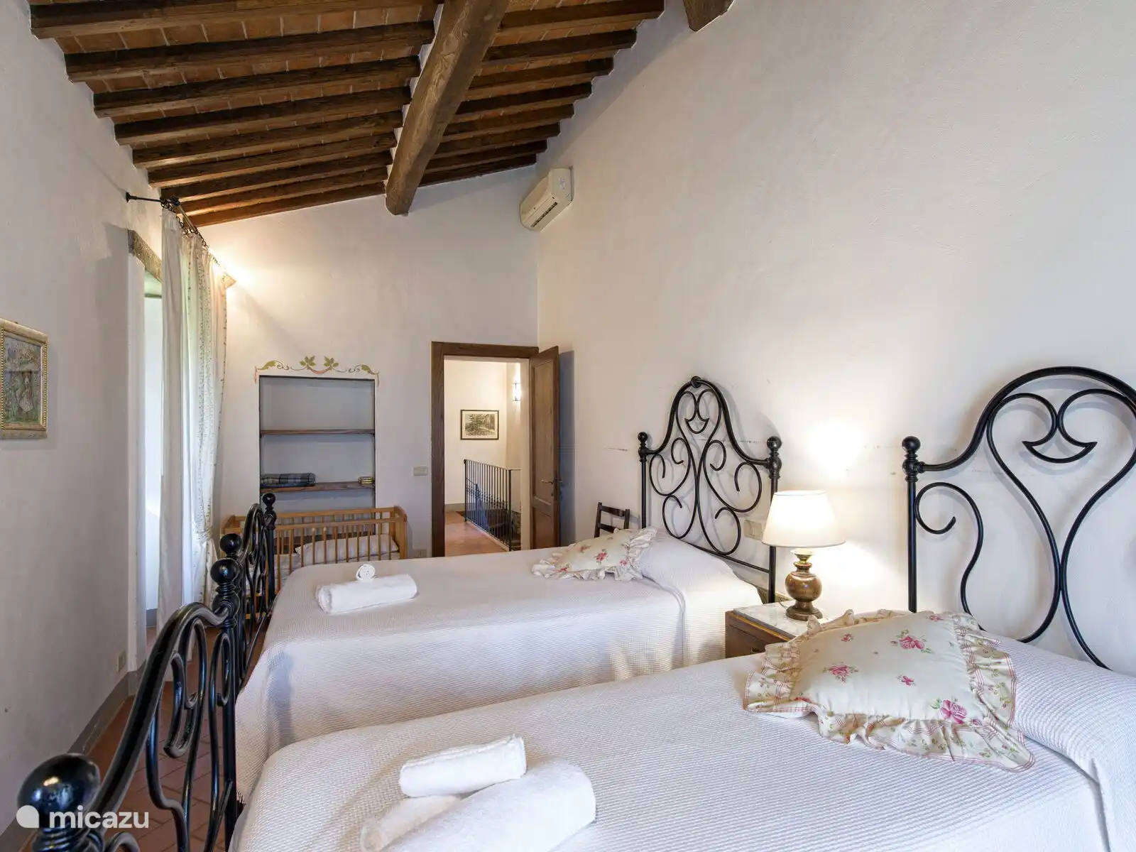 Devant la villa principale se trouve le cottage avec le troisième appartement, également meublé selon le goût typique toscan, avec une entrée privée et un jardin.