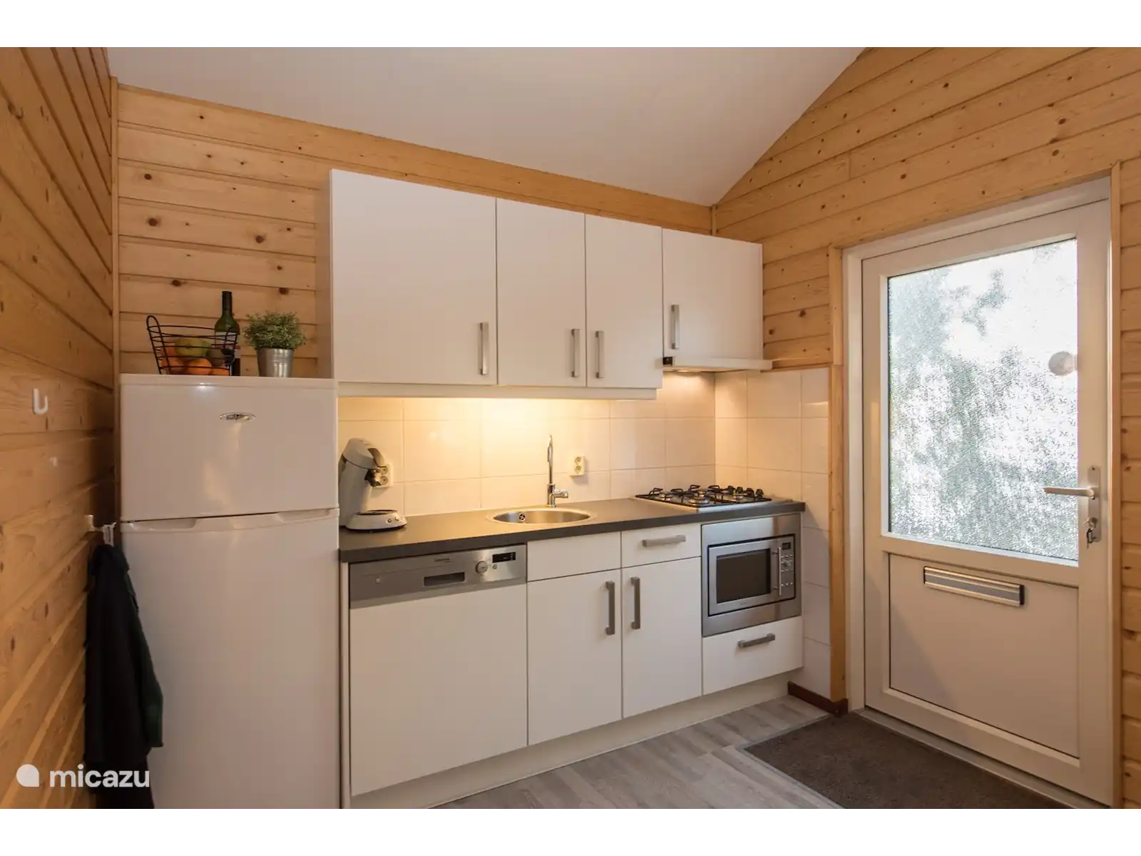 Découvrez la beauté indépendante de ce bungalow entièrement équipé pour rendre votre séjour inoubliable. La cuisine ouverte rayonne de chaleur et d'hospitalité, équipée d'appareils tels qu'un lave-vaisselle, un grand réfrigérateur-congélateur, un four micro-ondes combiné et une plaque de cuisson à gaz.