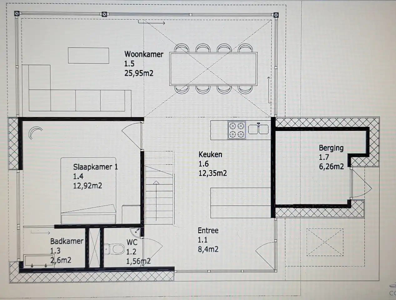 Au rez-de-chaussée, il y a une chambre pour deux personnes avec salle de bain / douche. Les toilettes sont à côté de la chambre dans le couloir.