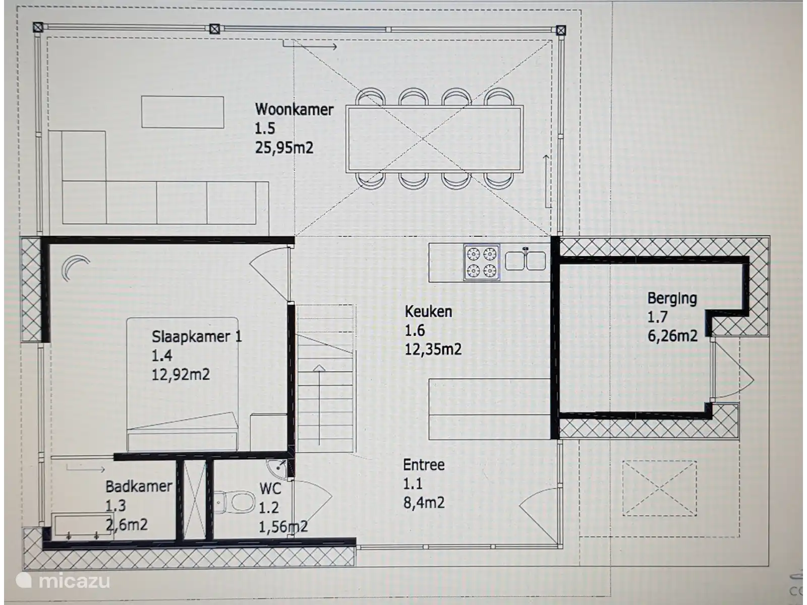 - La cuisine est équipée de plaques à induction, lave-vaisselle, four, réfrigérateur avec congélateur.