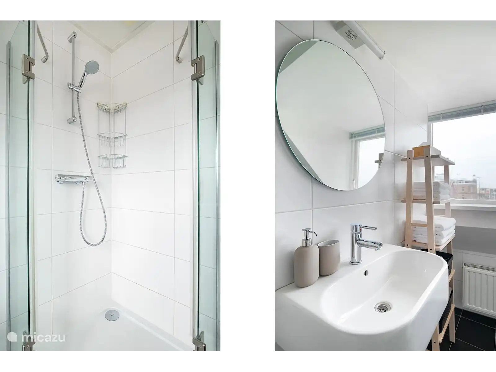 - Salle de bain avec cabine de douche, lavabo et miroir, machine à laver et petit congélateur