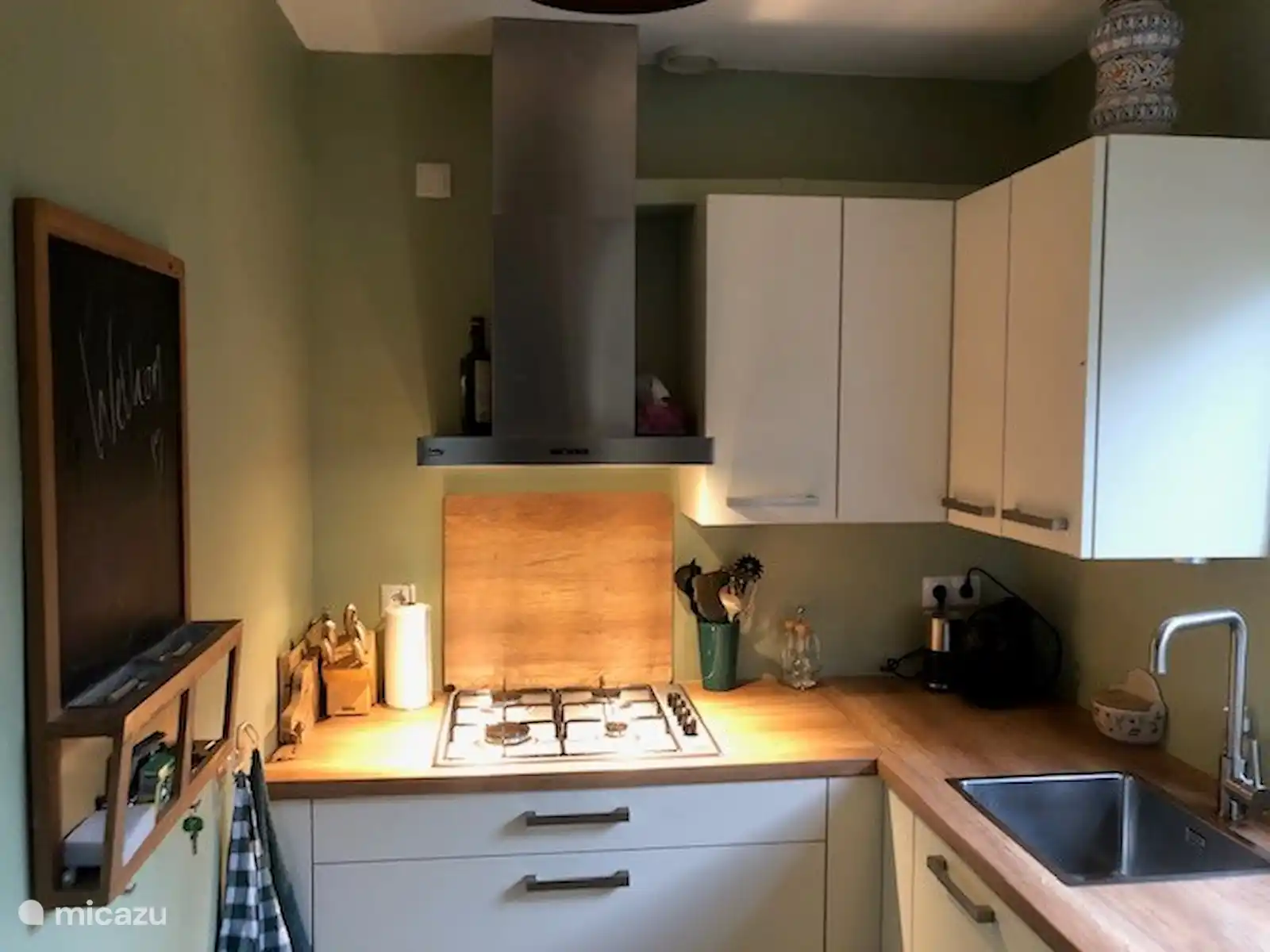 Cuisine avec plaque de cuisson 4 feux, réfrigérateur (avec congélateur), lave-vaisselle, four, bouilloire, cafetière pour café filtre et Nespresso. Les serviettes et torchons, etc. sont également fournis ici.