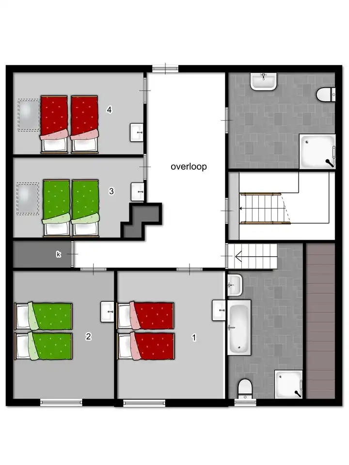 Au rez-de-chaussée vous avez une cuisine champêtre complète incluant lave-vaisselle, four et micro-ondes. Dans le salon cosy un poêle à bois, bar équipé, TV, jeux et matériel de lecture. Avec un groupe de toilettes dans le hall. Cette maison de vacances dispose de 7 chambres doubles confortables avec des lits merveilleux. Quatre salles de bains spacieuses attenantes, dont des toilettes. Place de parking en abondance.