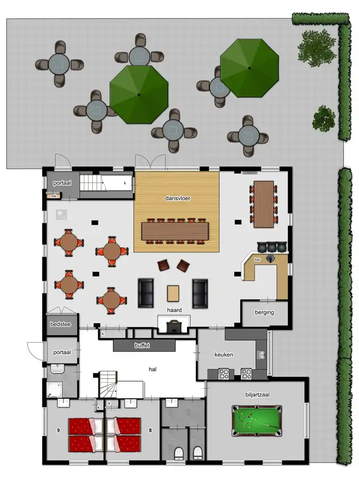 Au rez-de-chaussée, vous avez un salon spacieux avec son propre bar, une cheminée confortable et un coin salon décontracté. Pour la détente de tous un billard, jeux Old Dutch, lecture et TV. Dans la cuisine de campagne complète, vous disposez d'un lave-vaisselle, d'un four, d'un micro-ondes et d'ustensiles de cuisine pour les grands groupes. Deux chambres doubles confortables avec lits confortables et lavabo. Avec salle d'eau attenante et groupe de toilettes. Vous avez la place de parking communicante rien que pour vous. Au premier étage 7 chambres confortables pour 2 personnes avec de magnifiques lits et lavabo, 2 salles de bains fraîches et le groupe de toilettes De Brouwershof est-il un peu trop à l'étroit pour votre groupe ? Vous louez des chambres supplémentaires à Het Voorhuis, à deux pas du Brouwershof.