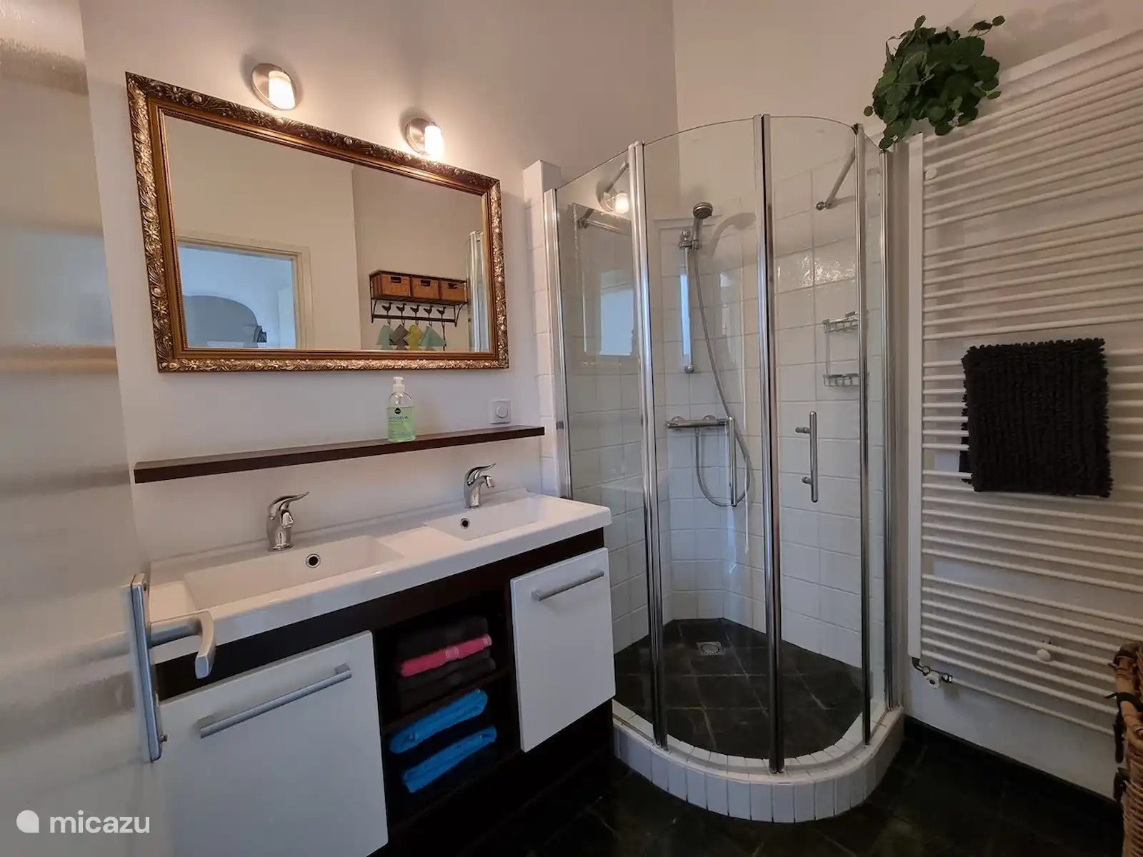 Salle de bain avec cabine de douche séparée et double lavabo