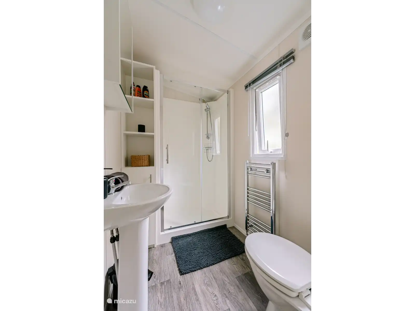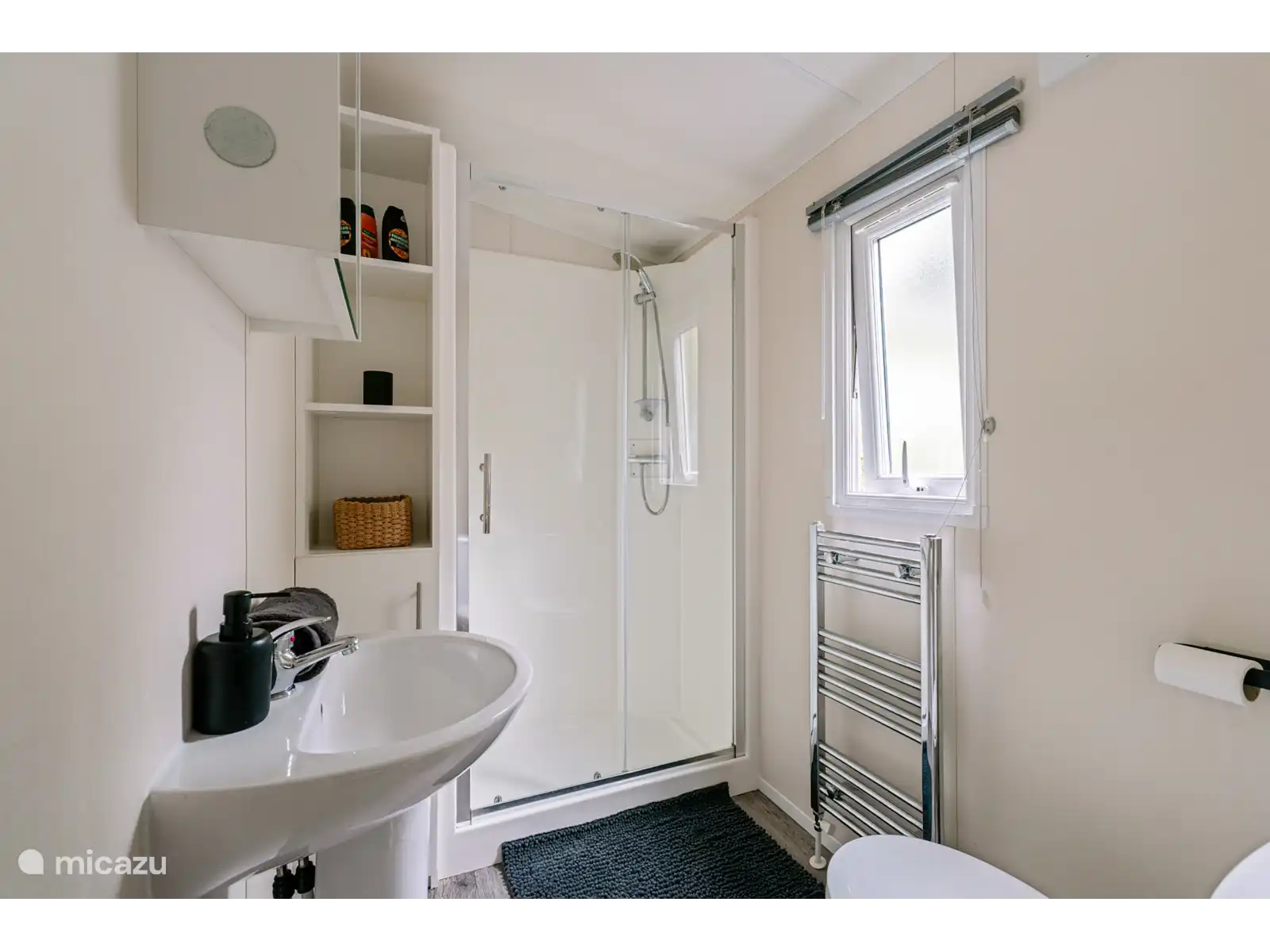 Salle de bain luxueuse avec douche, toilettes et sèche-cheveux