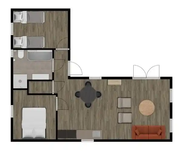 De plus, il y a deux chambres. La 1ère chambre dispose d’un sommier tapissier pour 2 personnes. Dans la 2ème chambre, il y a 2 lits séparés, qui peuvent être poussés l’un à côté de l’autre ou séparés.