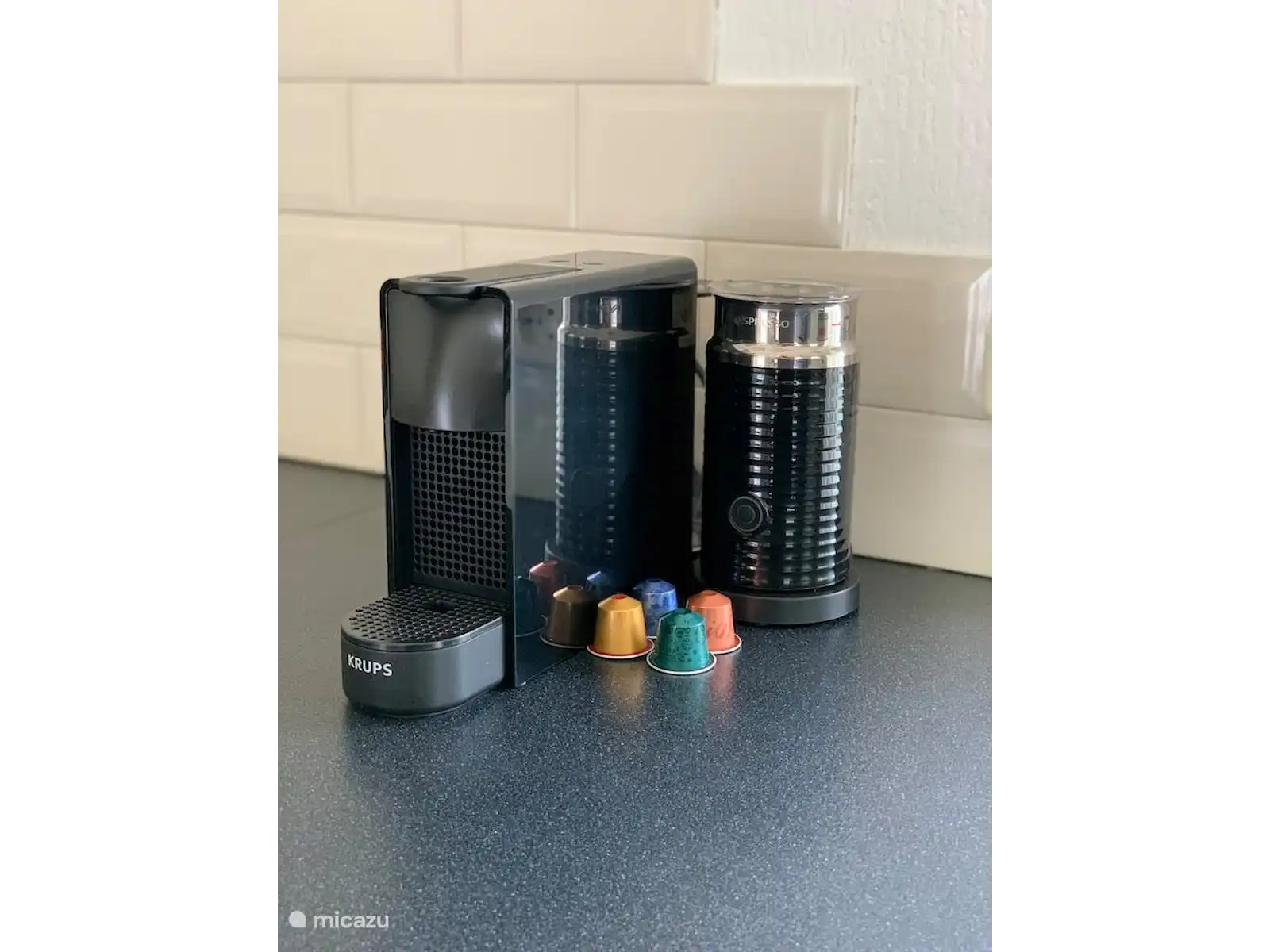 La cuisine ouverte est bien équipée avec divers ustensiles de cuisine, dispose d’une cuisinière à gaz à 4 feux, d’un micro-ondes combiné avec fonction four, d’un réfrigérateur avec congélateur, d’un lave-vaisselle, d’une bouilloire et d’un coin salon/salle à manger. Les amateurs de café ont également été pensés ; vous pouvez déguster une délicieuse tasse de café de la machine Nespresso (KRUPS). Pour rendre votre café encore plus luxueux, vous pouvez utiliser le mousseur à lait Nespresso. Diverses tasses à café sont déjà offertes à votre arrivée. Le thé anglais, le sucre et la crème se trouvent également dans le tiroir de la cuisine. Il y a aussi de l’huile d’olive, du sel et du poivre disponibles.