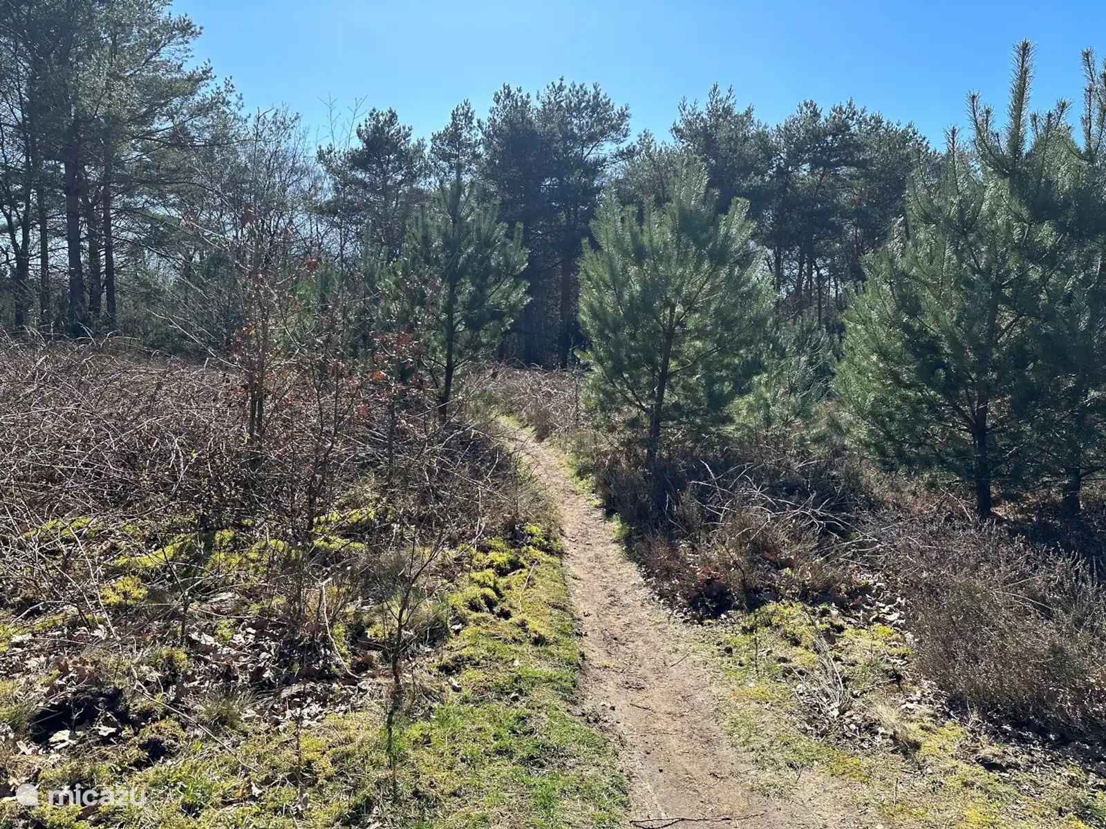 Pour les jours plus chauds, il y a un ventilateur à votre disposition. Le salon a de grandes portes-fenêtres donnant sur la belle et spacieuse terrasse en céramique qui est équipée d’un bel ensemble de salon (2025) avec parasol, entouré de belles plantes et d’un éclairage d’ambiance. Le jardin a l’avantage que le terrain est le seul terrain du parc qui a un passage direct vers la route, de sorte que vous êtes dans la forêt en un rien de temps.