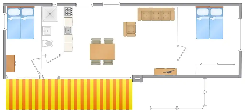 Le bungalow de vacances pour 4 personnes est joliment meublé et dispose de deux chambres avec d'excellents lits pour 4 personnes. Une magnifique chambre parentale (plus de 20m2) avec coiffeuse et placards intégrés, et une chambre d'enfant cosy. La salle de bain dispose d'un lavabo spacieux, d'une grande douche (90x110cm), d'un chauffage au sol et d'un sèche-serviettes.