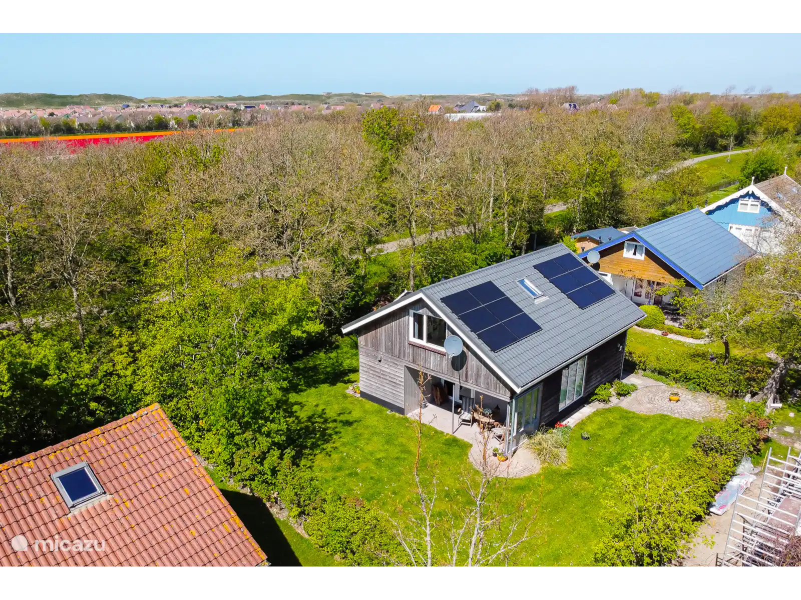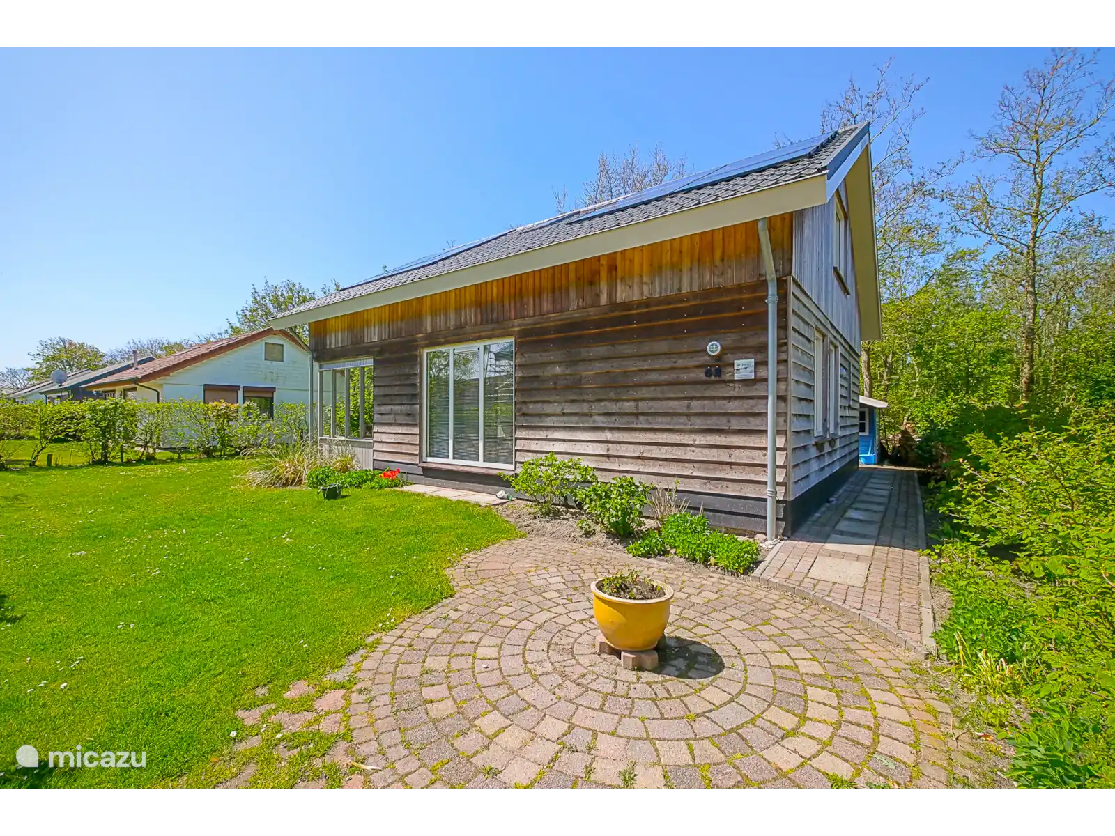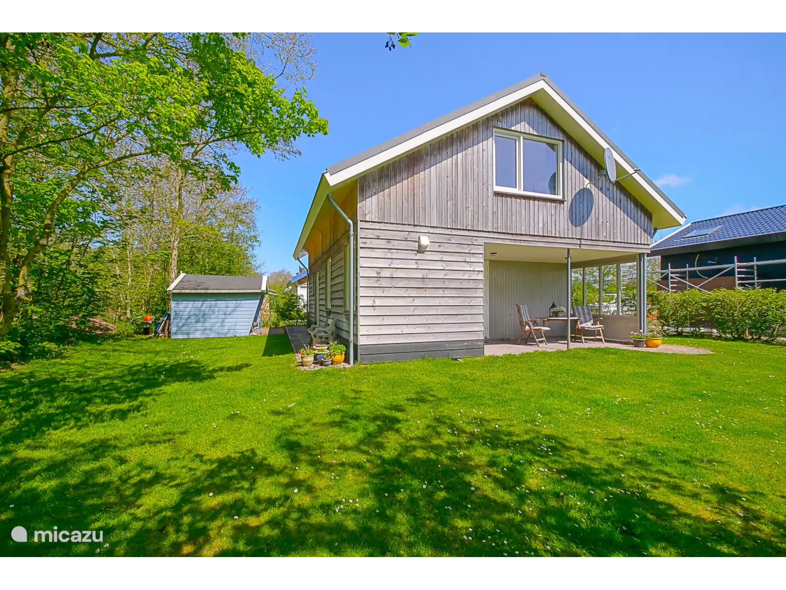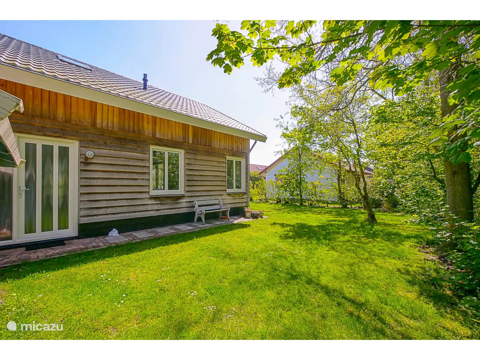 Autour de la maison de vacances se trouve un grand jardin vert avec une terrasse où l’on peut profiter pleinement de l’extérieur. C’est un endroit agréable pour commencer la journée avec un petit-déjeuner au soleil ou pour se détendre tranquillement avec un verre le soir tout en terminant la journée.