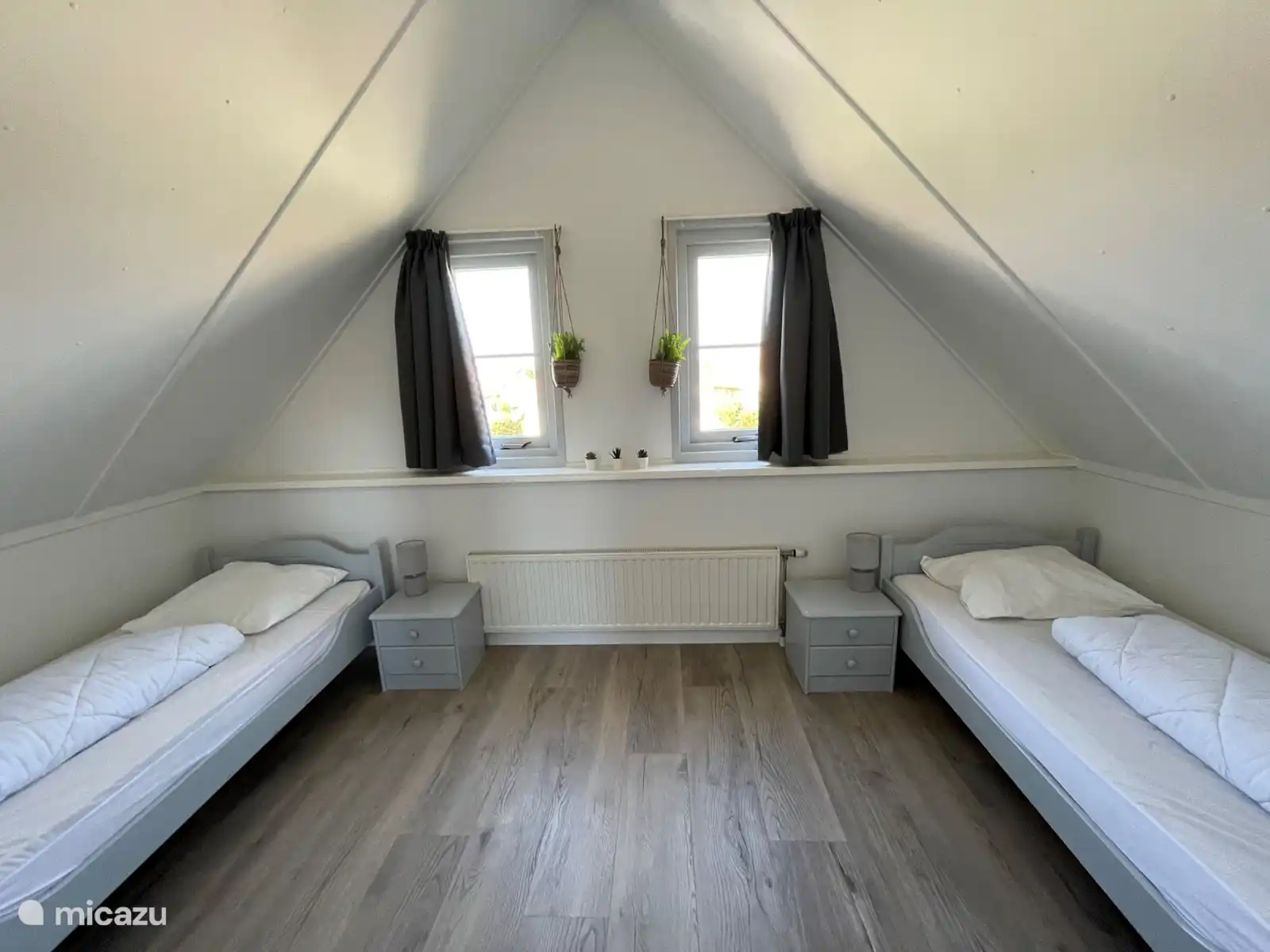 Au premier étage se trouvent 2 chambres et un 2ème WC supplémentaire. La première chambre dispose d’un lit double (2,10 m de long) avec 2 matelas séparés et la deuxième chambre dispose de 2 lits simples.