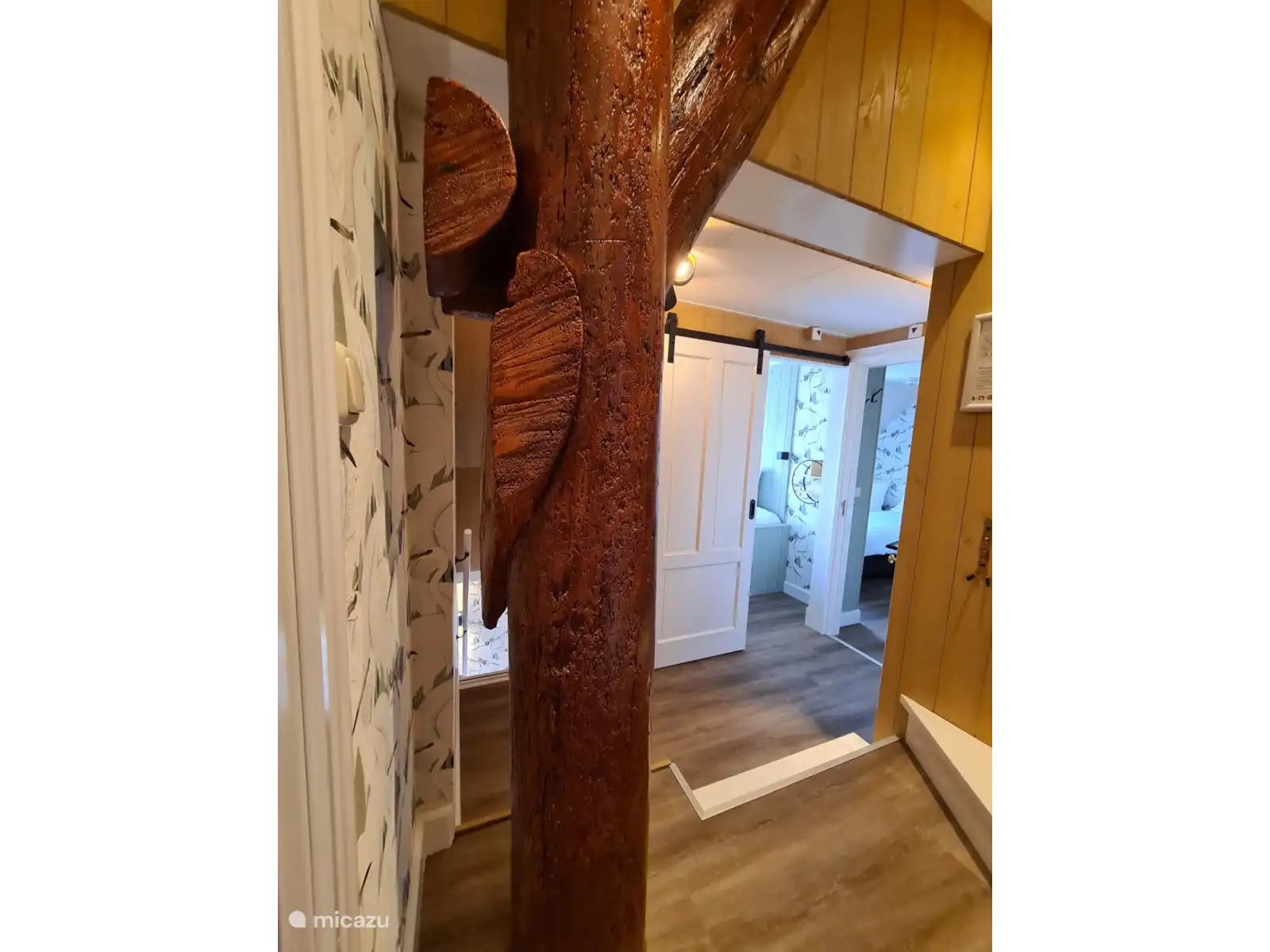À l’étage se trouve une grande salle familiale pour quatre personnes, séparée par une cloison, avec sommiers. Il y a aussi une chambre avec un grand lit litière et une troisième chambre pour deux personnes avec salle de bain attenante.